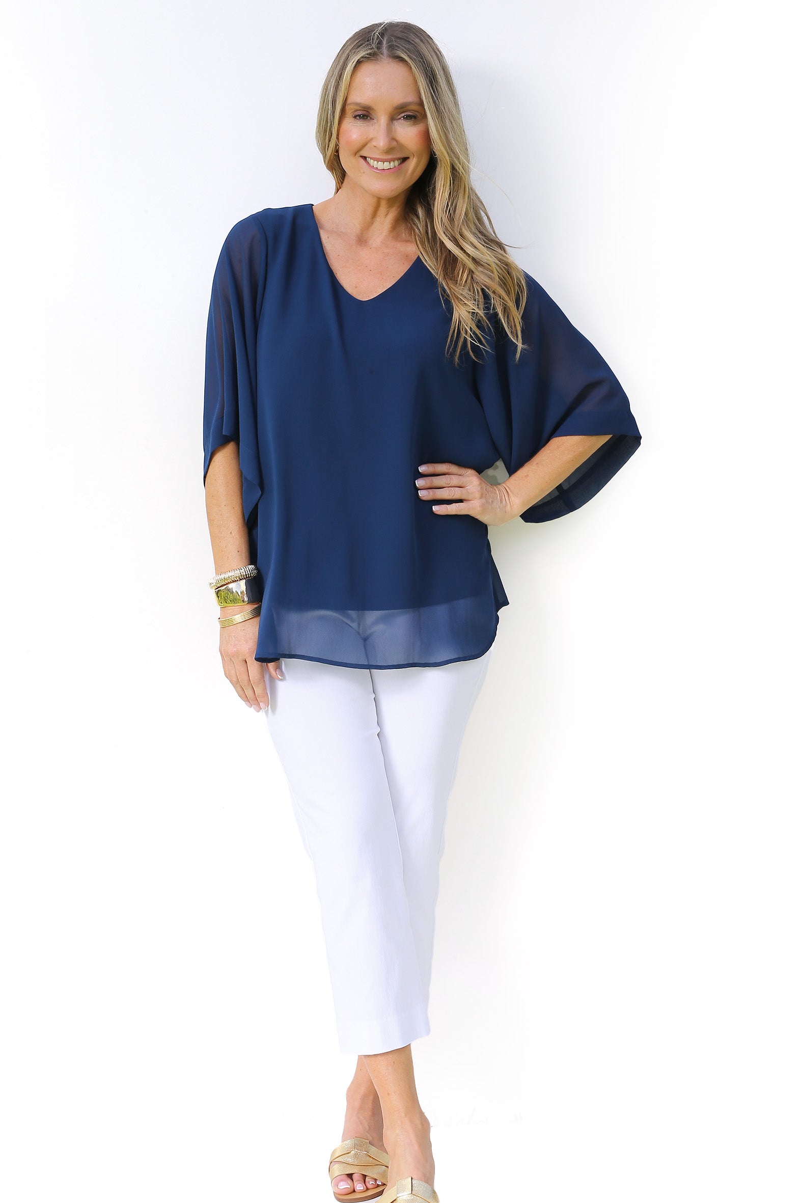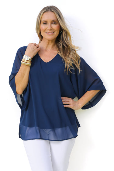 Effortlessly elegant, our navy overlay blouse is the perfect piece to elevate your look. Crafted from light weight chiffon it features a flattering layered silhouette with a V shape neckline and fluid elbow length sleeves that drape beautifully over the arms. The side splits at the hemline enhance the soft flow through the body while the stretch jersey tank underneath ensures a comfortable and flattering fit. Pair with slimline pants for a timeless, sophisticated look that works seamlessly from drinks to dinner.