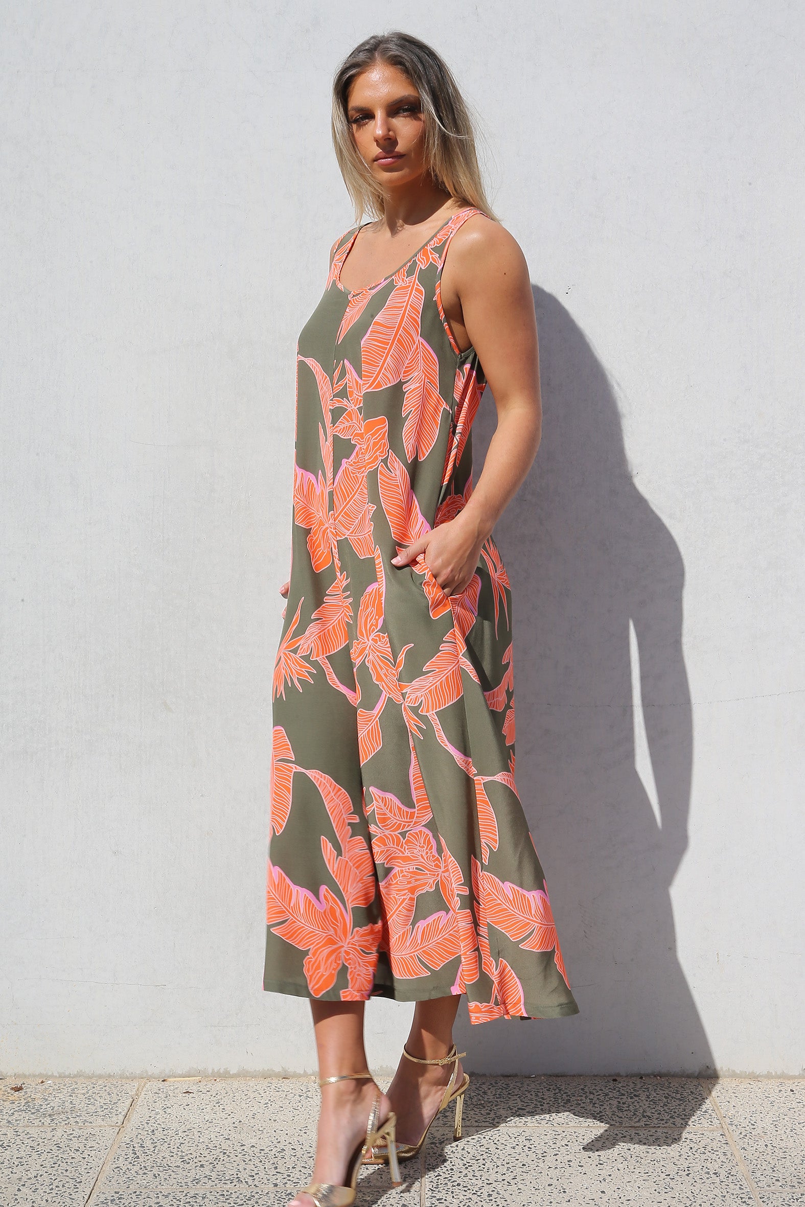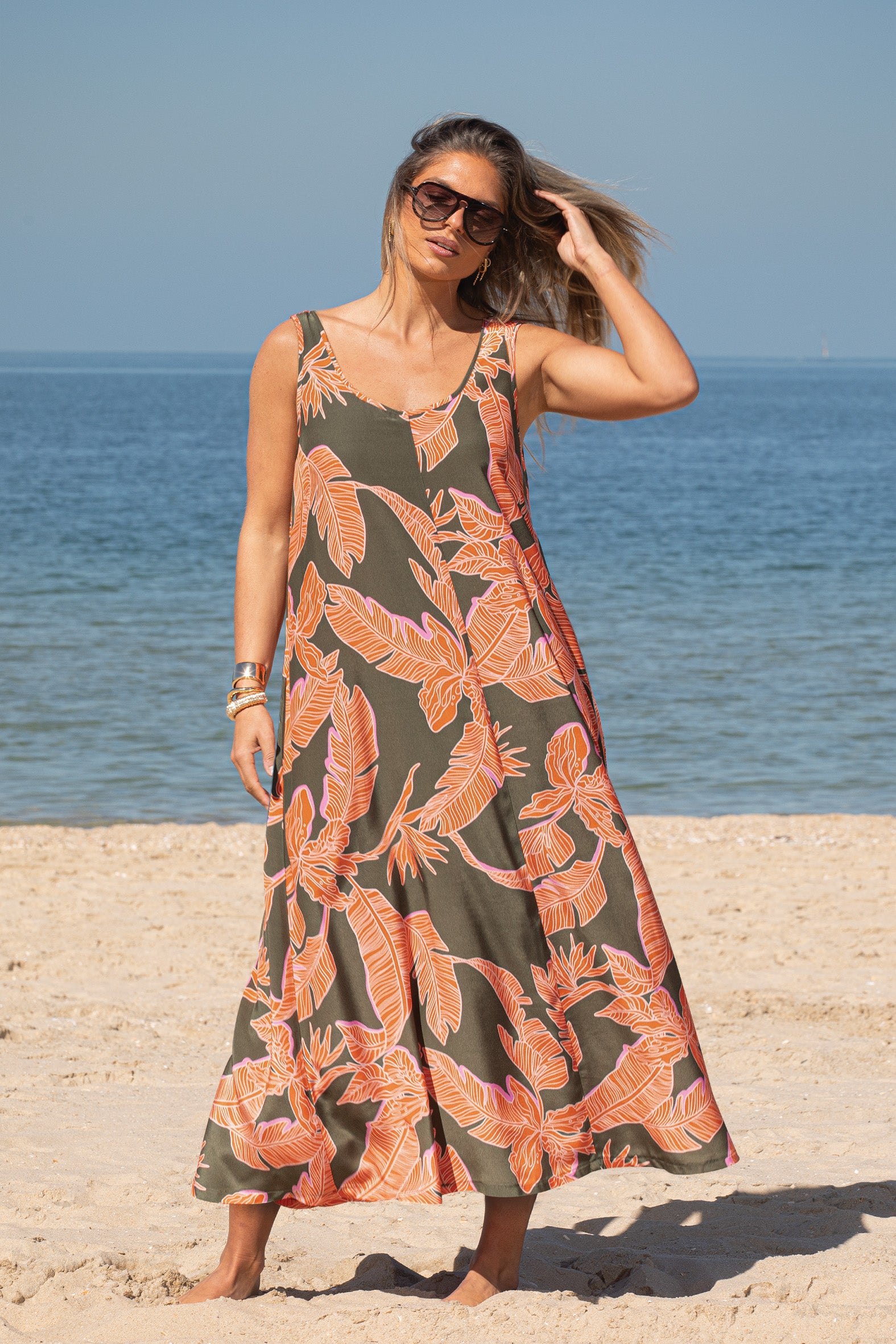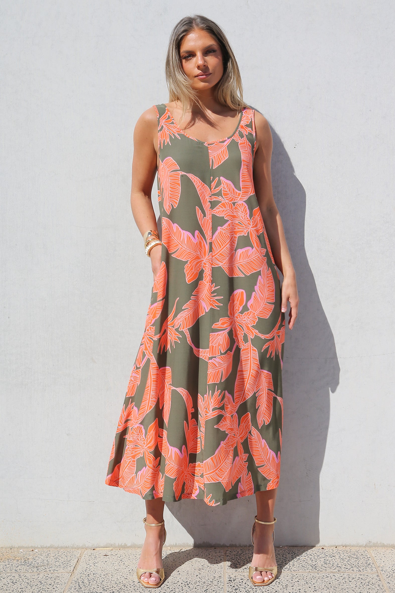 Effortlessly elegant and flattering this sleeveless maxi dress is crafted from softly draping, silk touch EcoVero rayon -- a breathable, eco-conscious woven fabric perfect for summer wear. The fabric features a striking print design in shades of orange on a rich khaki background. Designed with a scooped neckline at both front and back it combined ease and sophistication. Four flared panels create graceful movement and fluidity towards the hemline, enhancing the feminine silhouette. An optional tie belt adds to the versatility of this timeless dress making it the perfect piece for warm weather days and dressed up evenings.