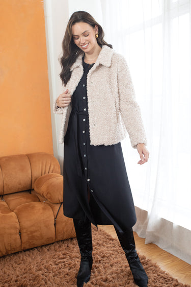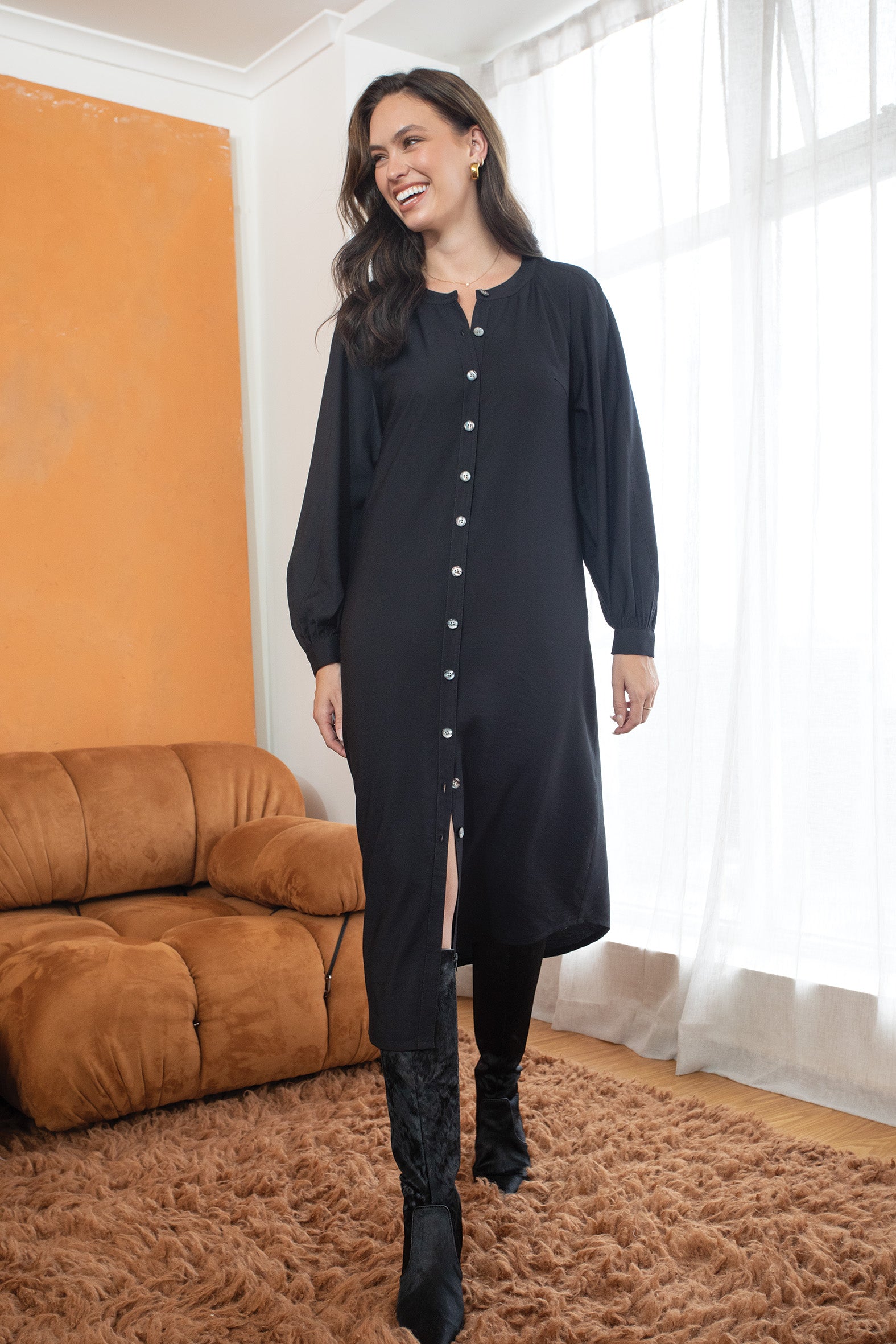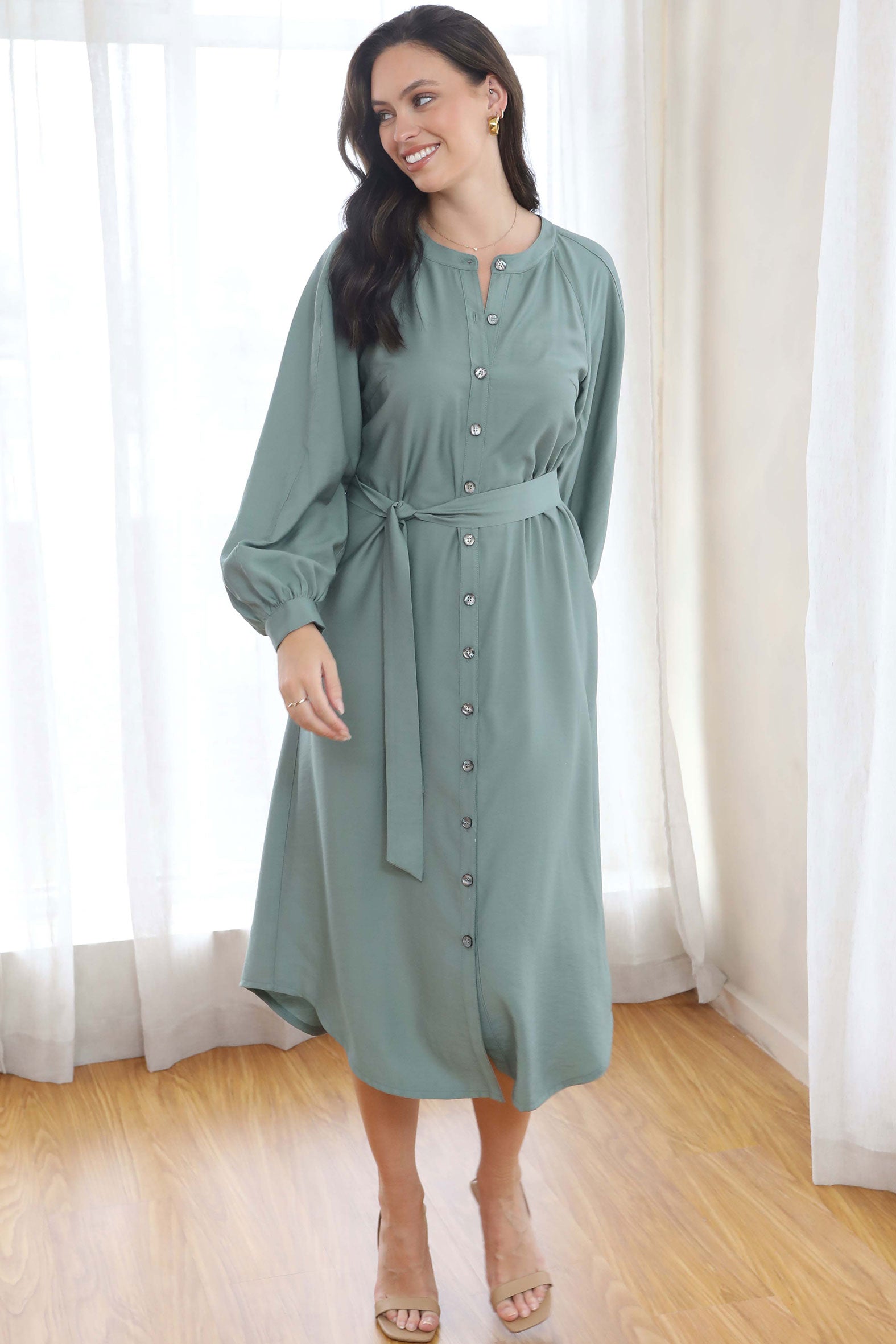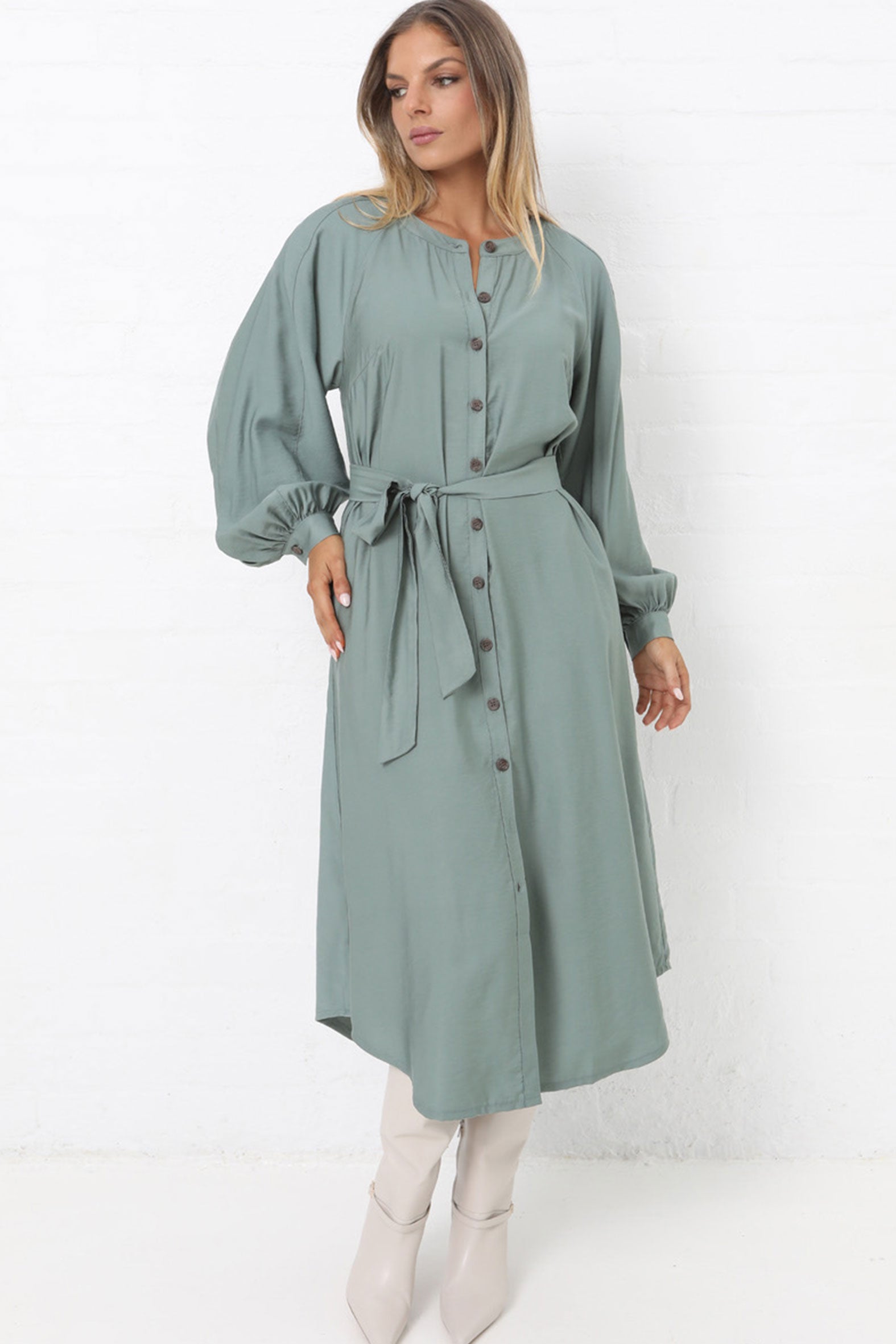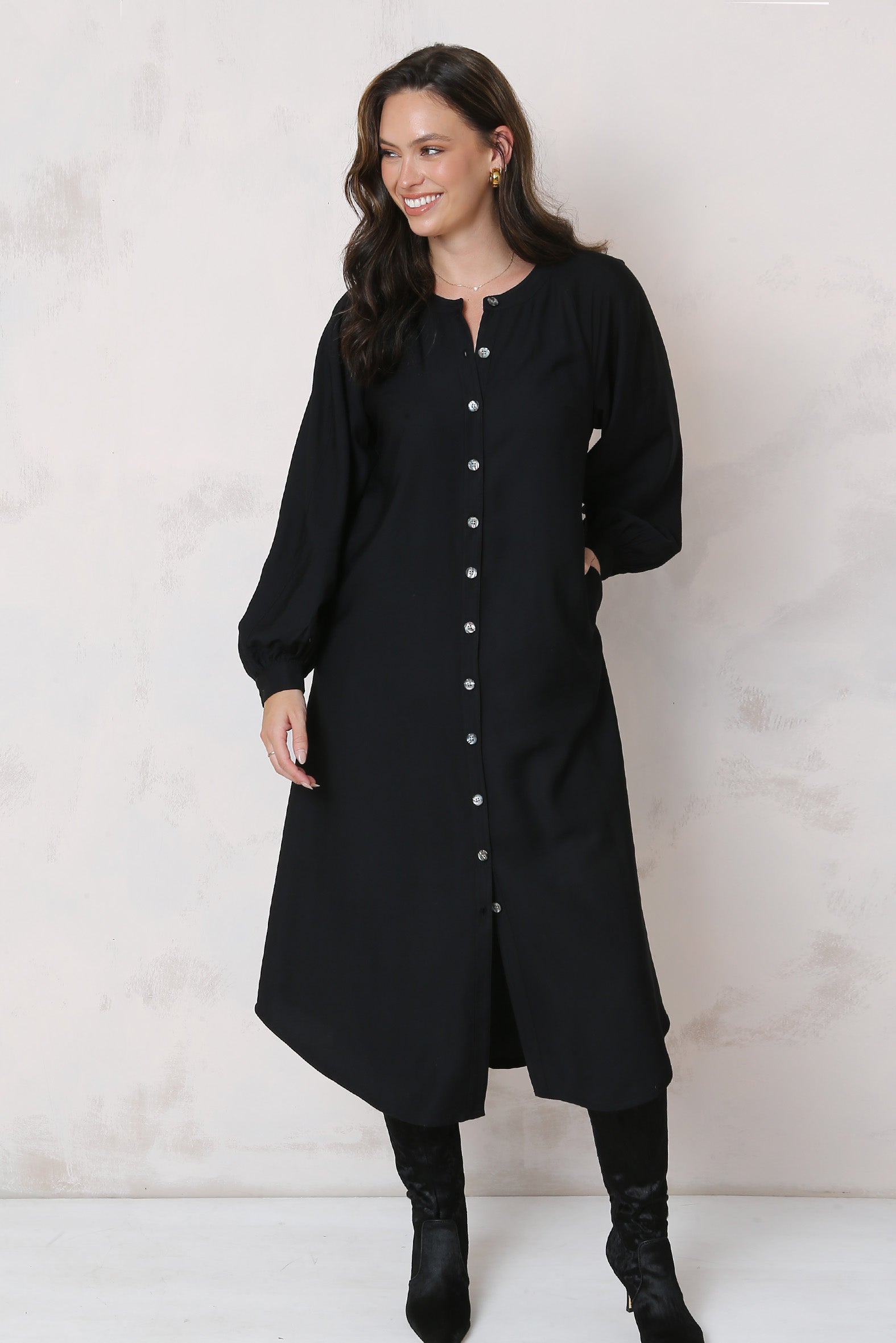 This effortlessly elegant button-though maxi dress is a versatile piece crafted from a rayon/nylon woven twill fabric. The soft drape of the fabric, combined with the top stitched long sleeve design, offers a relaxed yet flattering fit while the button through front adds a classic touch. An optional tie belt allows you to cinch the waist for a more defined silhouette or leave the dress loose for a laid-back, flowing look. The maxi length makes it perfect for layering or wearing alone, paired with a heel, flat or boot – and transitions effortlessly from cooler to warmer months.