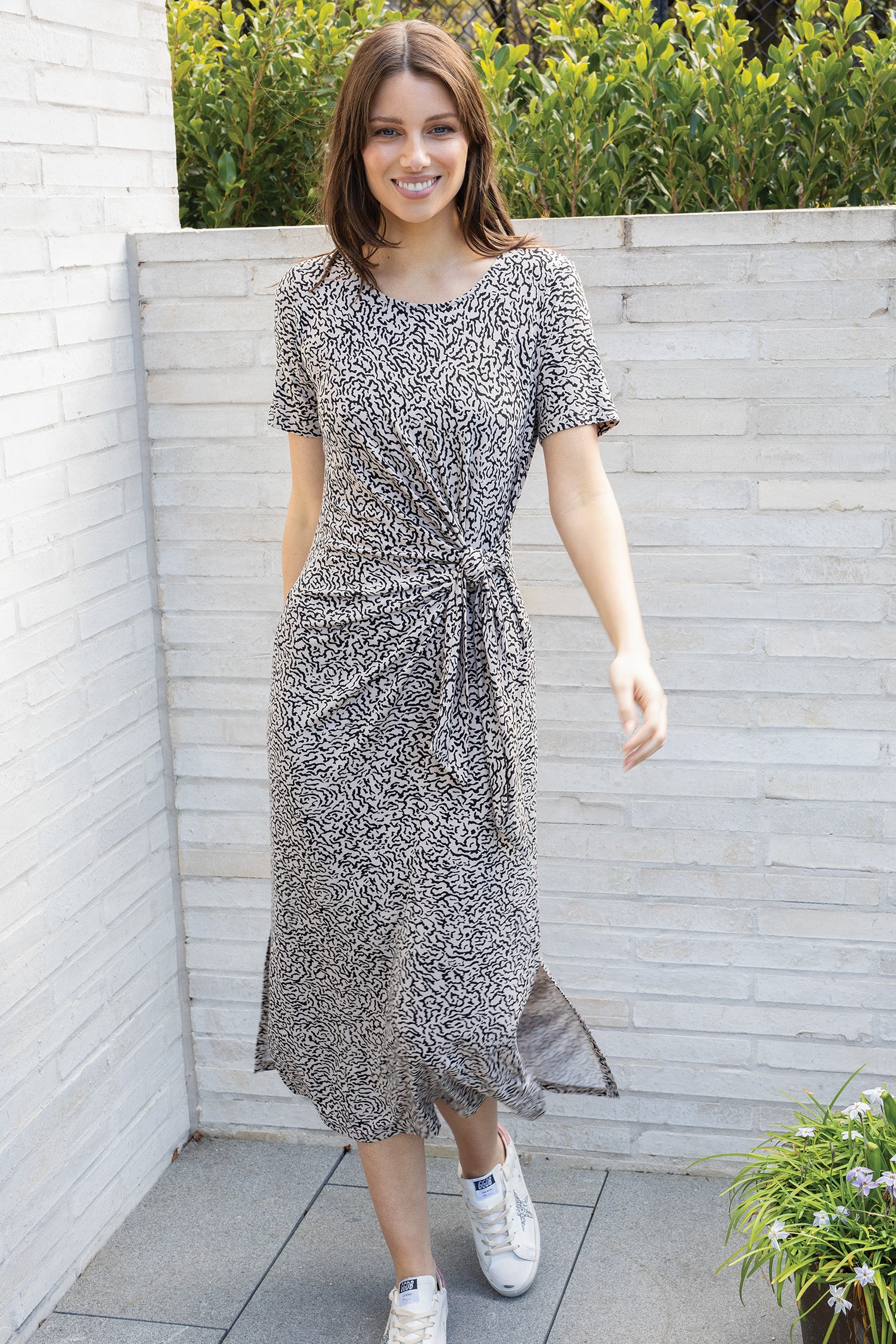 This stylish midi dress is made from sustainable EcoVero rayon single jersey knit with elastane, offering a soft, comfortable fit that moves with you. Short sleeves add a chic touch and side seam splits provide ease of movement. The tie feature at the waist allows for a customizable fit, adding a flattering finish to this eco-conscious statement piece, perfect for day-to-night styling.