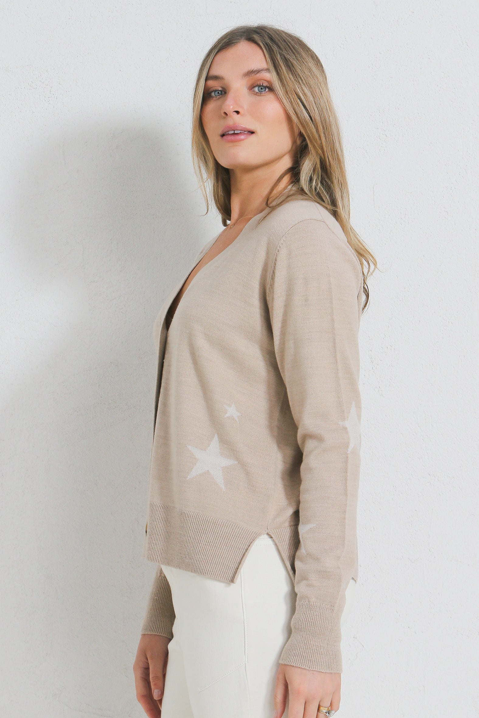 Reach for this merino wool blend, fine gauge fully fashioned cardigan to add a touch of effortless style to your wardrobe. Knitted in a relaxed fit with contrast colour intarsia star motifs, it features a front button fastening from a flattering V shape neckline. Soft to the touch, warm and comfortable, wear it open over a tank or dress or button through and wear it jumper style.
