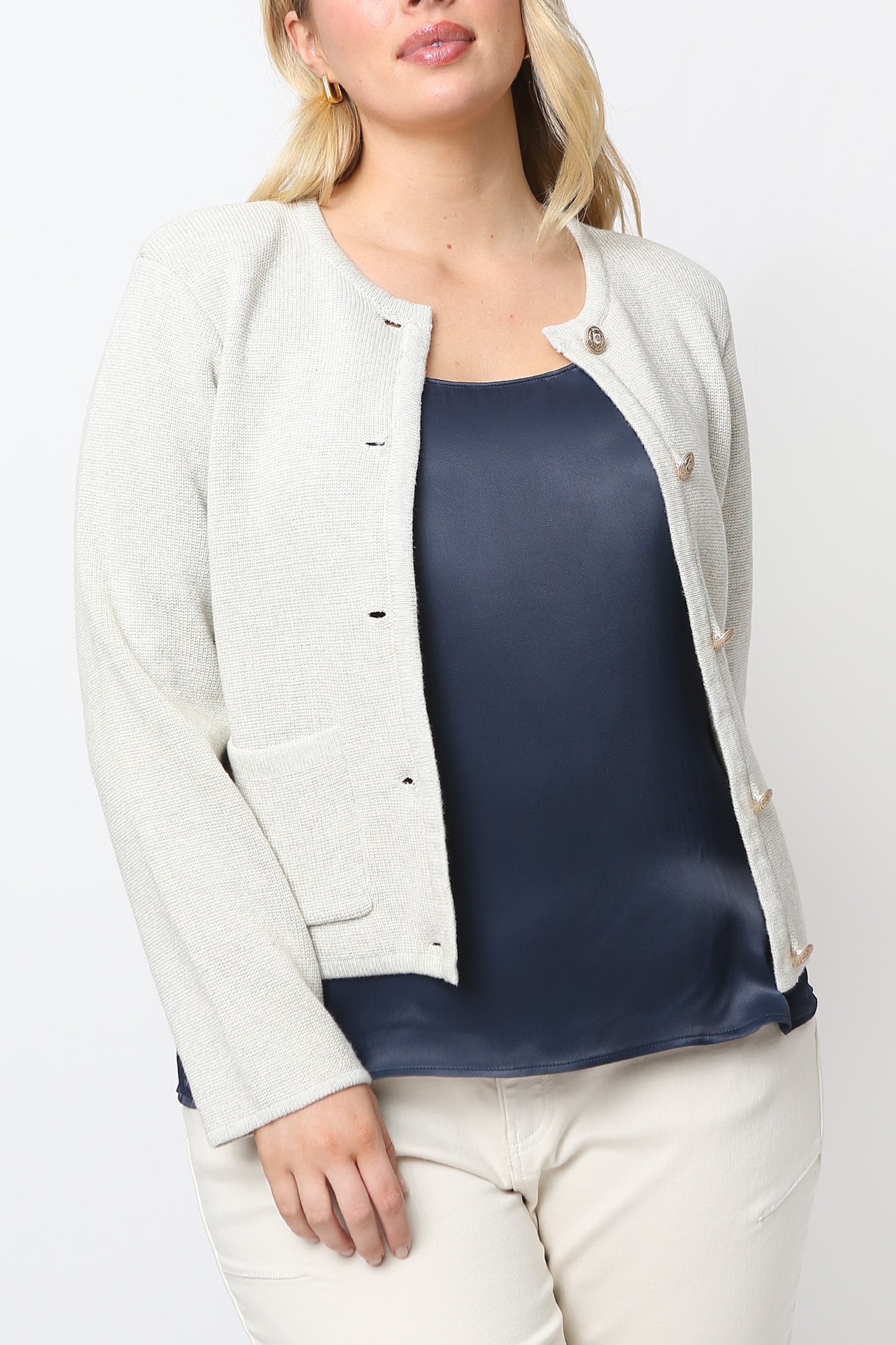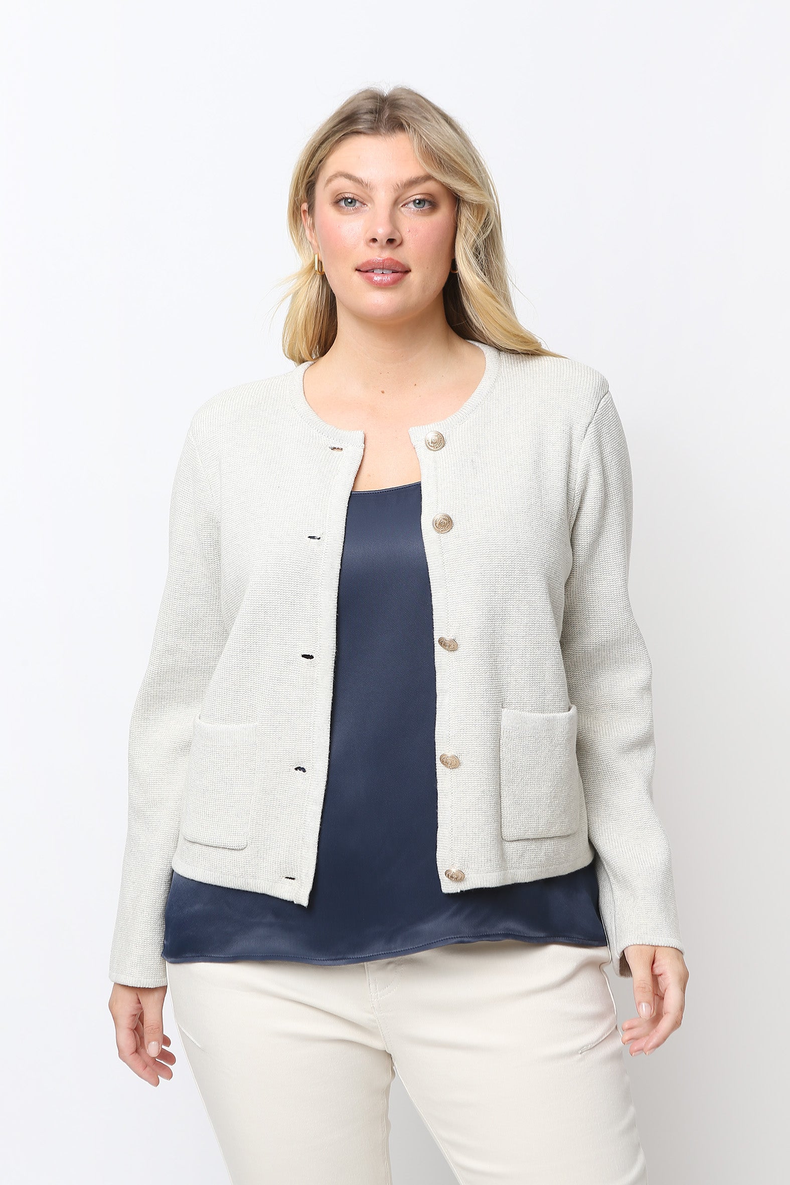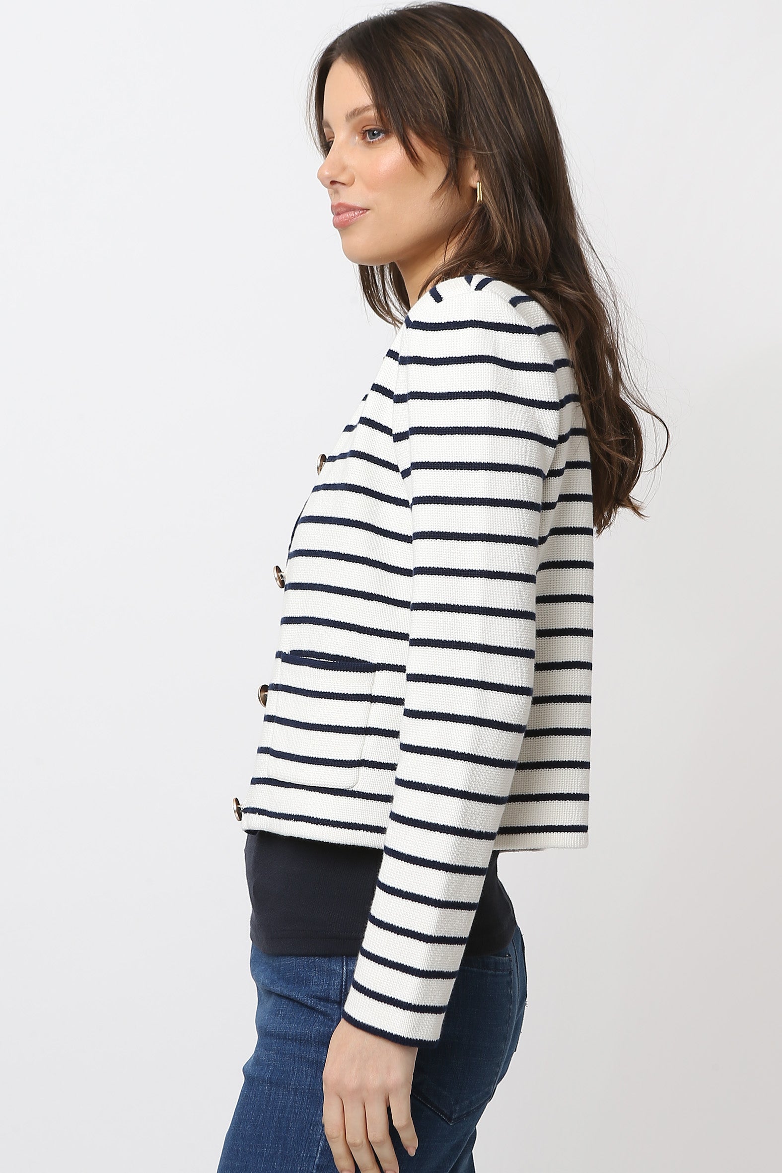 Chic, French inspired, jacket-style cardigan is crafted from breathable cotton rib knit offering a blend of luxury and comfort. Perfect for layering, the cropped silhouette adds a modern touch hitting just beneath the waist, at the high hip, for a flattering fit. The classic button though front fastening is enhanced with gold military style buttons adding elegance and versatility to the look. Bound edges at the front fastening and neckline add a refined finish. Available in a striking navy/ivory stripe with contrast navy binding and classic ivory with colour matching binding, the cardigan is a timeless blend of sophistication and comfort making it a stylish wardrobe must-have.