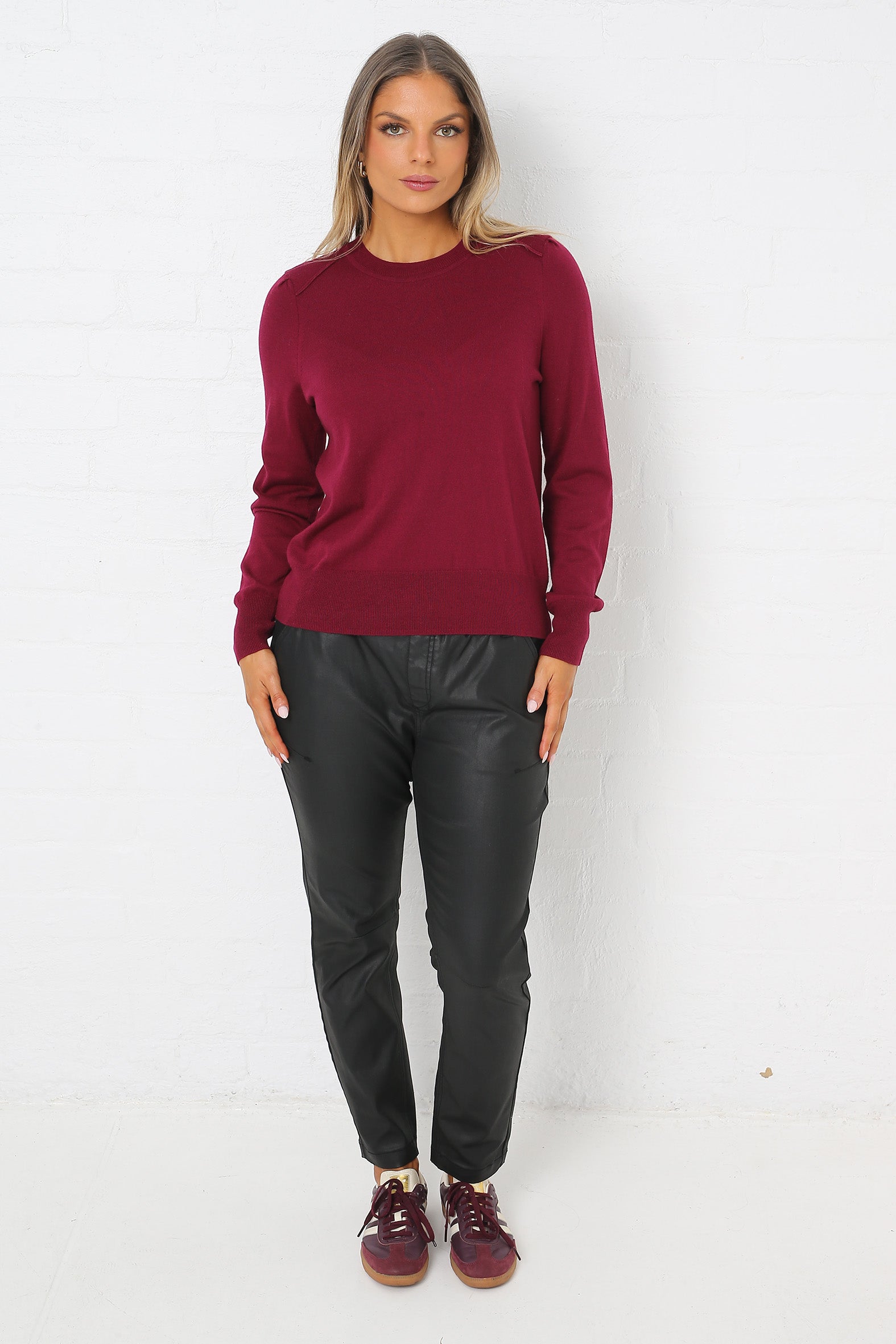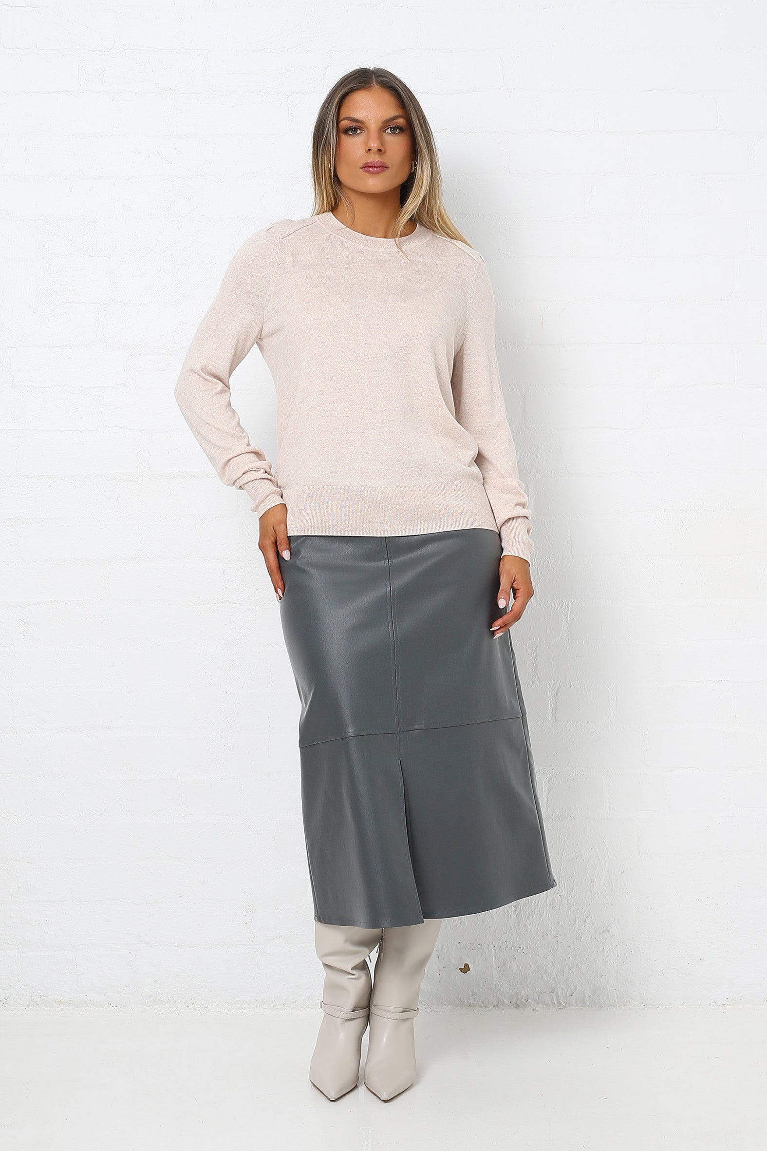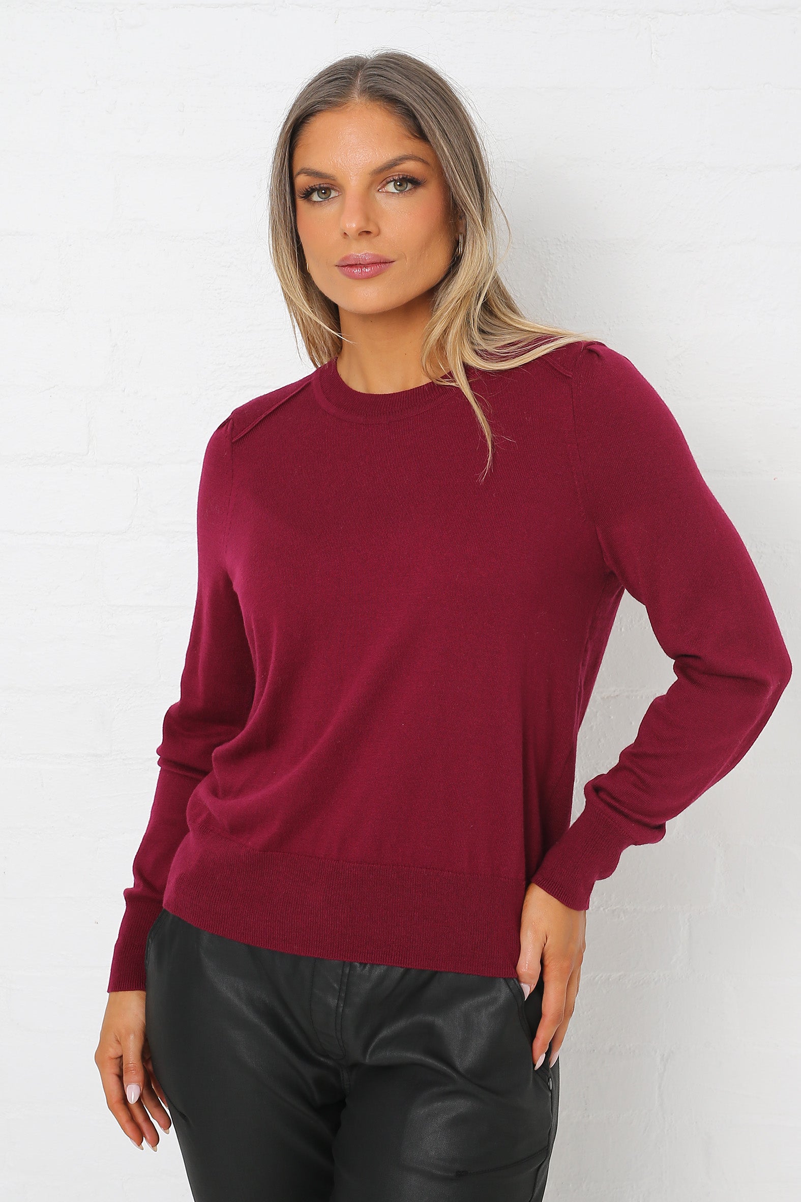 Elevate your everyday with this fully fashioned round-neck jumper, knitted from a featherlight cashmere blend for luxurious softness and warmth. Designed with subtle shoulder tucks, a top-stitched yoke, and rib trims throughout, it offers a feminine silhouette that layers effortlessly or shines on its own