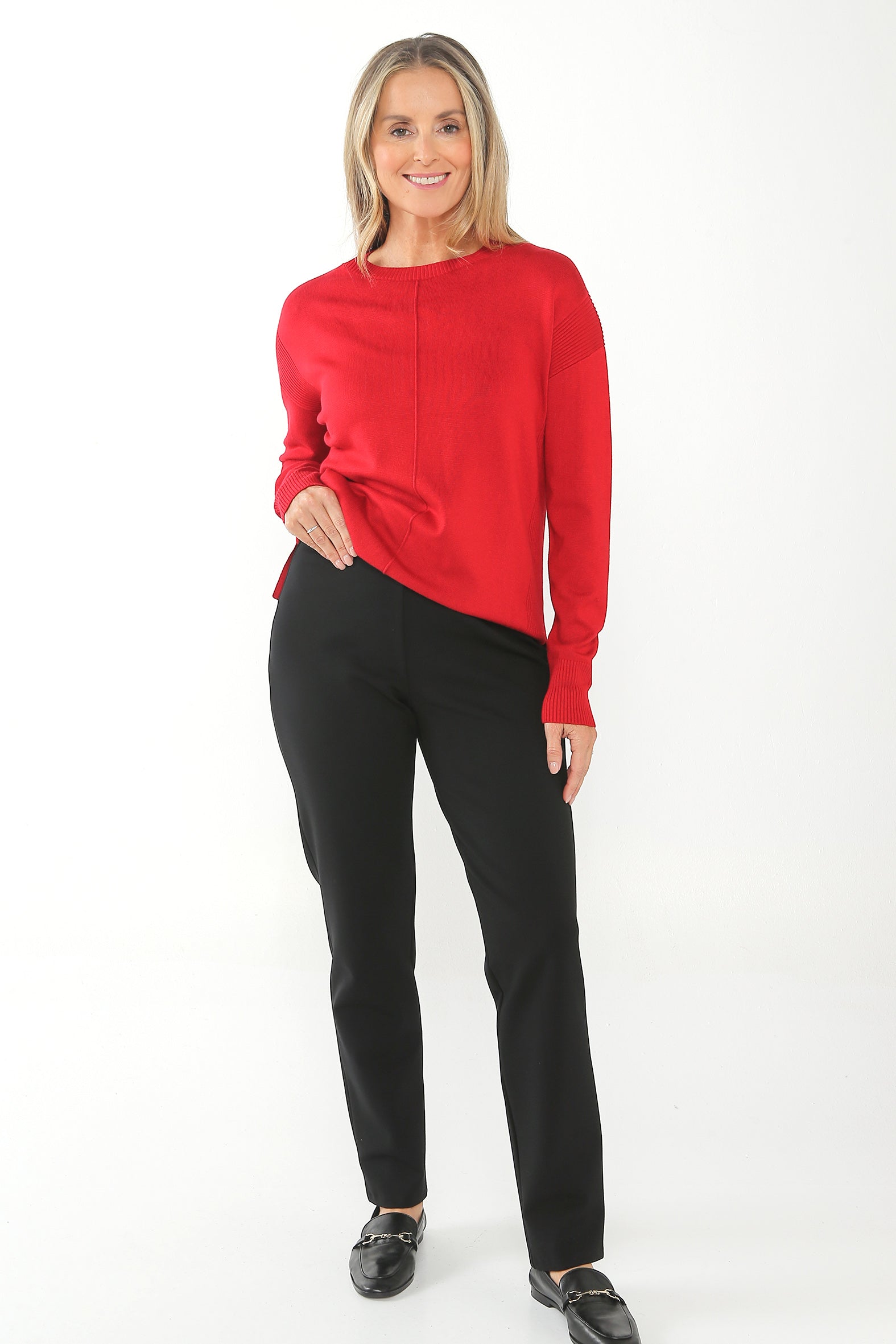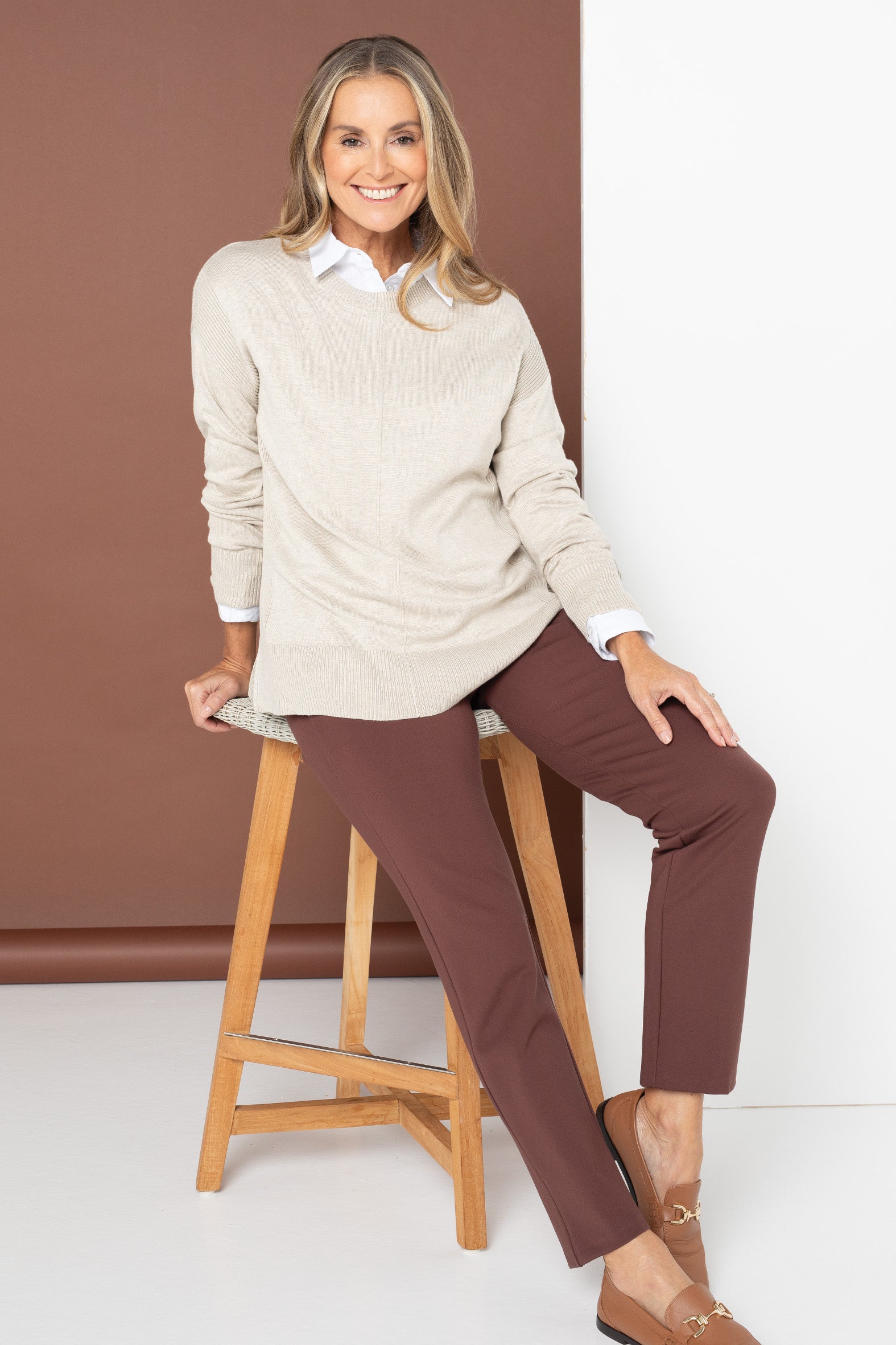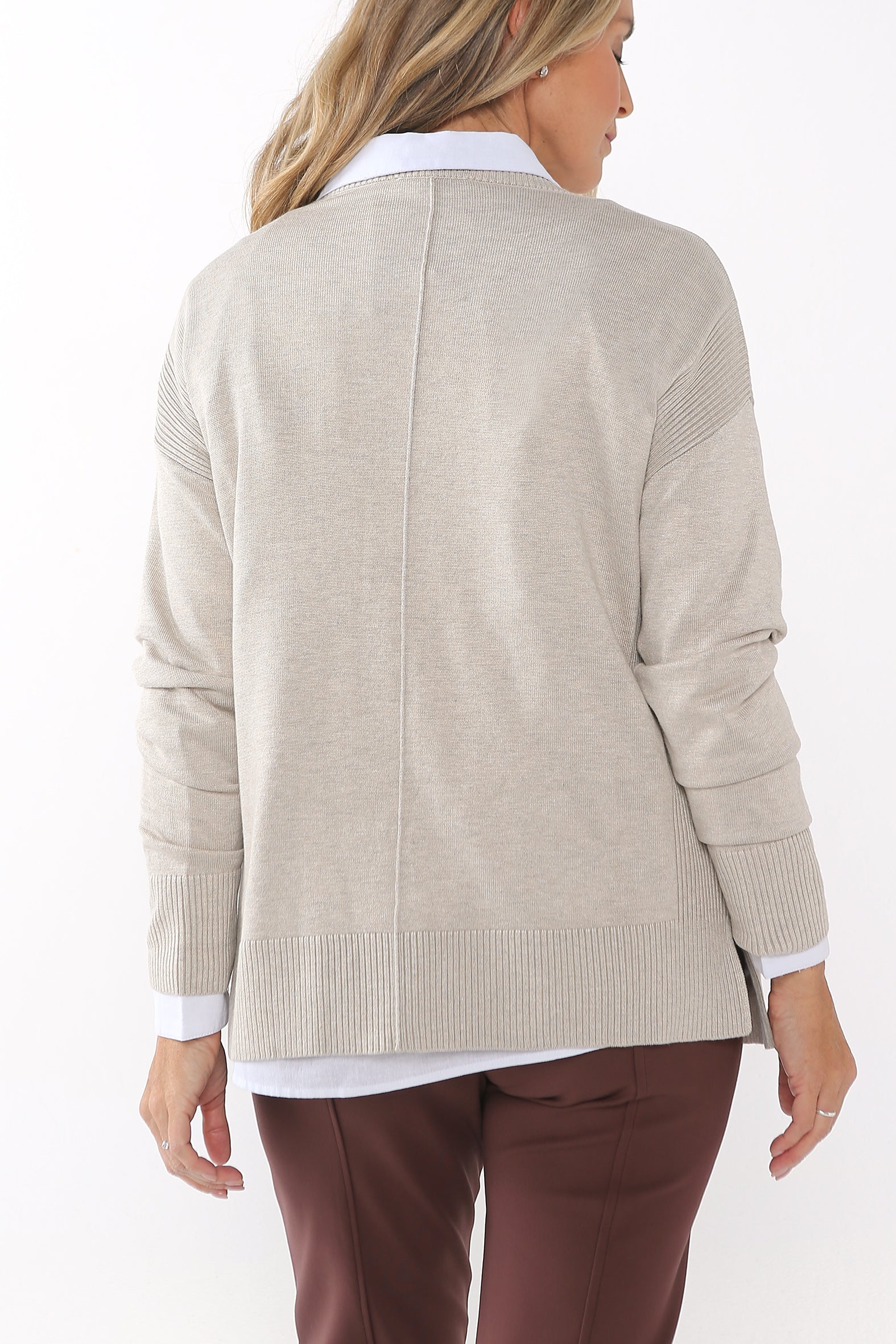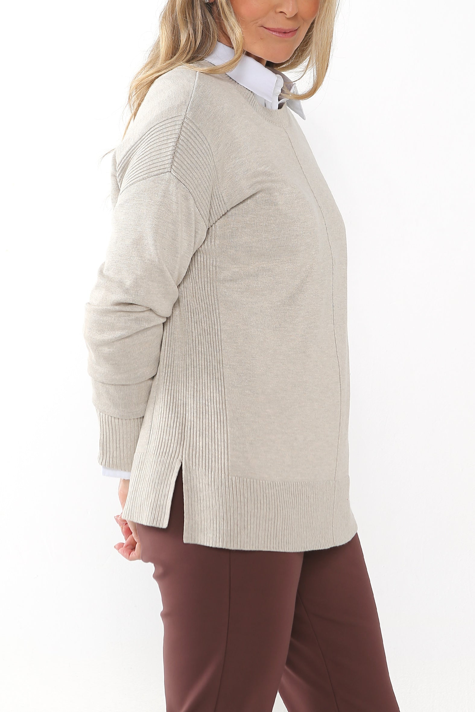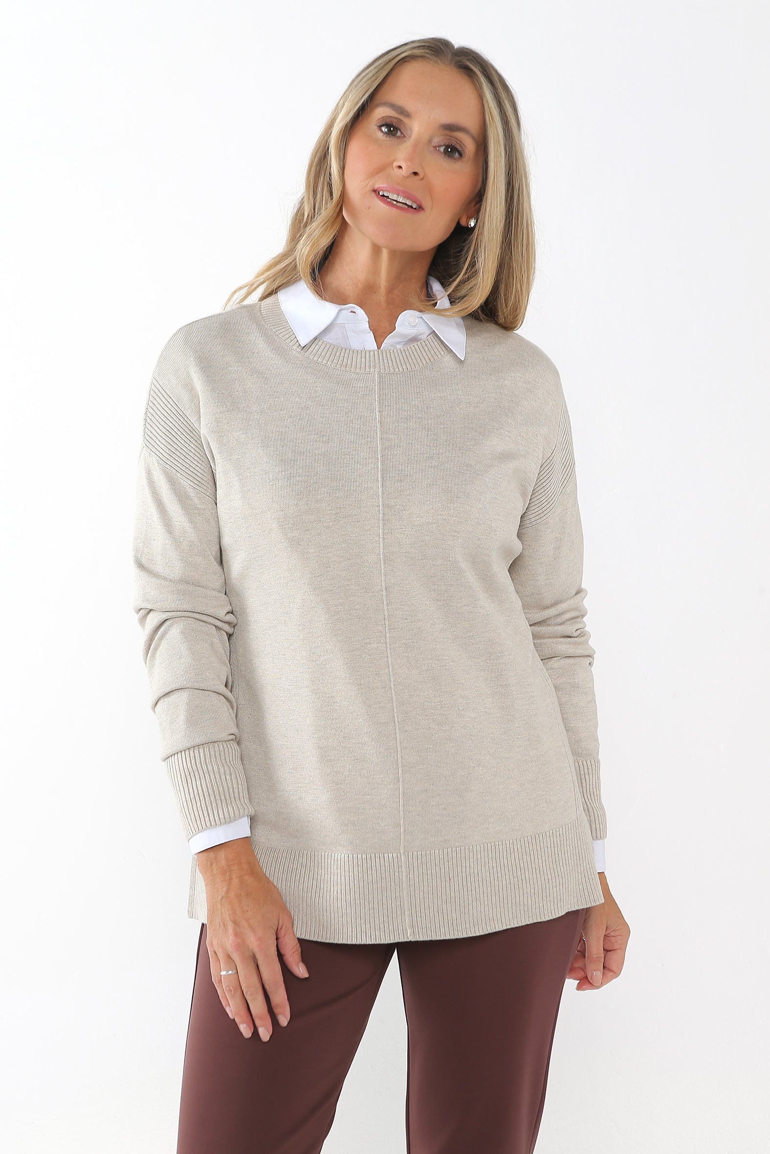 Designed in a relaxed, longer-line fit with an extended shoulder line, this jumper offers effortless style and flattering coverage. Rib trims and mock seam detailing add subtle structure and polish.