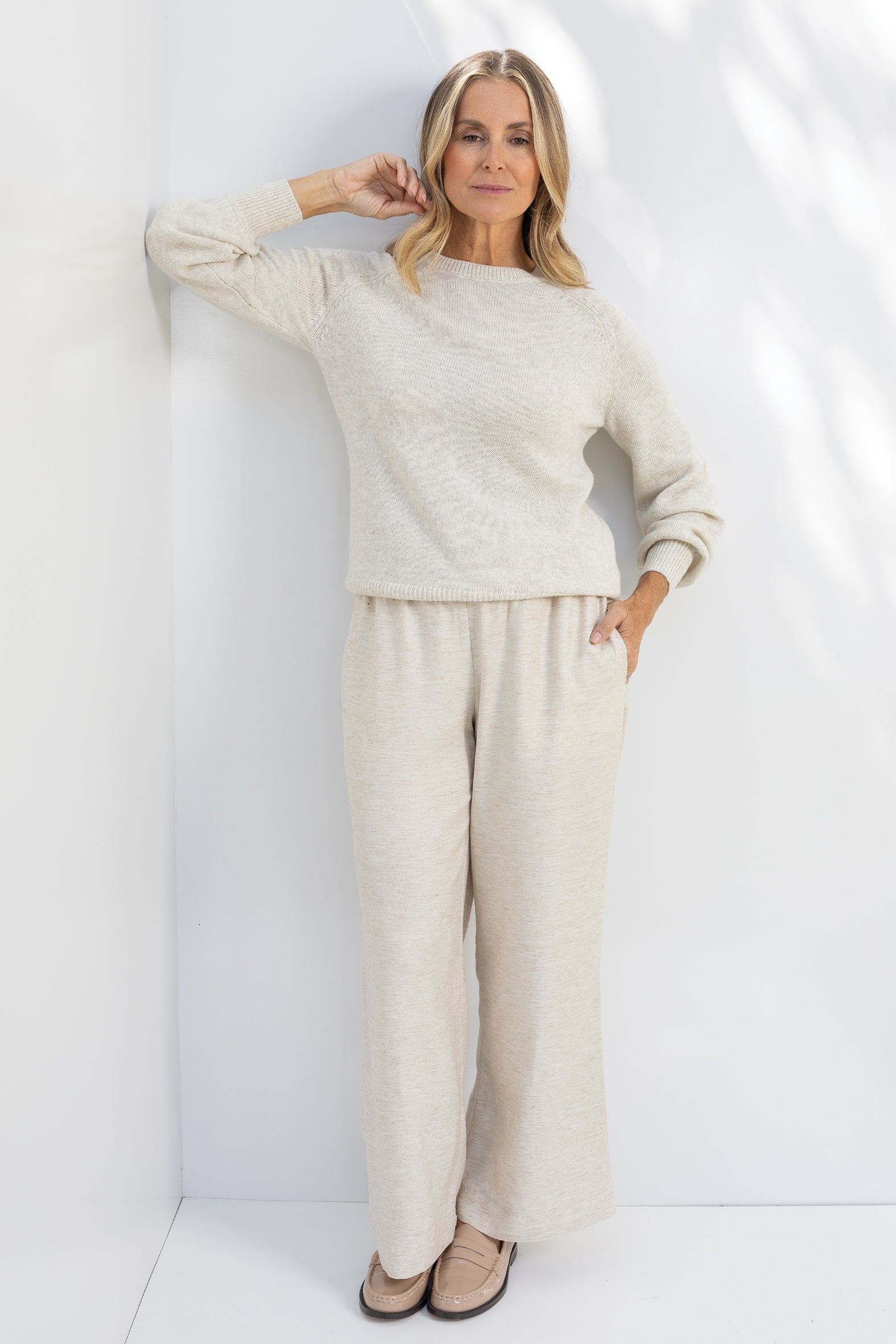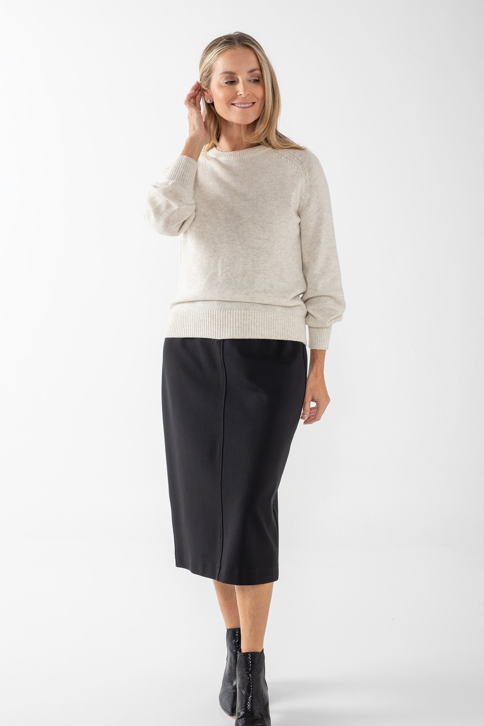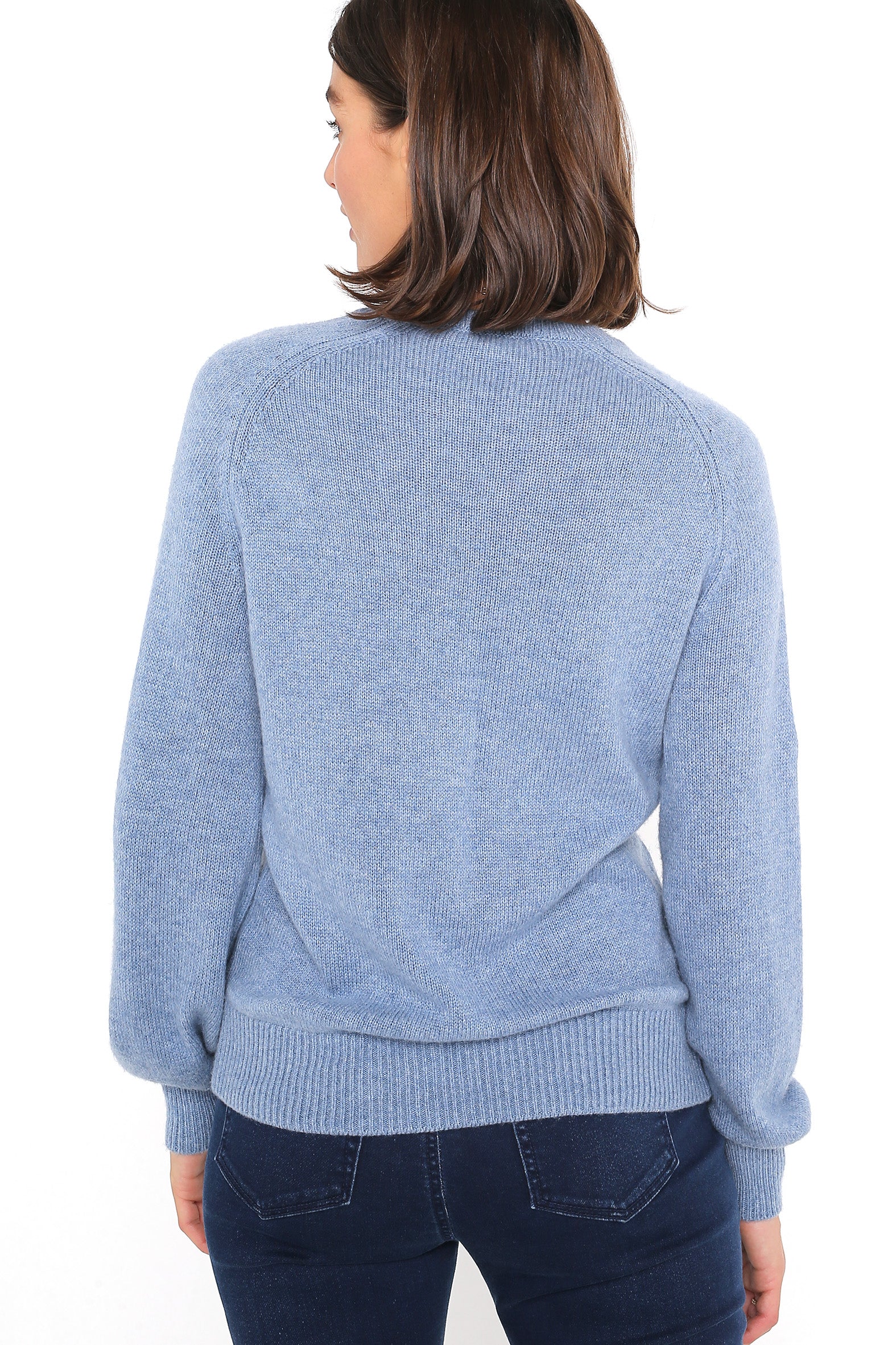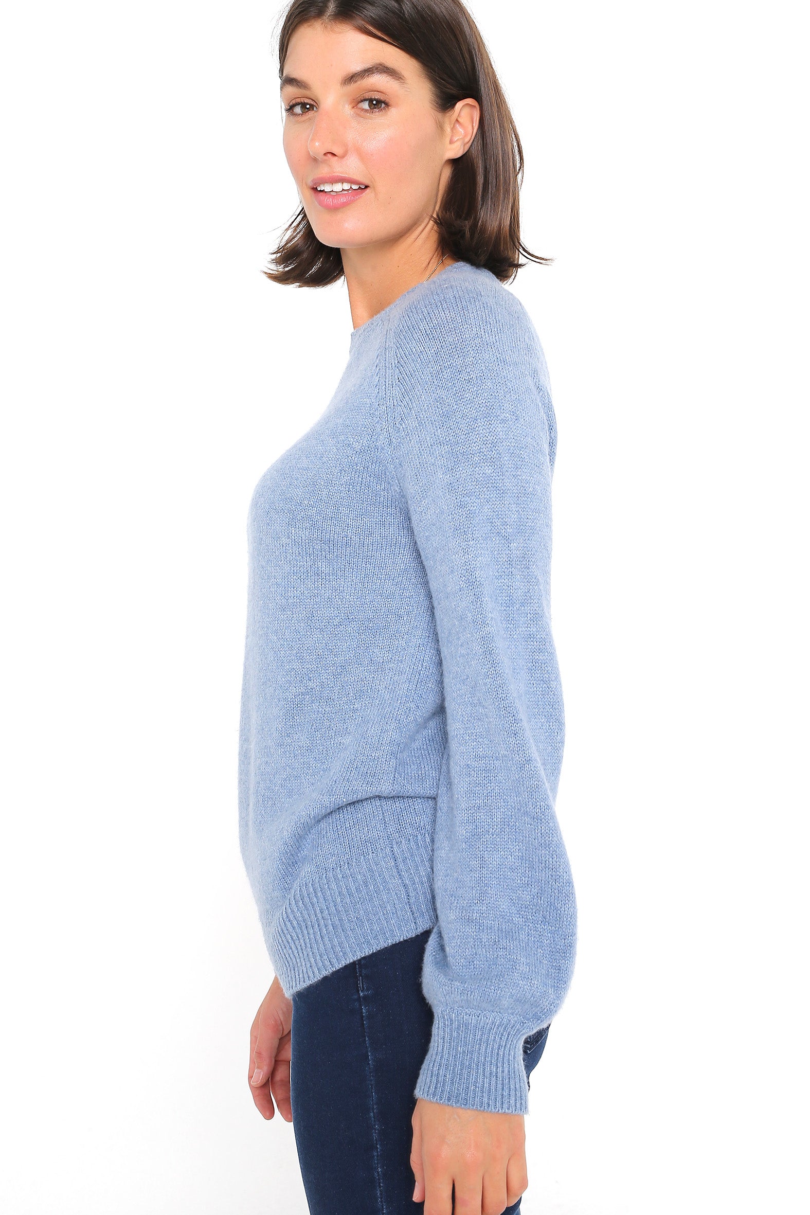 Designed for versatility, our classic, fully fashioned melange knit combines warmth with lightness of weight and elegance. Mixing wool and acrylic with lofty nylon fibres for shape retention, this flattering, easy to wear knit features a flattering crew neckline, feminine blouson raglan sleeves and cosy ribs. The perfect, timeless piece to take you effortlessly through the cooler days of autumn and winter coordinated with pants and jeans – pop on a jacket or scarf for an elevated look.