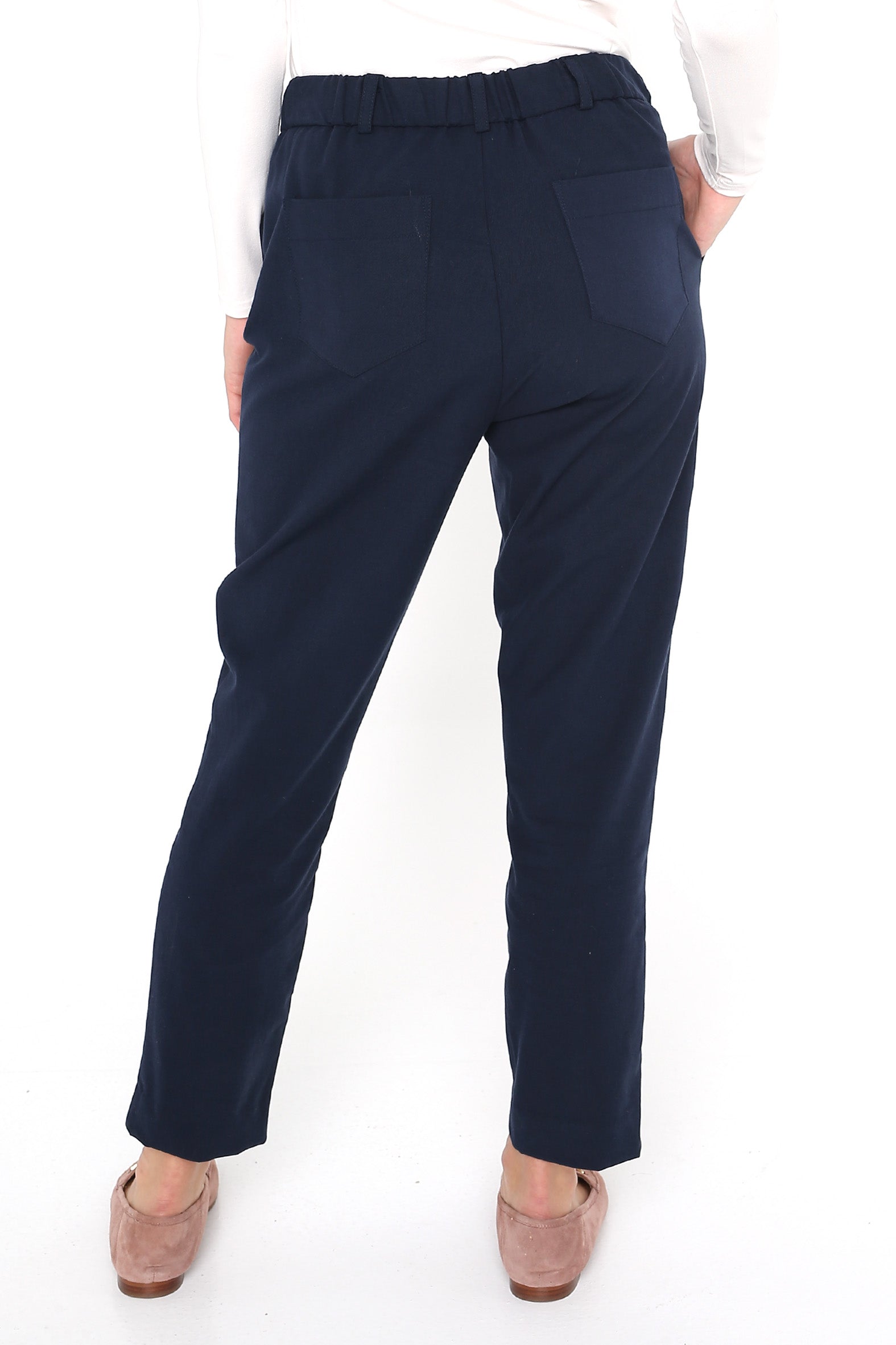 - Tapered leg, ankle-length silhouette