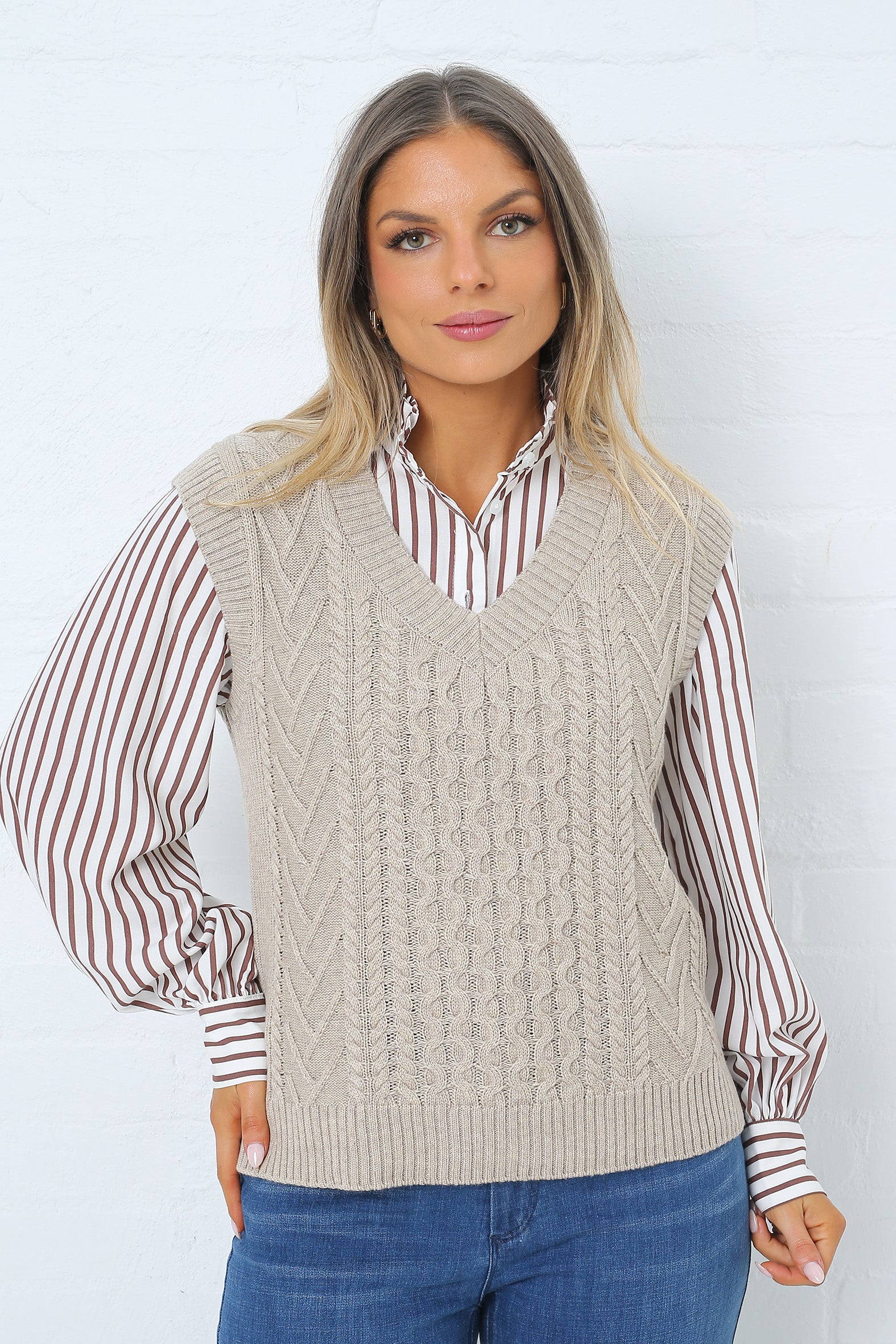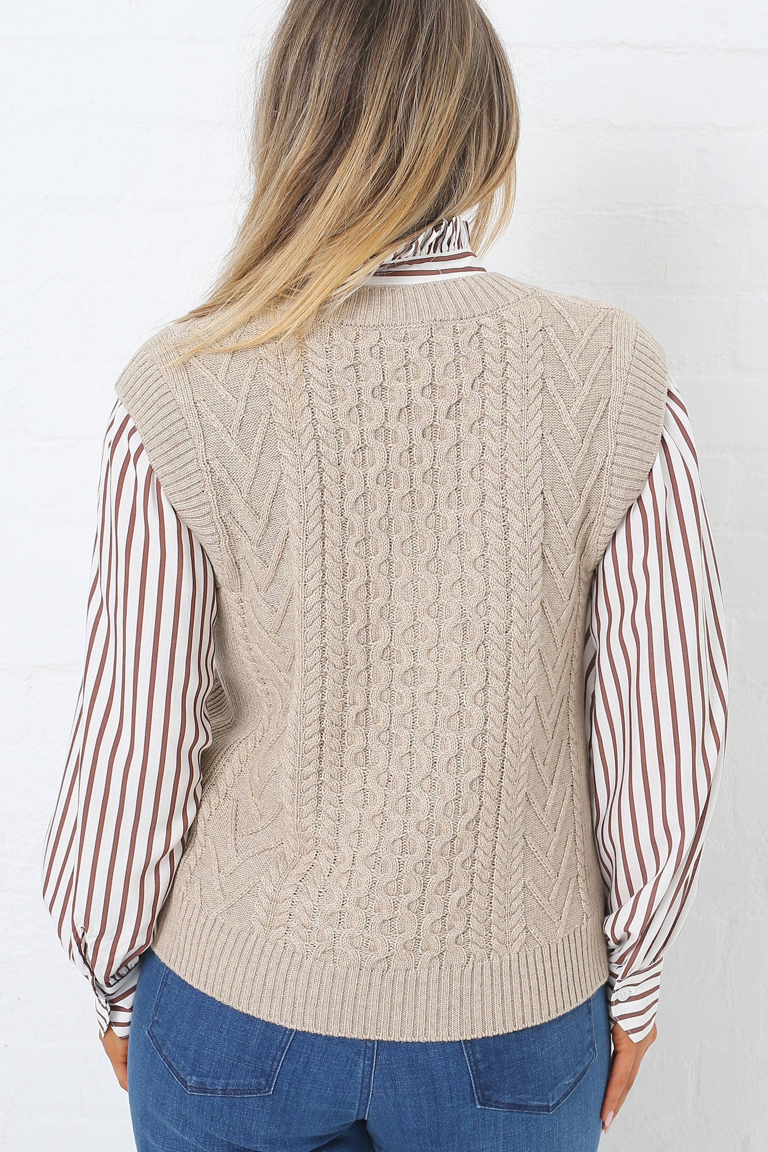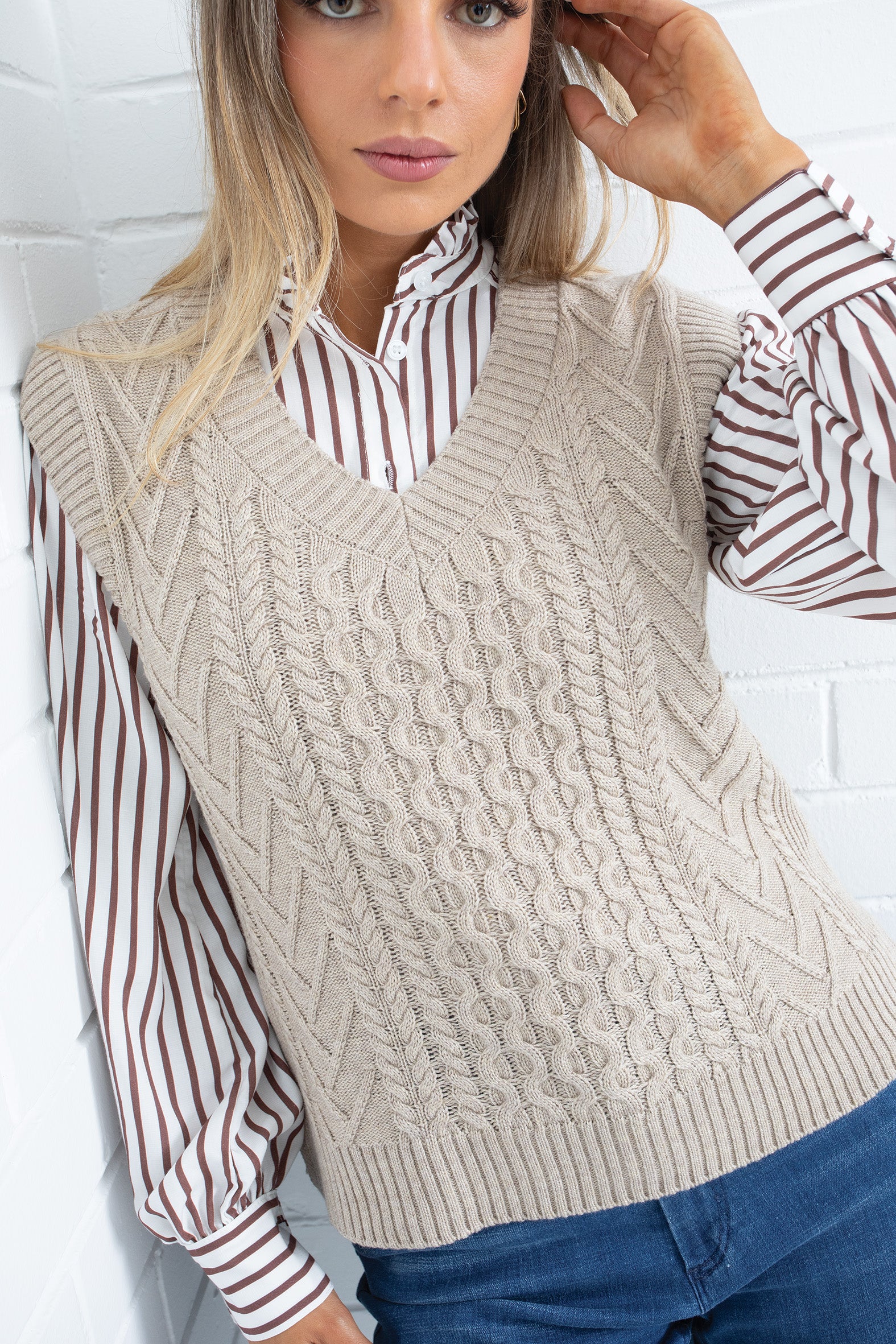Elevate your wardrobe with this chic cable knit sweater vest. Knitted from a cosy wool blend it is soft to the touch, warm and comfortable to wear. Designed in an easy to coordinate neutral tone it features a flattering V shape neckline and ribs on the neck, armholes and hemline, with a detailed rib design on both back and front panels. For a polished, stylish look wear it alone over pants, jeans and skirts or layered over a classic shirt or blouse. A seasonal must-have.