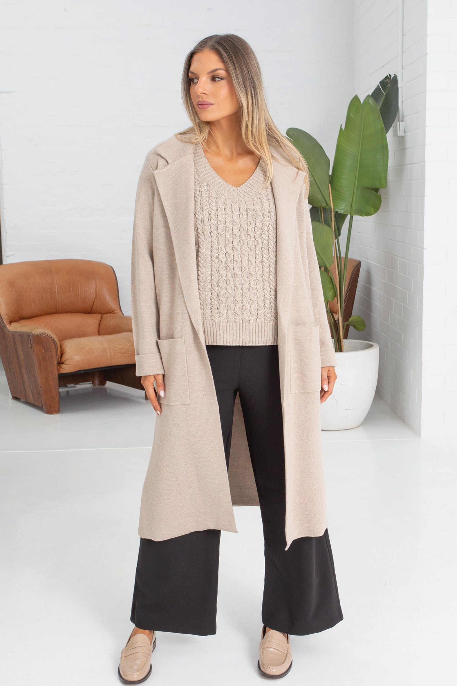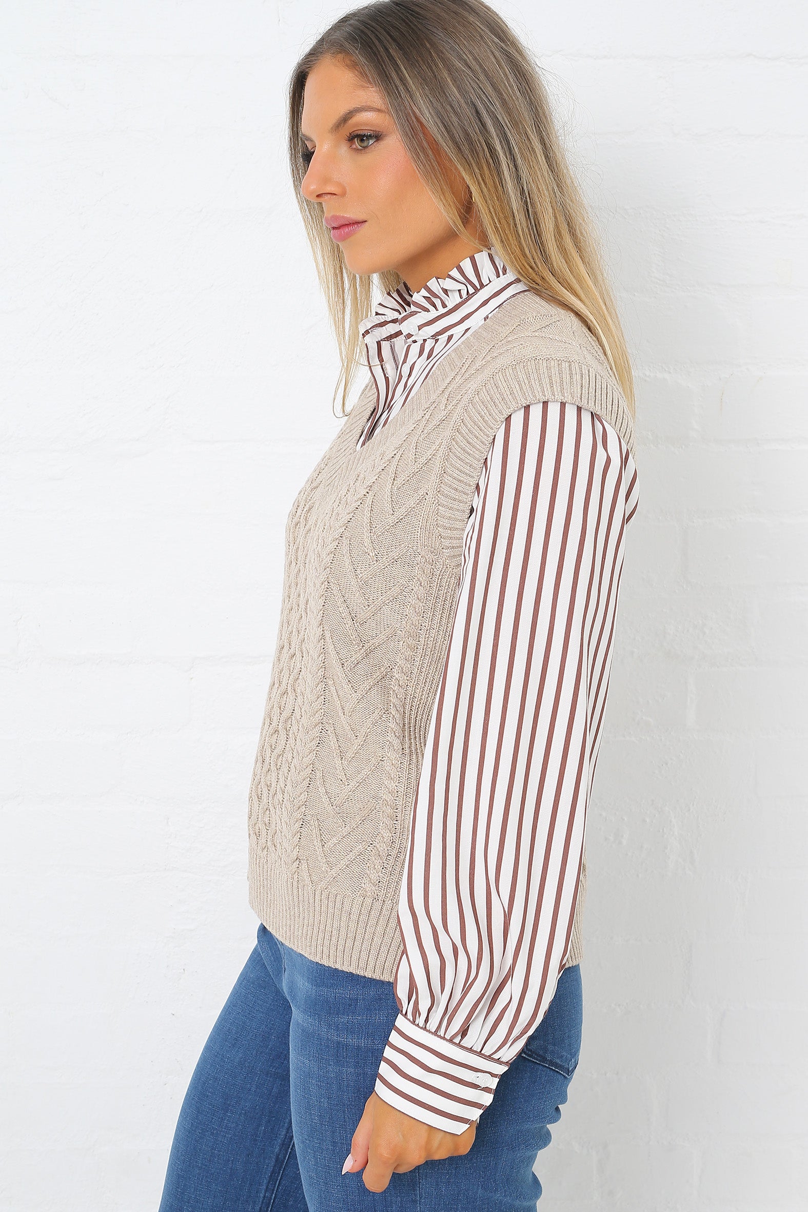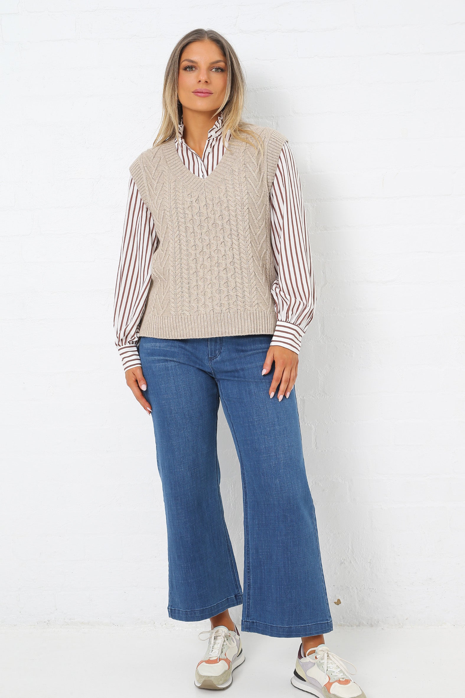 Elevate your wardrobe with this chic cable knit sweater vest. Knitted from a cosy wool blend it is soft to the touch, warm and comfortable to wear. Designed in an easy to coordinate neutral tone it features a flattering V shape neckline and ribs on the neck, armholes and hemline, with a detailed rib design on both back and front panels. For a polished, stylish look wear it alone over pants, jeans and skirts or layered over a classic shirt or blouse. A seasonal must-have.