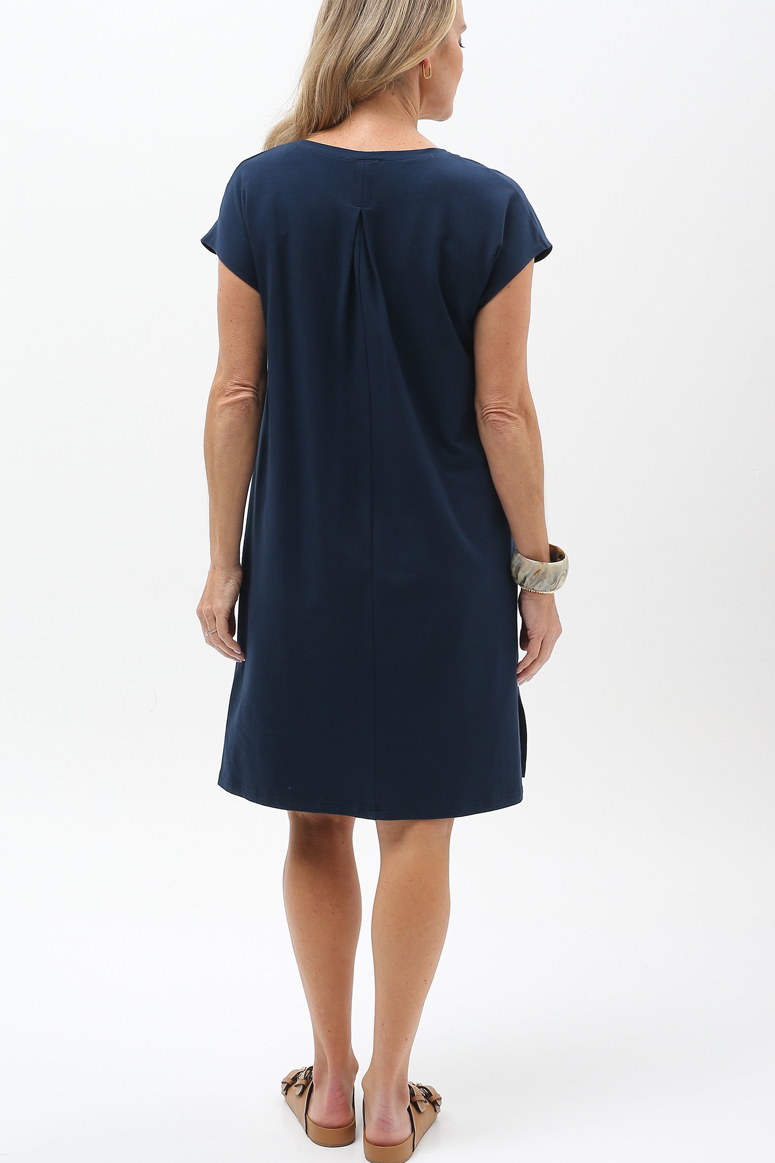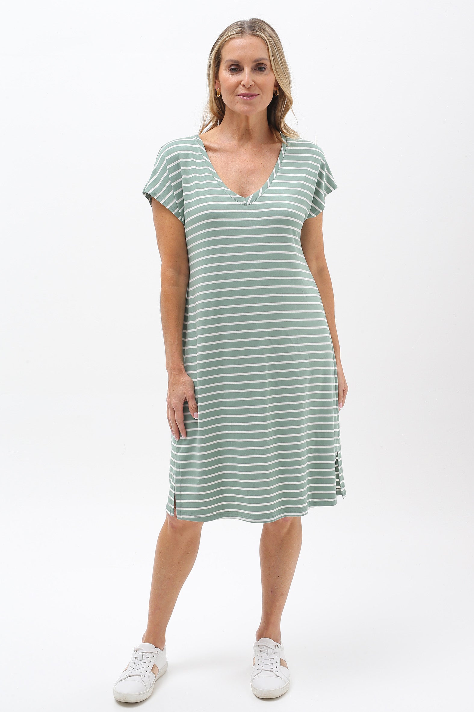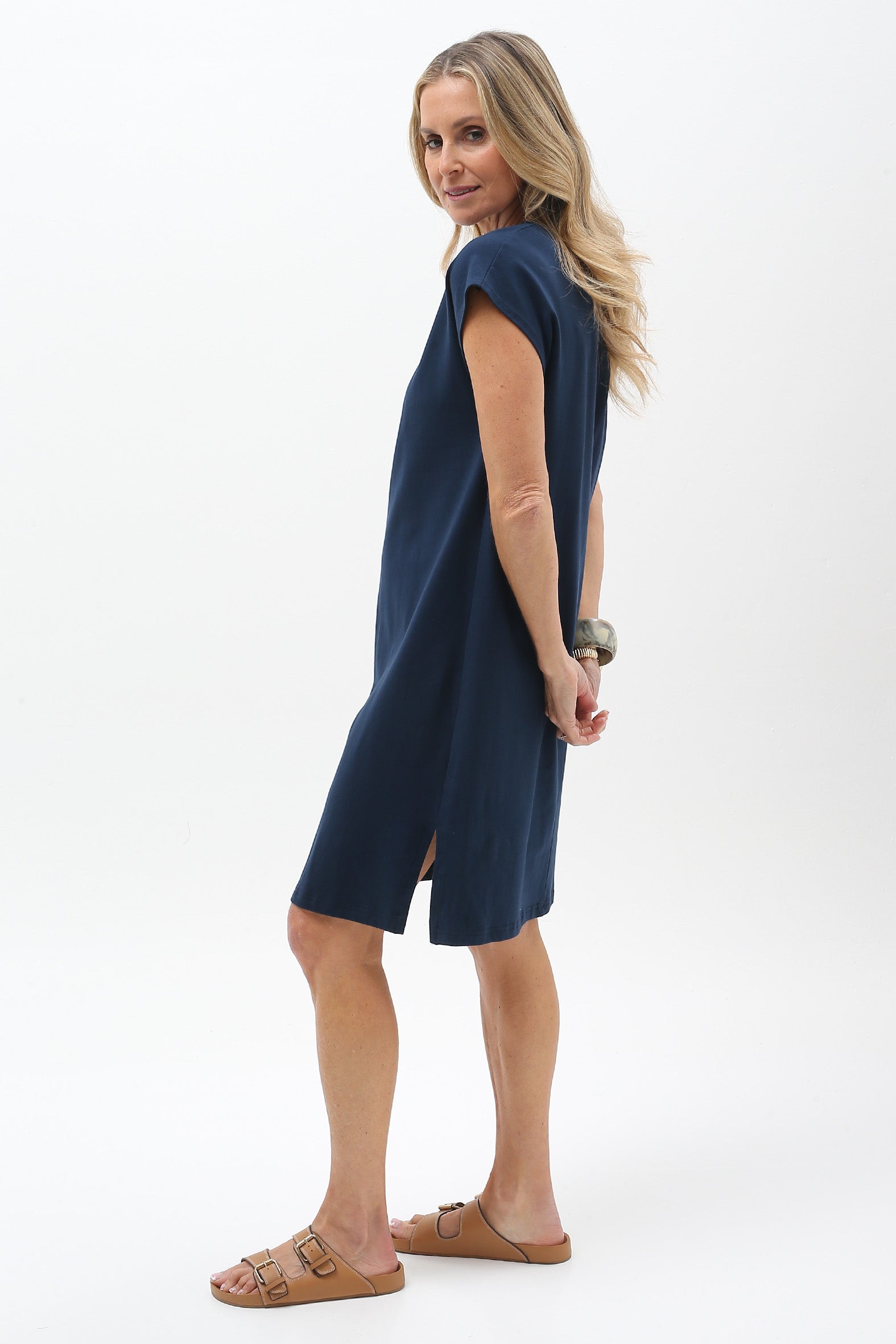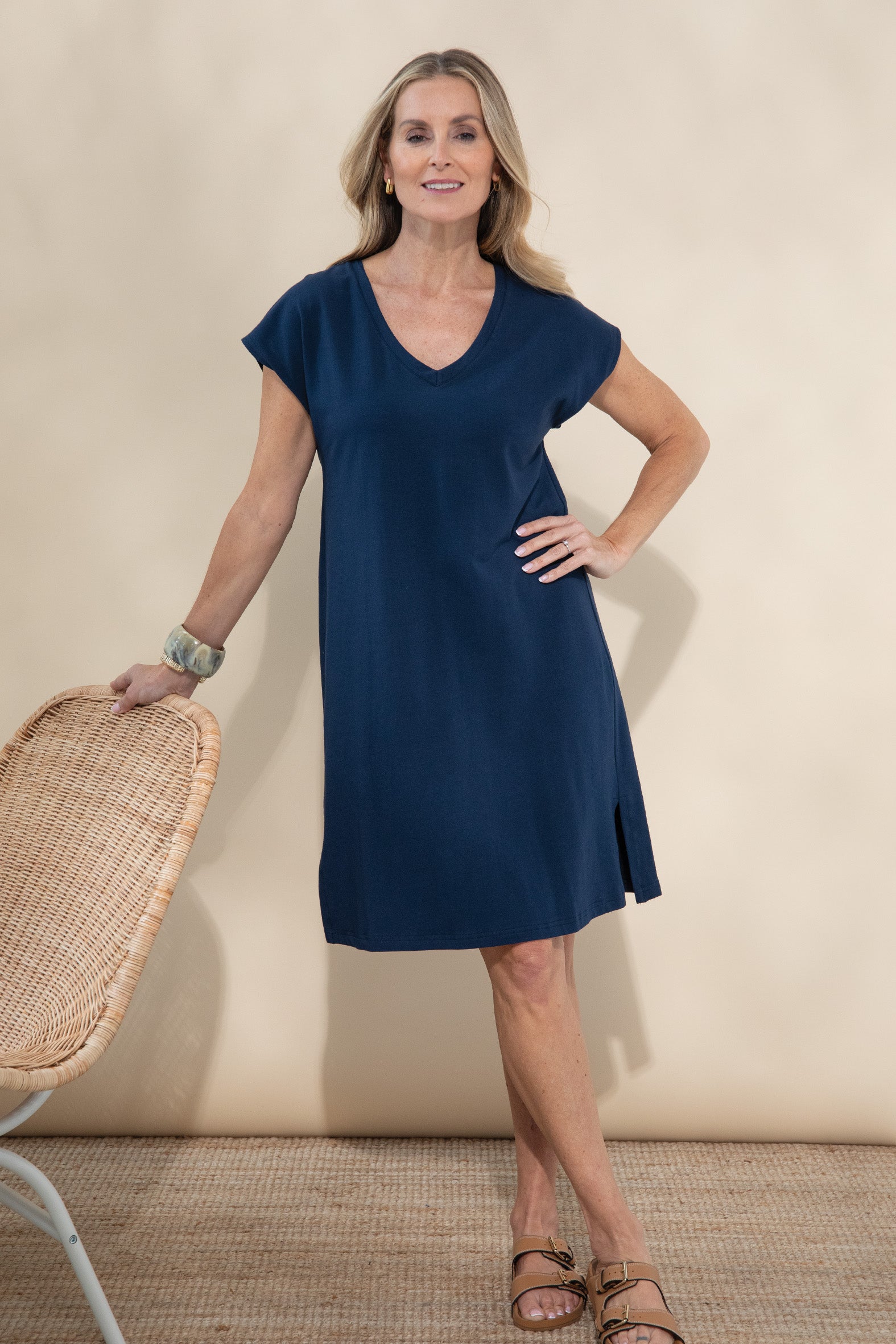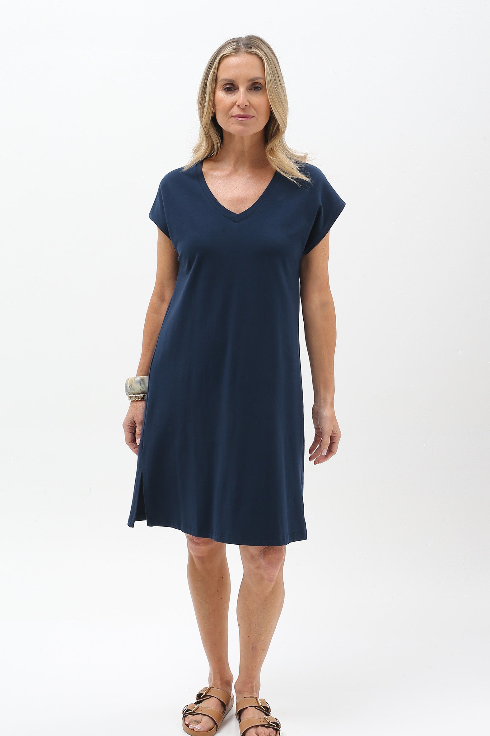 Crafted from stretch single jersey knit this tee shirt dress offers comfort, breathability and effortless style making it perfect for warm weather wear. Designed to sit at the knee, the silhouette is relaxed, yet refined, featuring an extended shoulder line and flattering V-shape neckline for a clean, minimal aesthetic. Versatile and easy to wear this piece transitions seamlessly from casual daywear to relaxed evening dressing.
