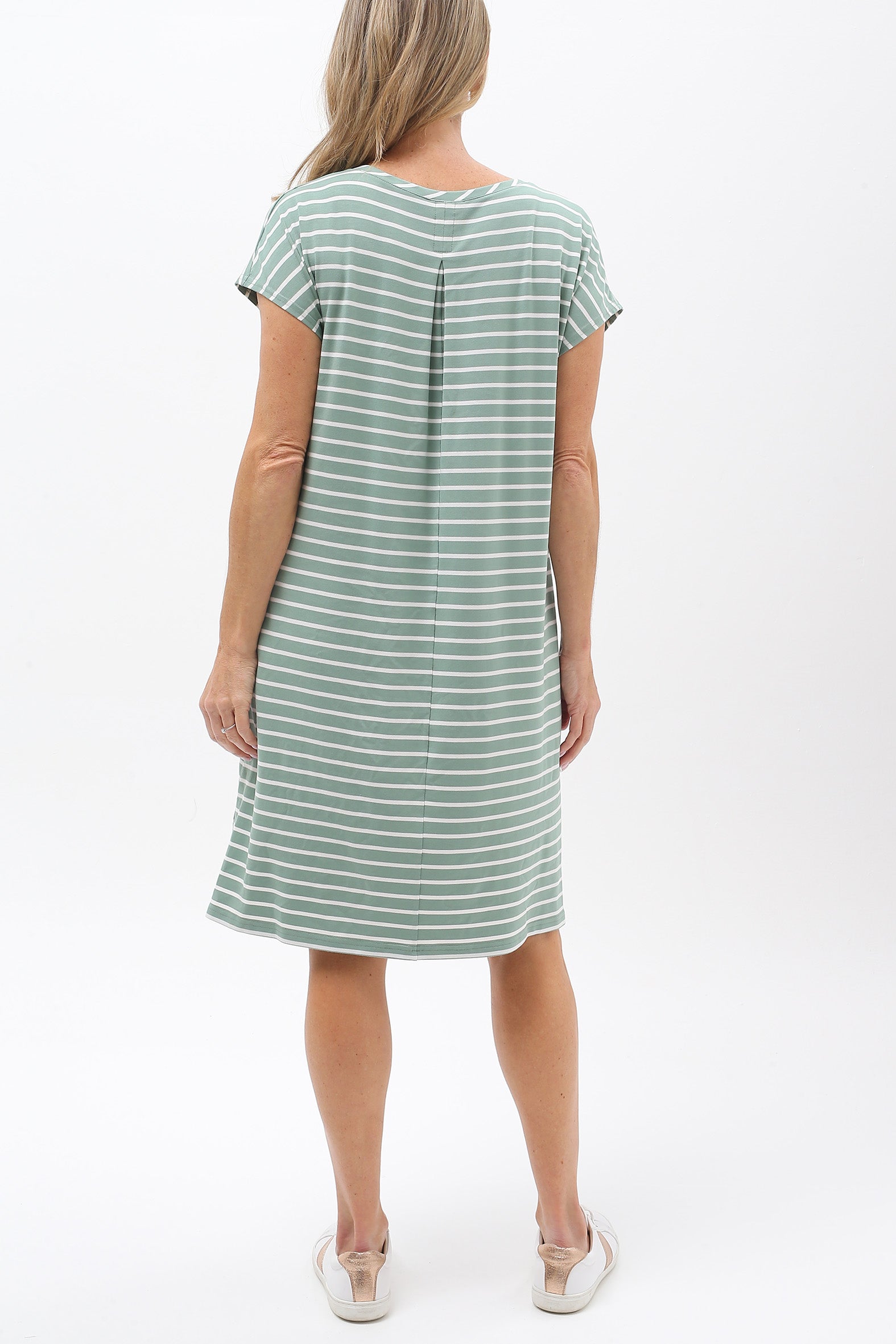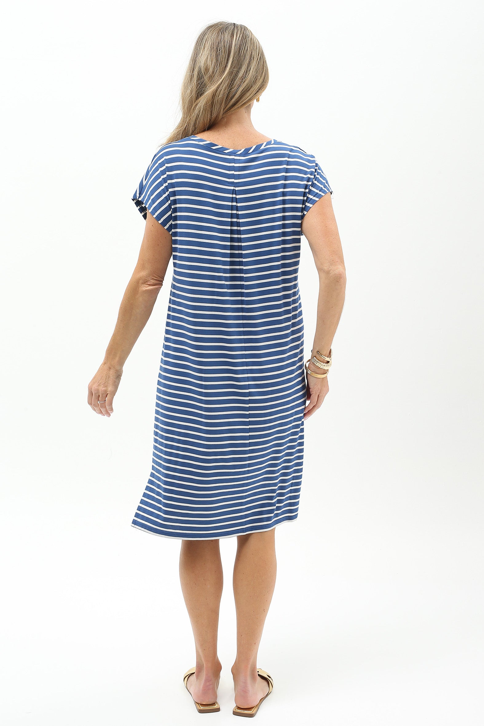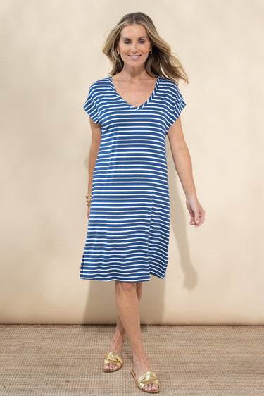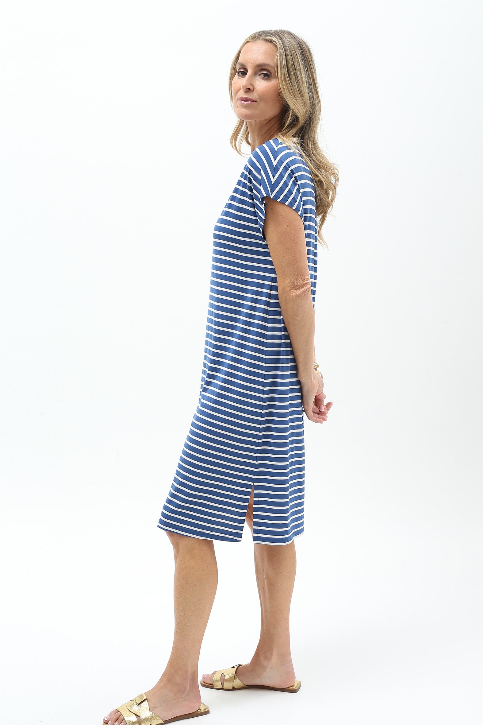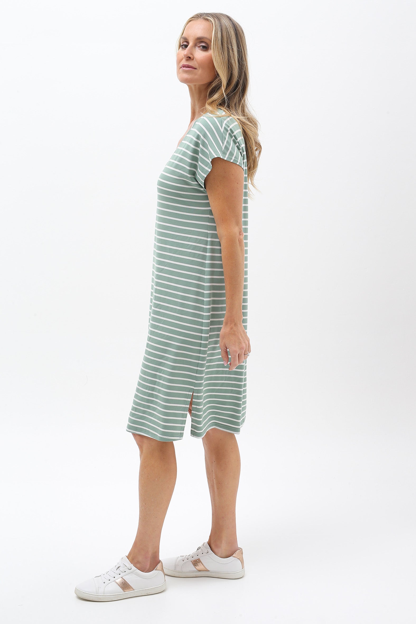 Crafted from stretch single jersey knit this tee shirt dress offers comfort, breathability and effortless style making it perfect for warm weather wear. Designed to sit at the knee, the silhouette is relaxed, yet refined, featuring an extended shoulder line and flattering V-shape neckline for a clean, minimal aesthetic. Versatile and easy to wear this piece transitions seamlessly from casual daywear to relaxed evening dressing.