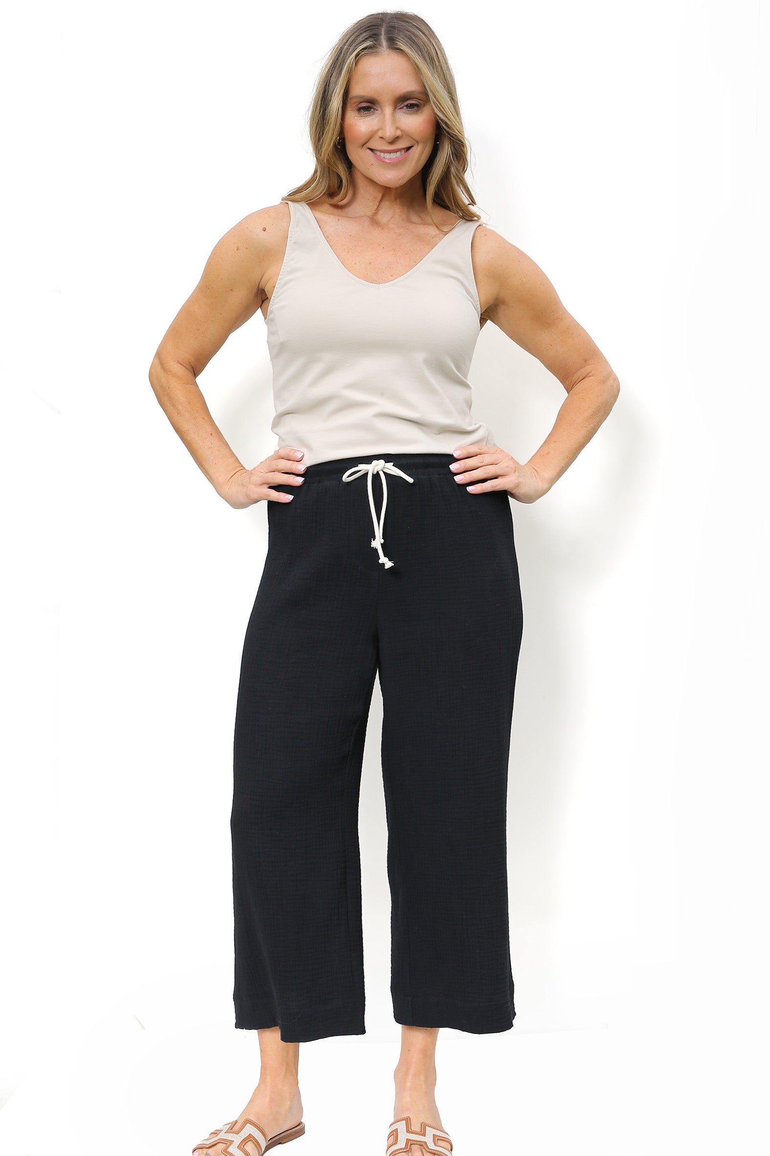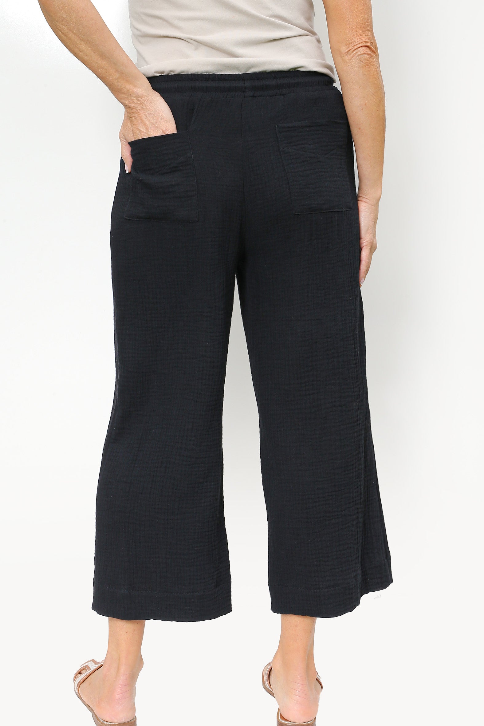 These wide-leg cropped pants are crafted from airy, soft to the touch cotton gauze with a textured surface, offering lightweight comfort with a relaxed silhouette. The elasticised waistband provides an easy, flexible fit and is accented with a rope drawcord for a touch of natural texture and visual interest. Finished with a deep hemline at the cuffs, this style combines effortless movement with refined detail—perfect for warm weather dressing or laid-back layering.