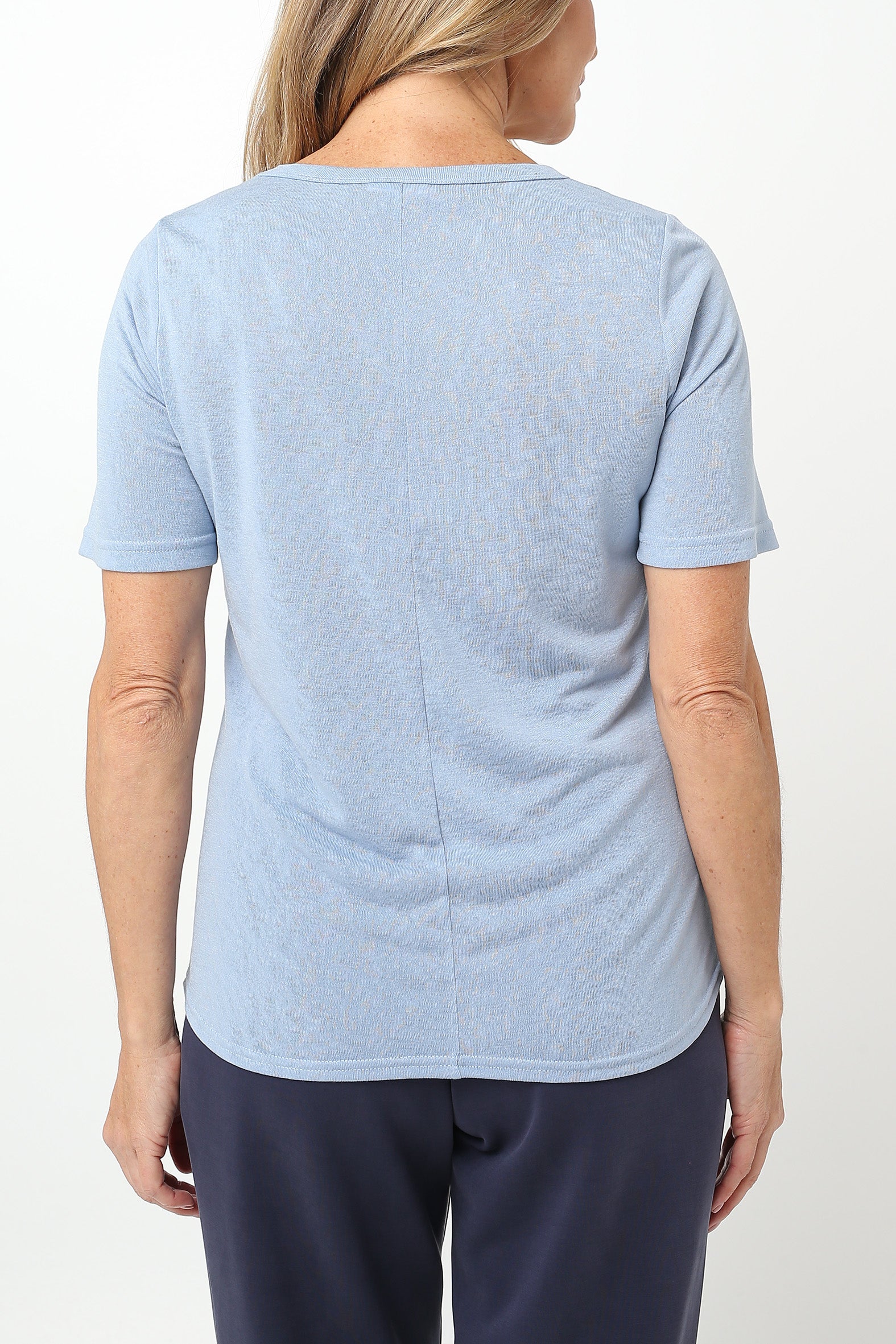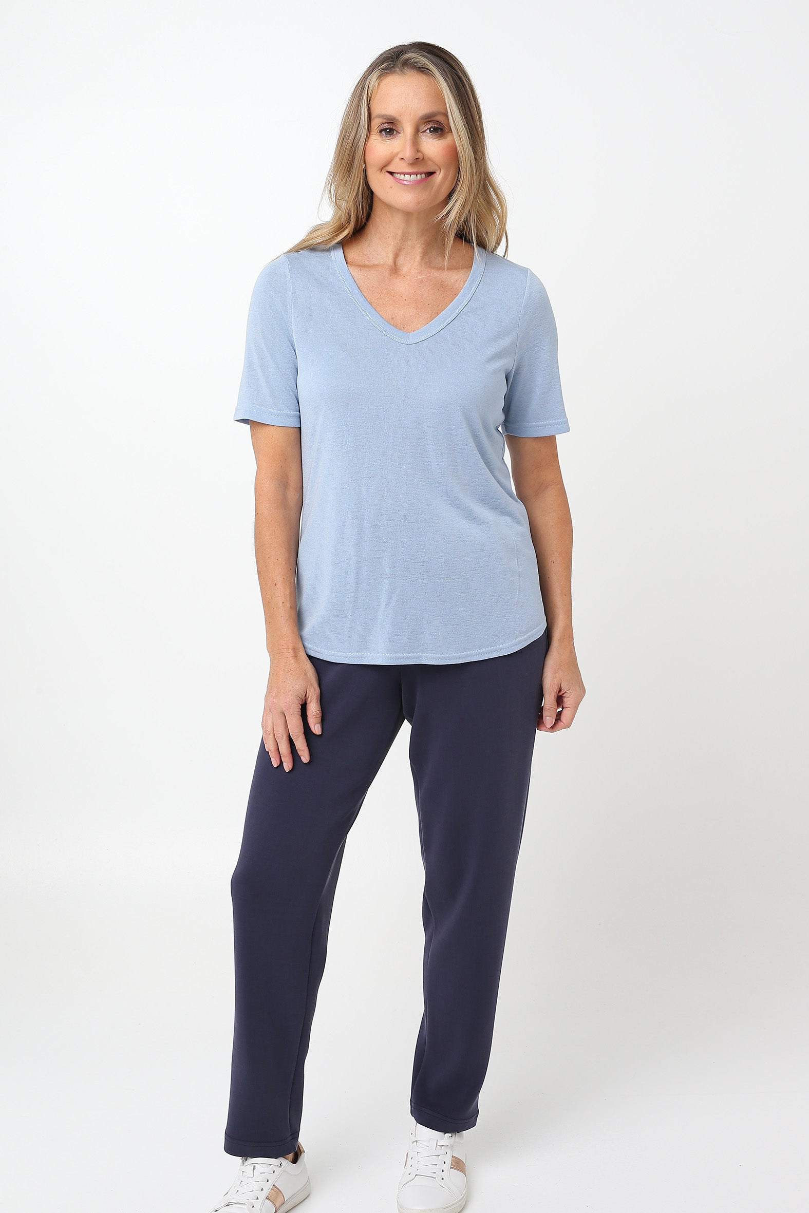This versatile V neck, short sleeve tee is crafted from a soft and light weight knitted blend of modal and polyester - the same softly draping single jersey as our favourite Darcie Top. The Modal ensures breathability and comfort and the polyester, durability and easy-care properties The classic V neckline creates a flattering, timeless silhouette perfect for layering or wearing on its own. With its relaxed fit and sleek finish, this tee is perfect for everyday wear, offering a balance of comfort and style whether paired with jeans, shorts or casual pants.