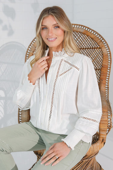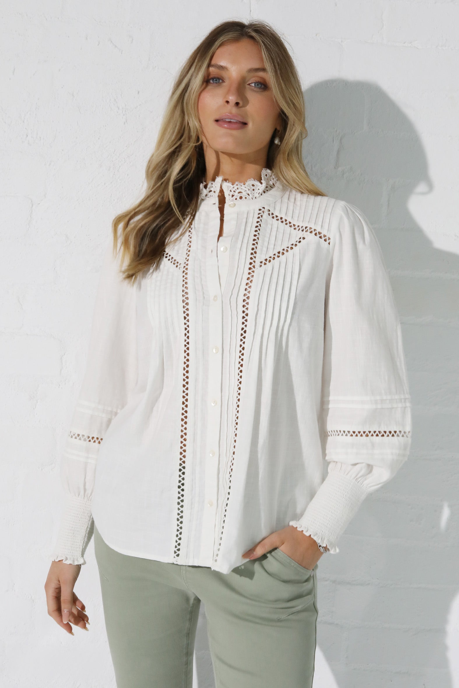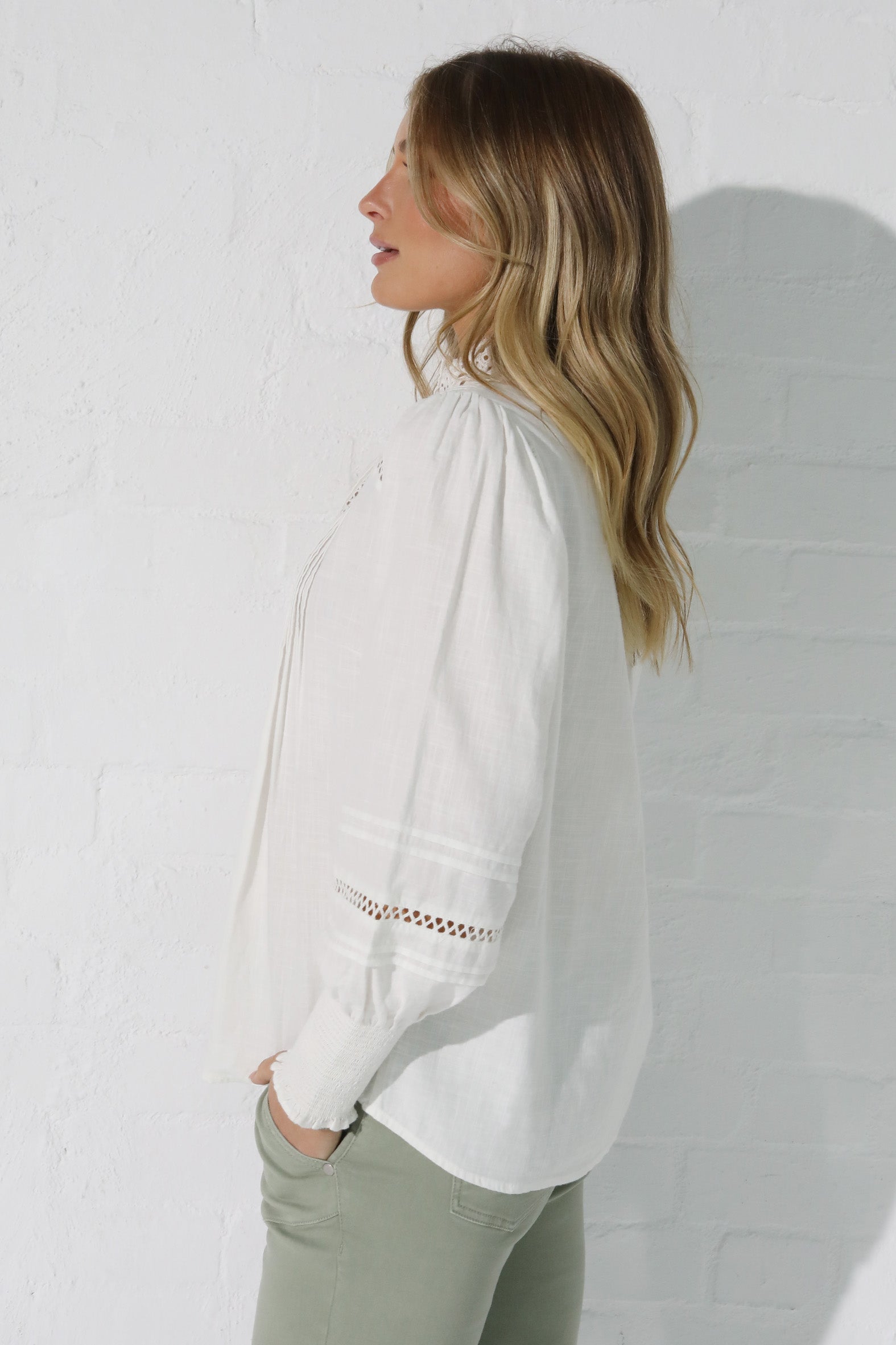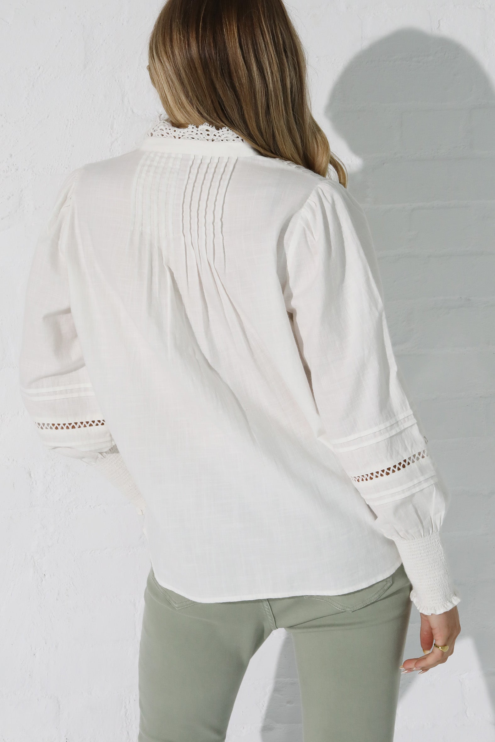Elevate your everyday with the elegance and femininity of our 100% cotton blouse adorned with lace, fine pin tucks and shirred cuffs on the long blouson sleeves. A must-have, versatile style to dress up with tailored pants and a blazer or wear casually with your favourite jeans.
