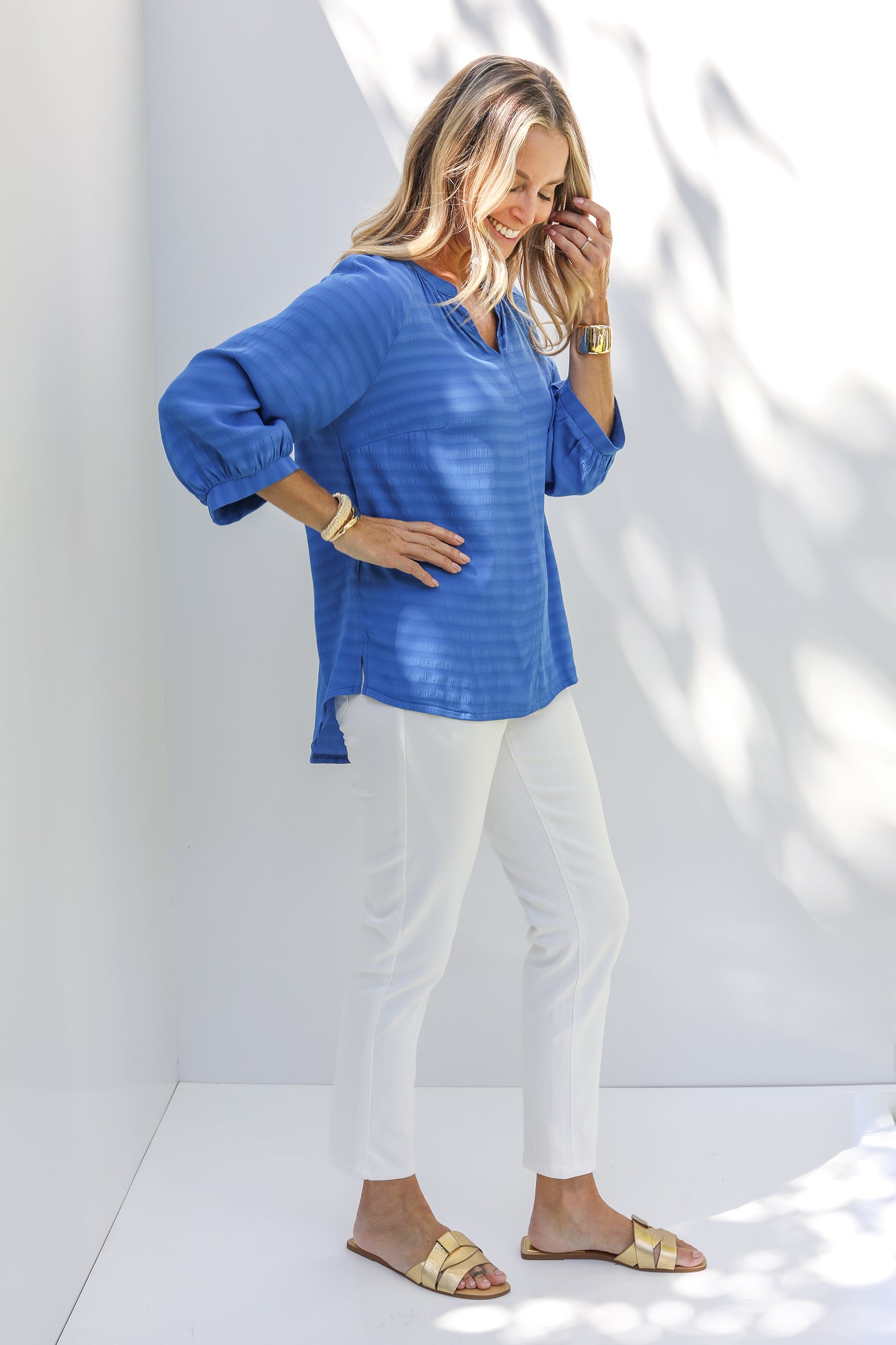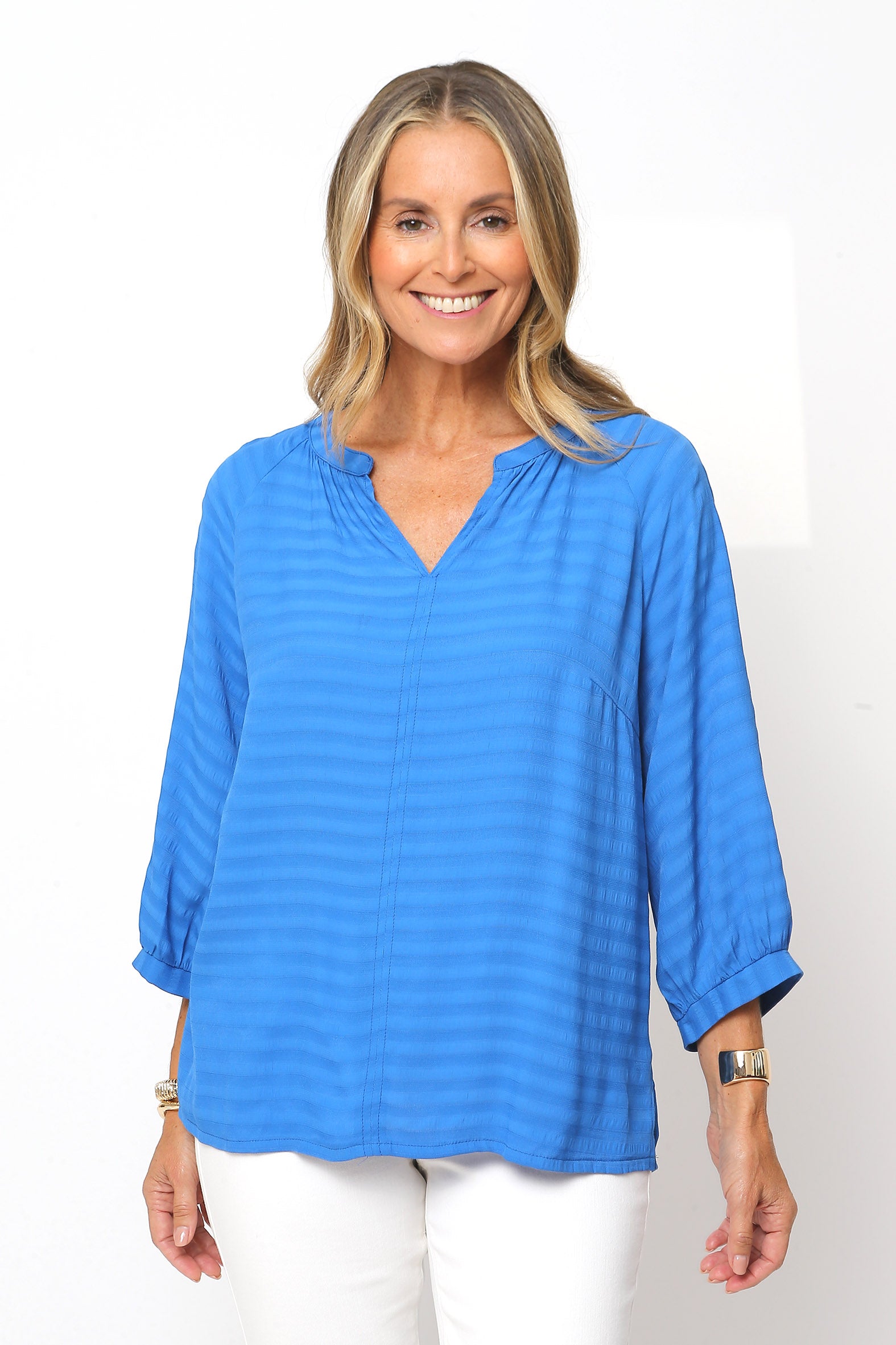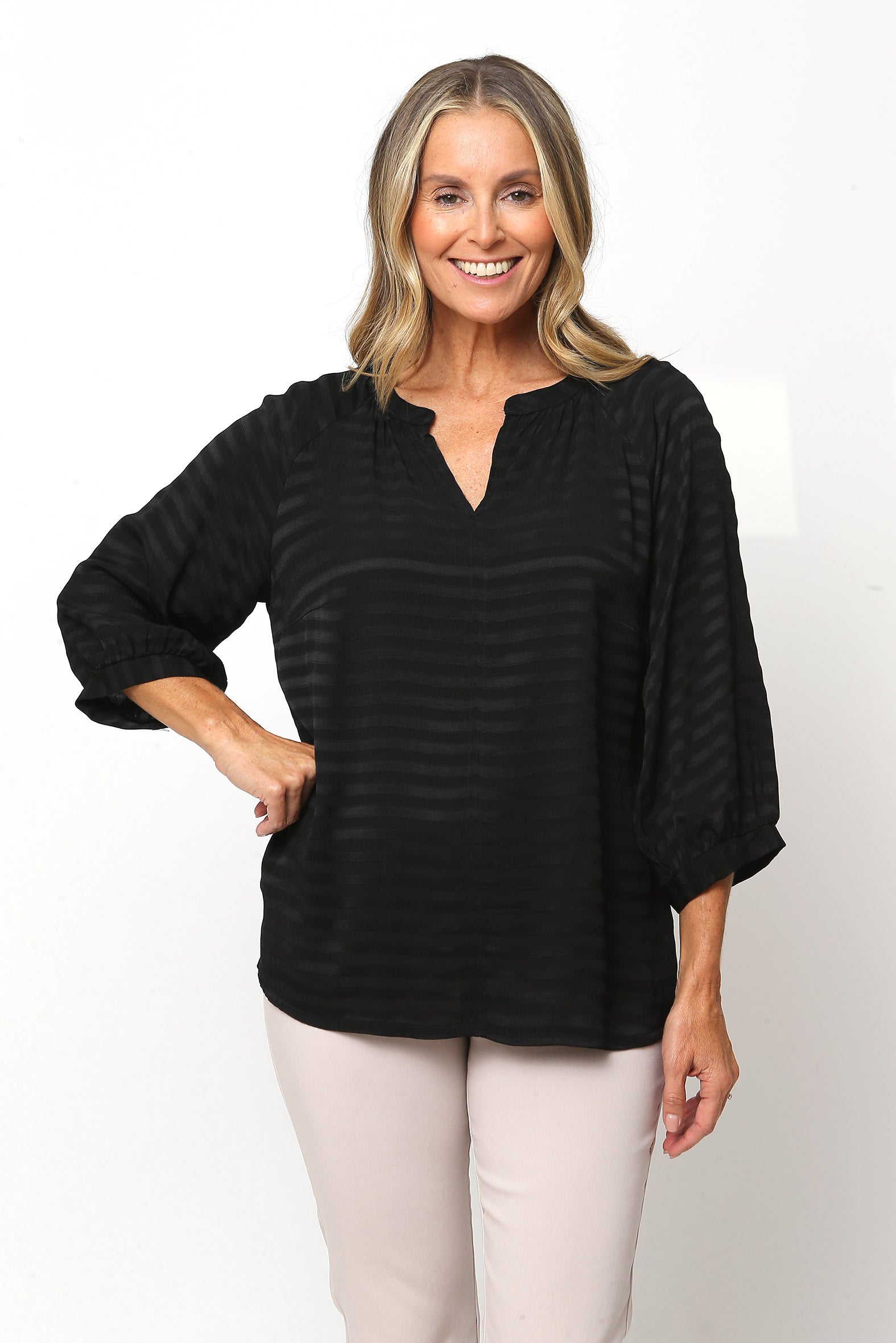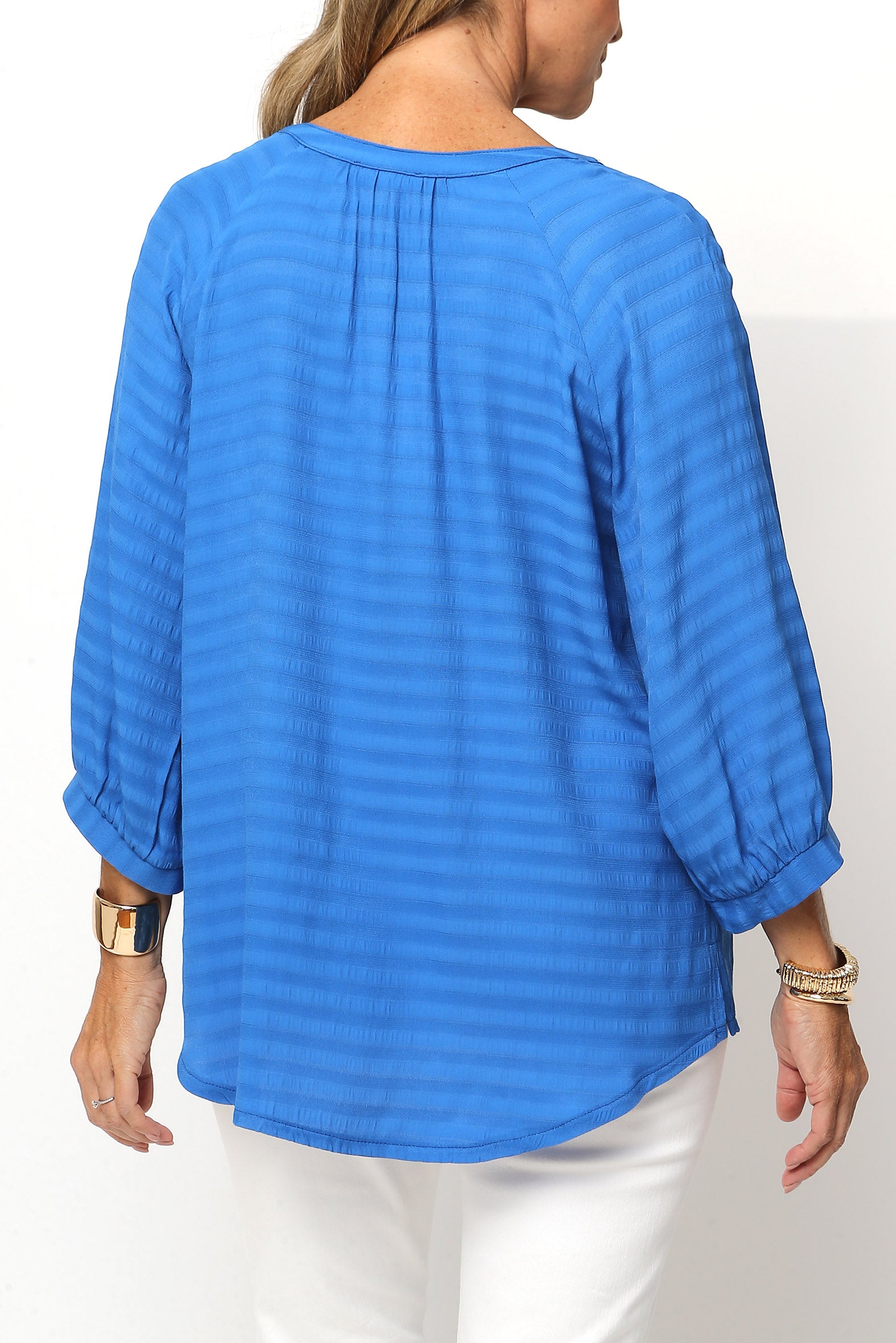 Effortless polish for every day. Crafted from softly draping woven viscose/rayon with a subtle self-stripe, this blouse offers breathable comfort and timeless texture. The notched V neckline with collar stand, centre front seam, and soft gathers create a flattering silhouette, while the curved hemline and side splits add ease and movement.