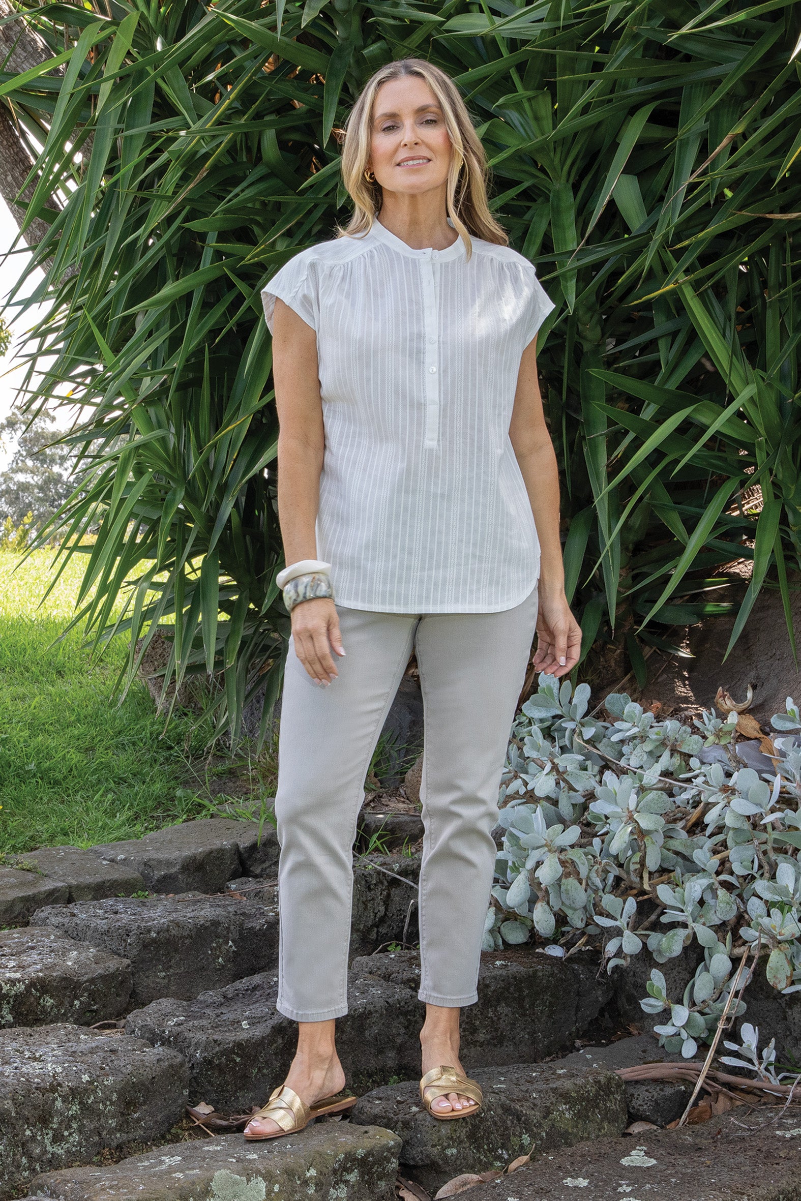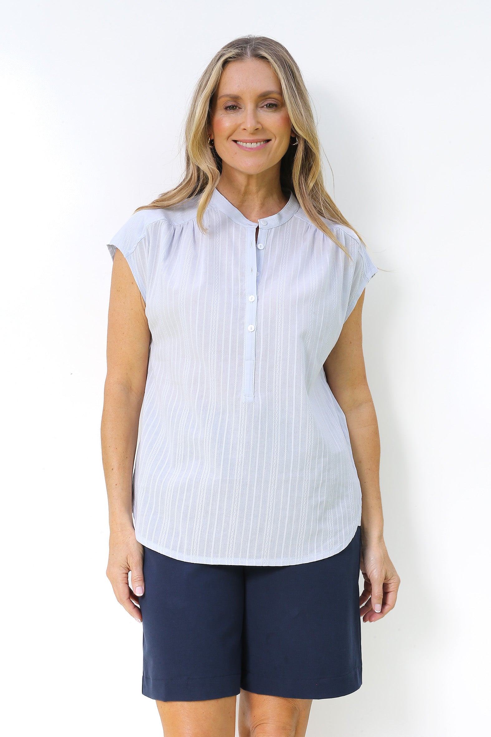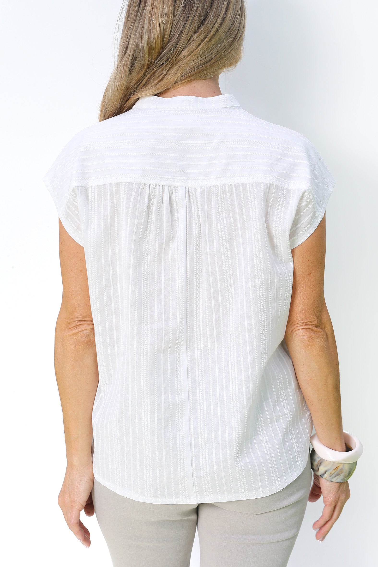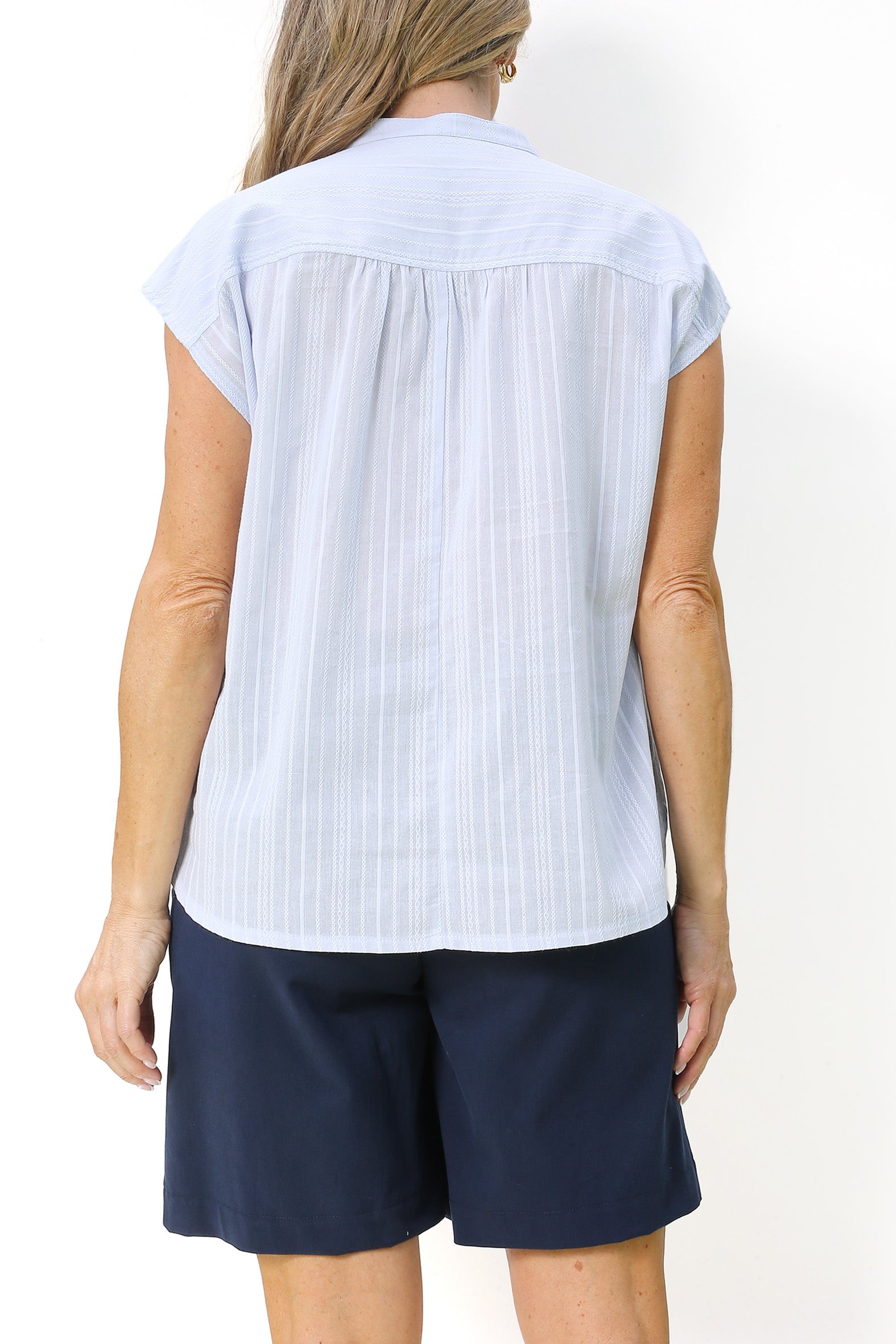 Crafted from 100% cotton, this blouse offers a soft, breathable feel enhanced by the delicate dobby weave featuring an intricate embroidery-like pattern throughout. Designed with an extended shoulder line for a relaxed, refined silhouette it features a button-down front placket from a narrow collar stand. A shoulder yoke with soft, feminine gathers adds gentle volume while the curved shirt-tail hemline provides a flattering finish. Effortlessly comfortable and easy to wear this blouse is a perfect addition to your summer wardrobe.