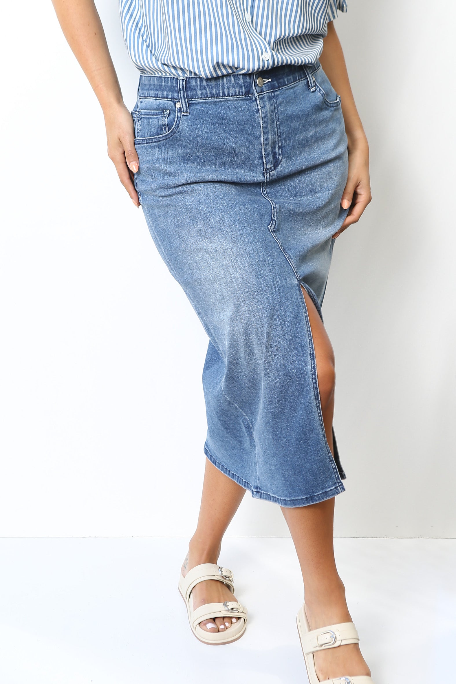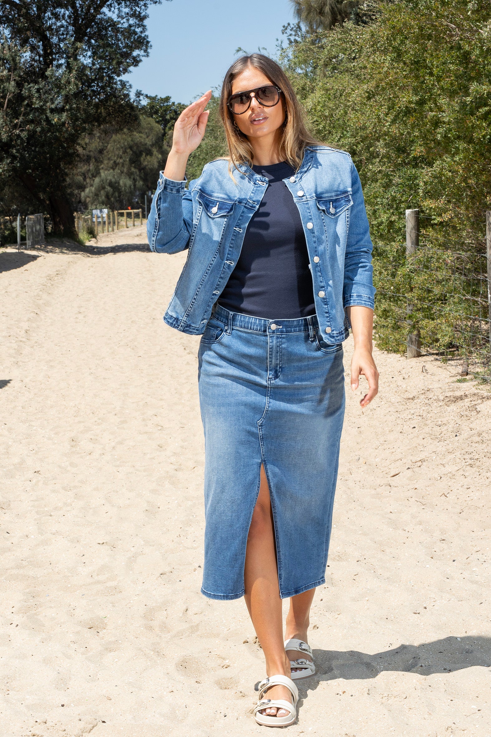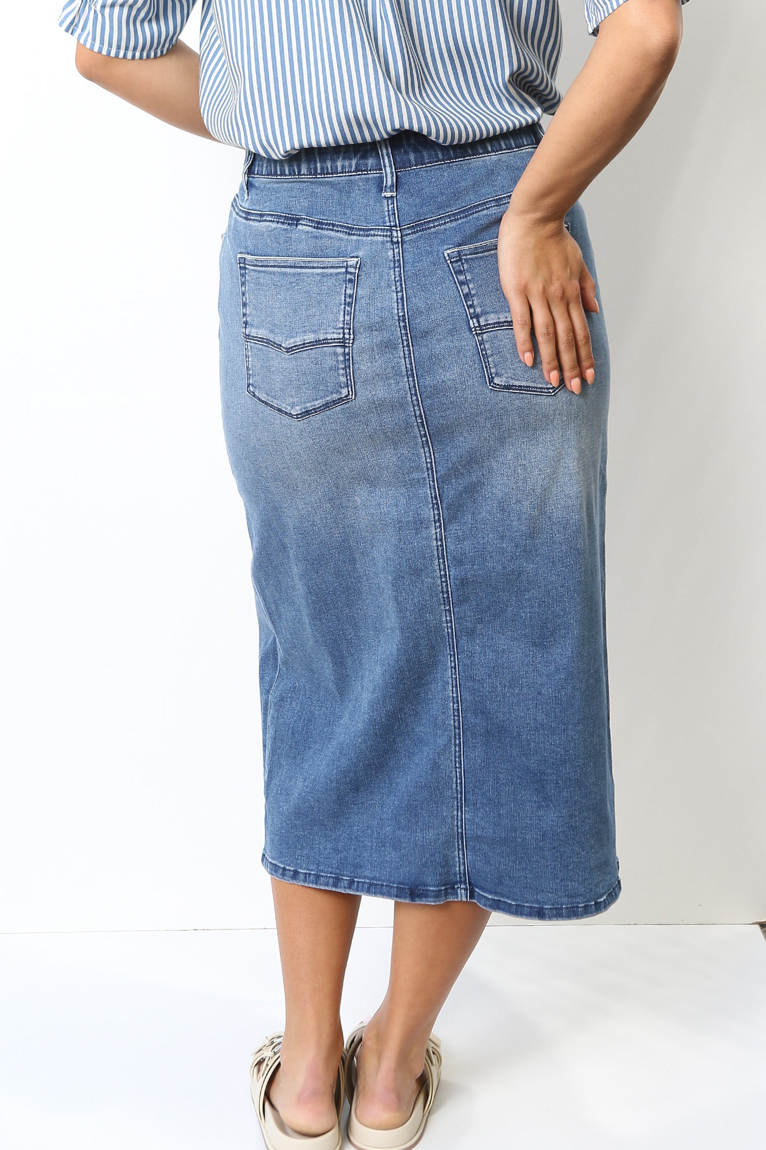 Elevate your wardrobe with our chic stretch denim midi skirt designed for both style and comfort. This versatile piece features a centre front zip and tack button closure together with a fully elasticised waistband ensuring a secure, flattering fit and sleek silhouette. . Easy to coordinate, with a blouse or shirt for a polished look or a relaxed tee for a more relaxed vibe, making it a versatile, timeless addition to any wardrobe.