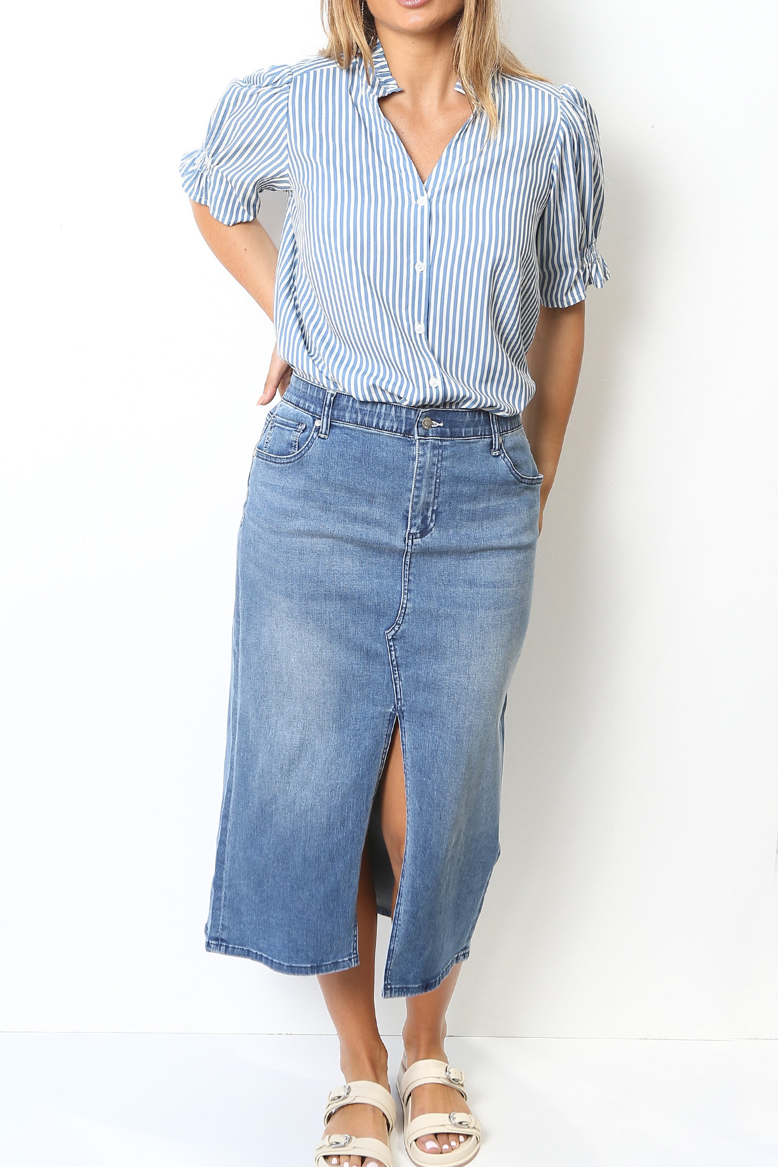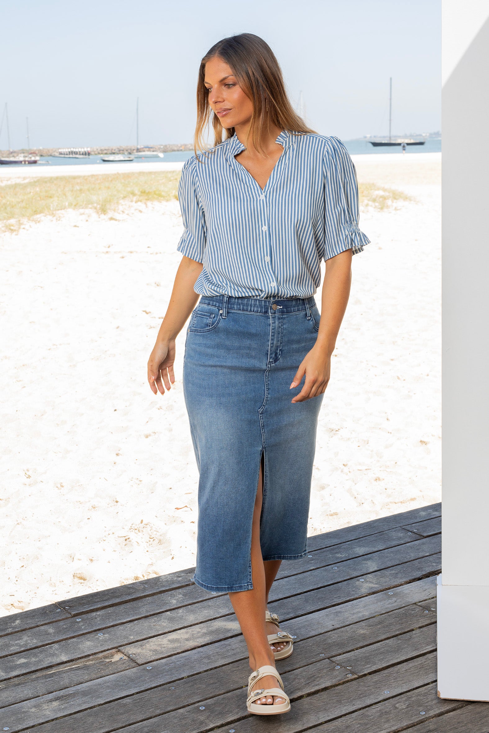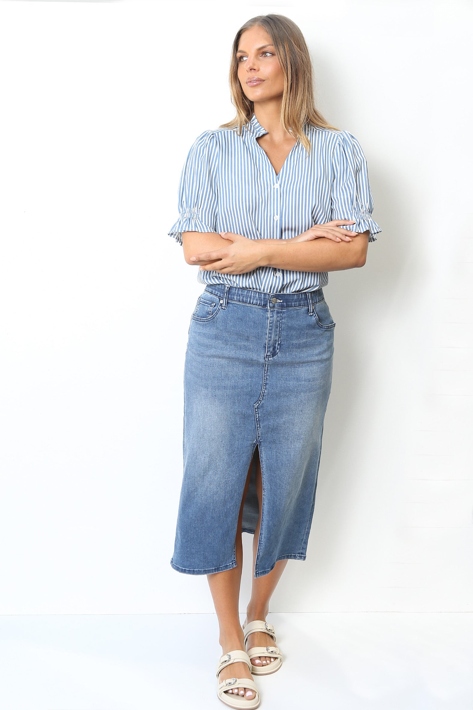 Elevate your wardrobe with our chic stretch denim midi skirt designed for both style and comfort. This versatile piece features a centre front zip and tack button closure together with a fully elasticised waistband ensuring a secure, flattering fit and sleek silhouette. . Easy to coordinate, with a blouse or shirt for a polished look or a relaxed tee for a more relaxed vibe, making it a versatile, timeless addition to any wardrobe.