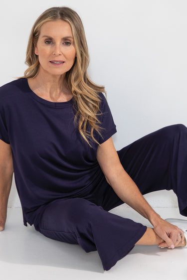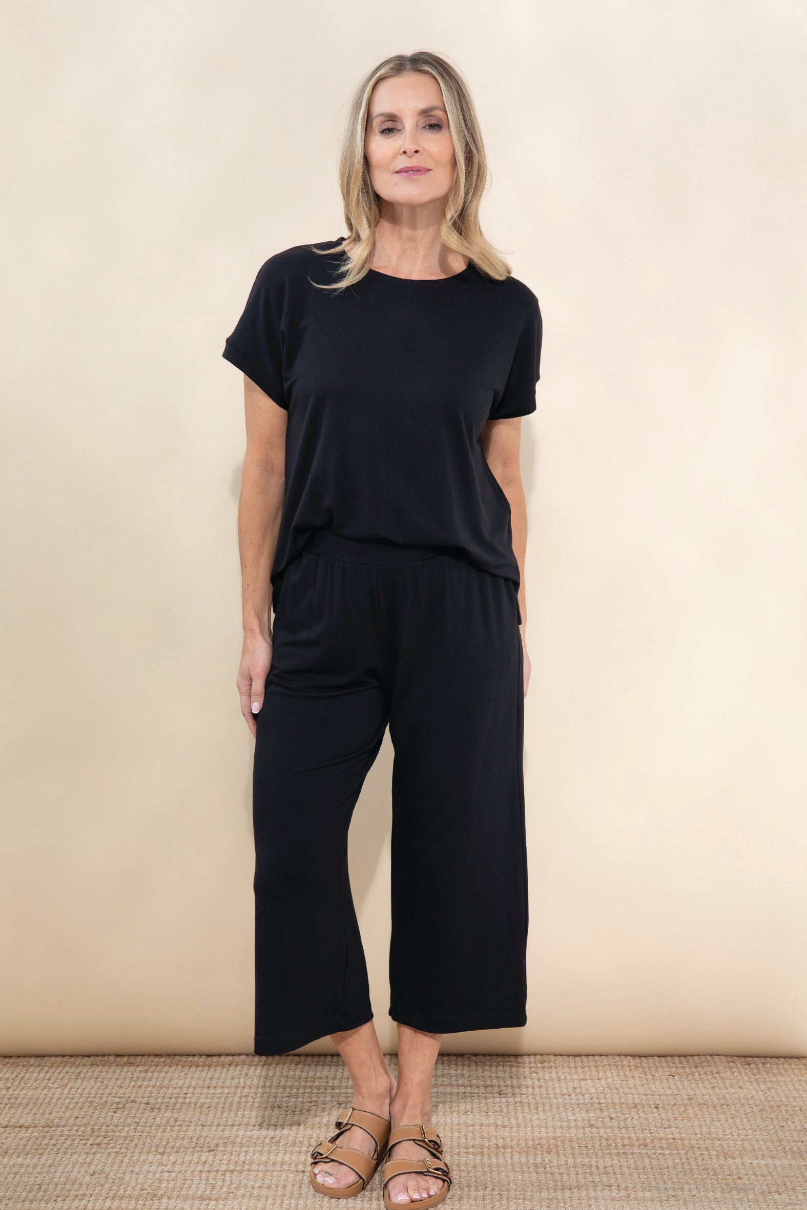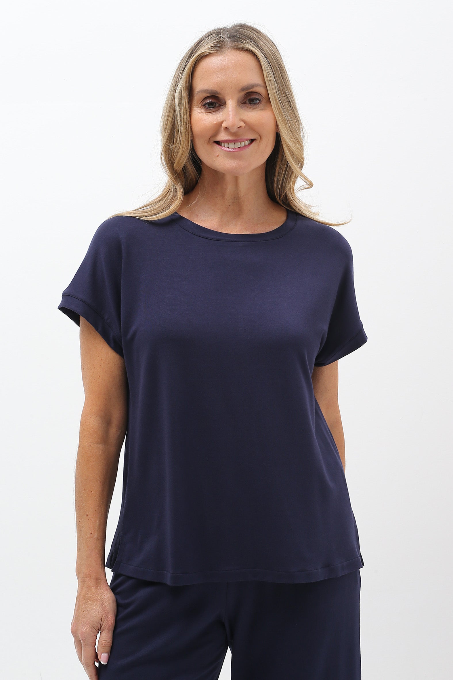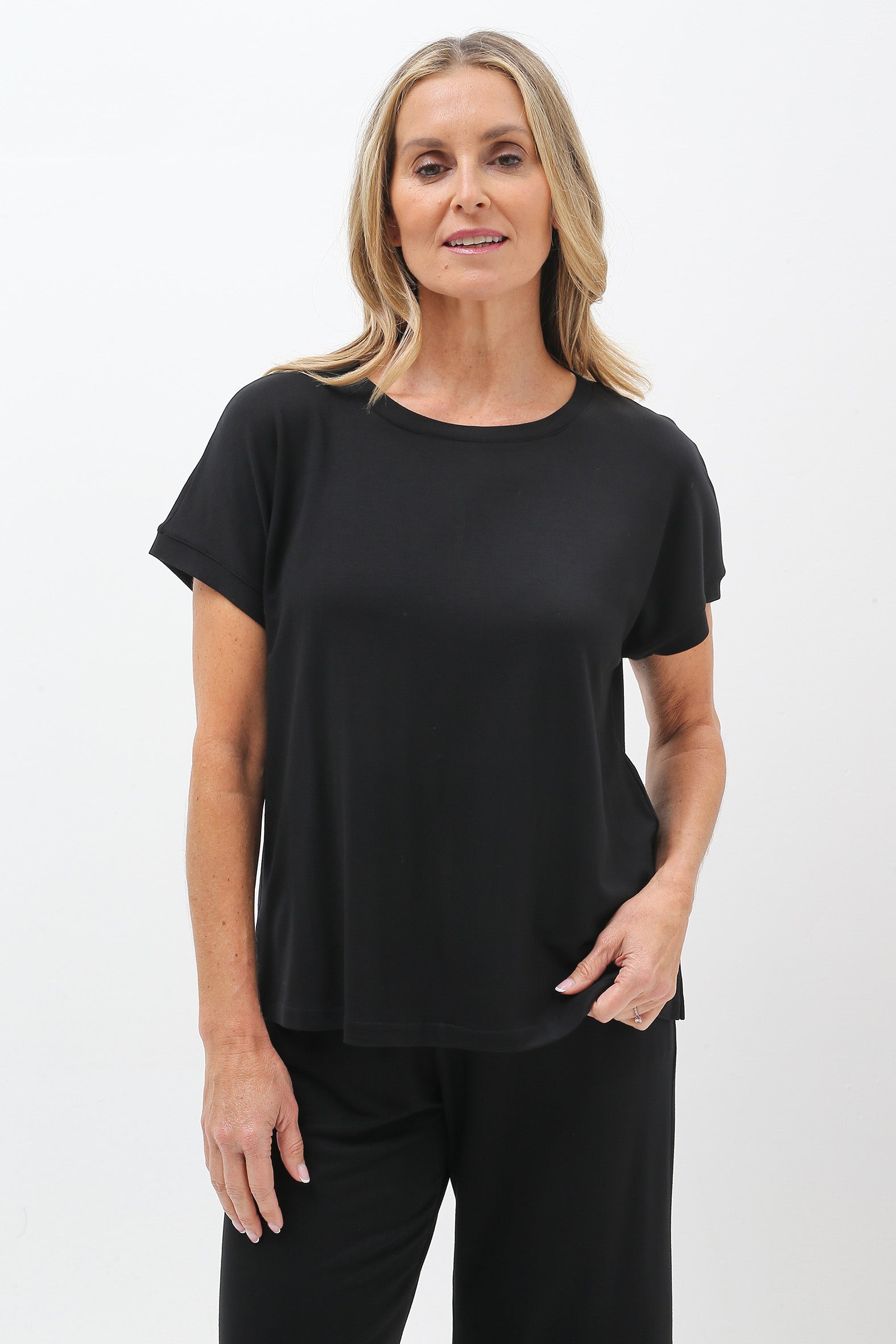 Effortless comfort with a polished edge. This extended shoulder top blends laid-back ease with subtle structure, making it a versatile staple for everyday wear. Crafted from soft and breathable viscose/elastane French Terry, it offers gentle stretch and a relaxed silhouette that moves with you. The band-finished neckline and sleeves add a refined touch, while side seam splits ensure comfort and flow. Pair it with Fluid Pants for a coordinated look or layer it over denim and shorts for casual days.