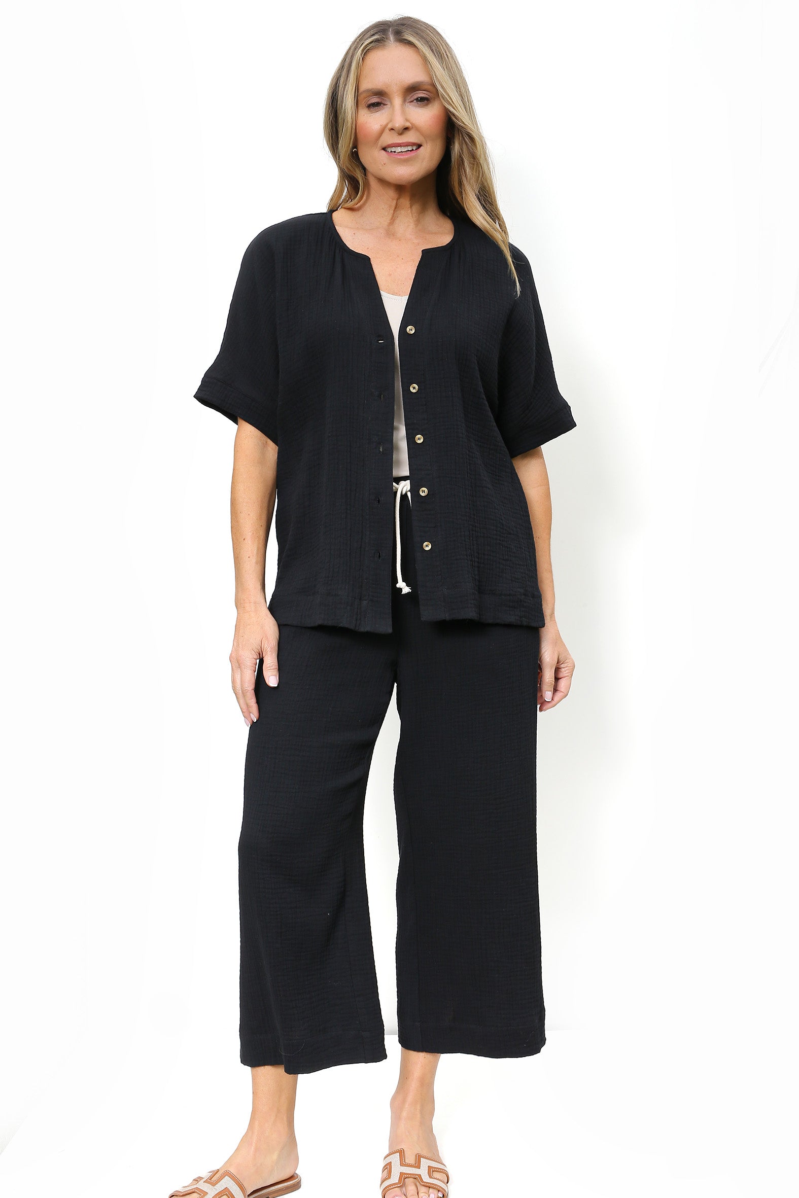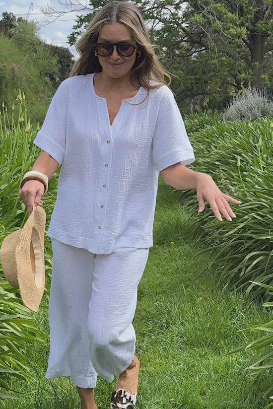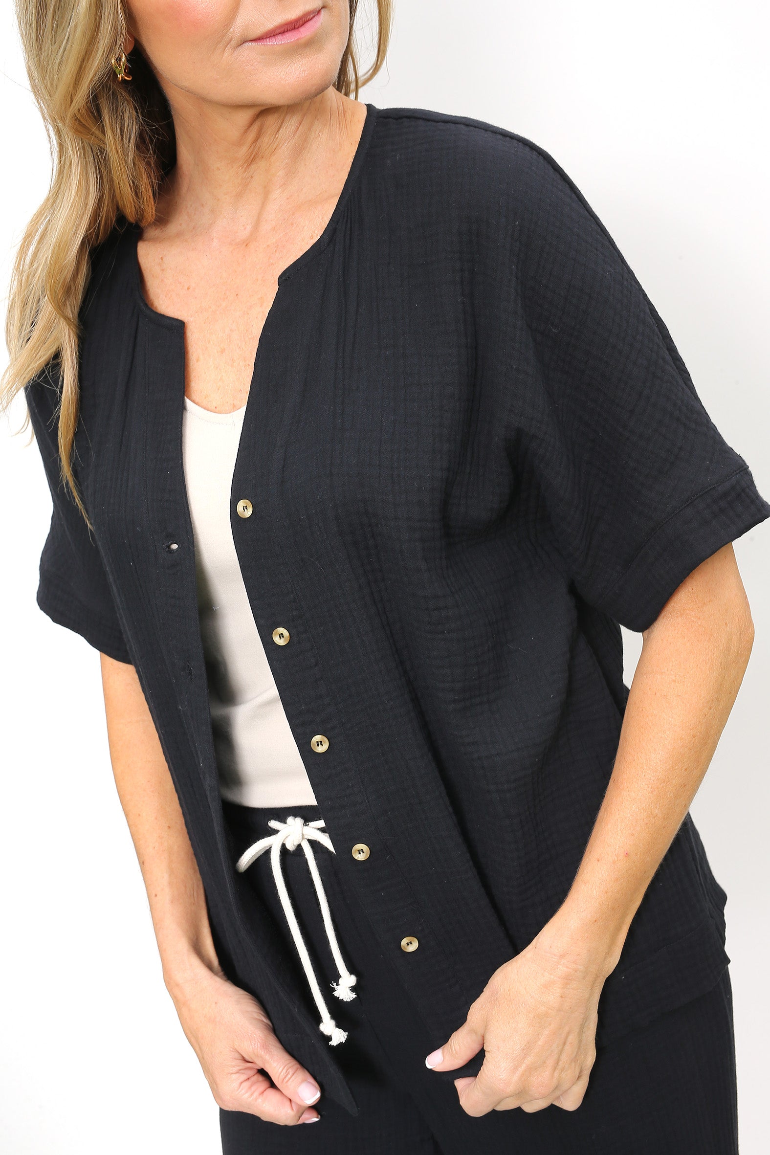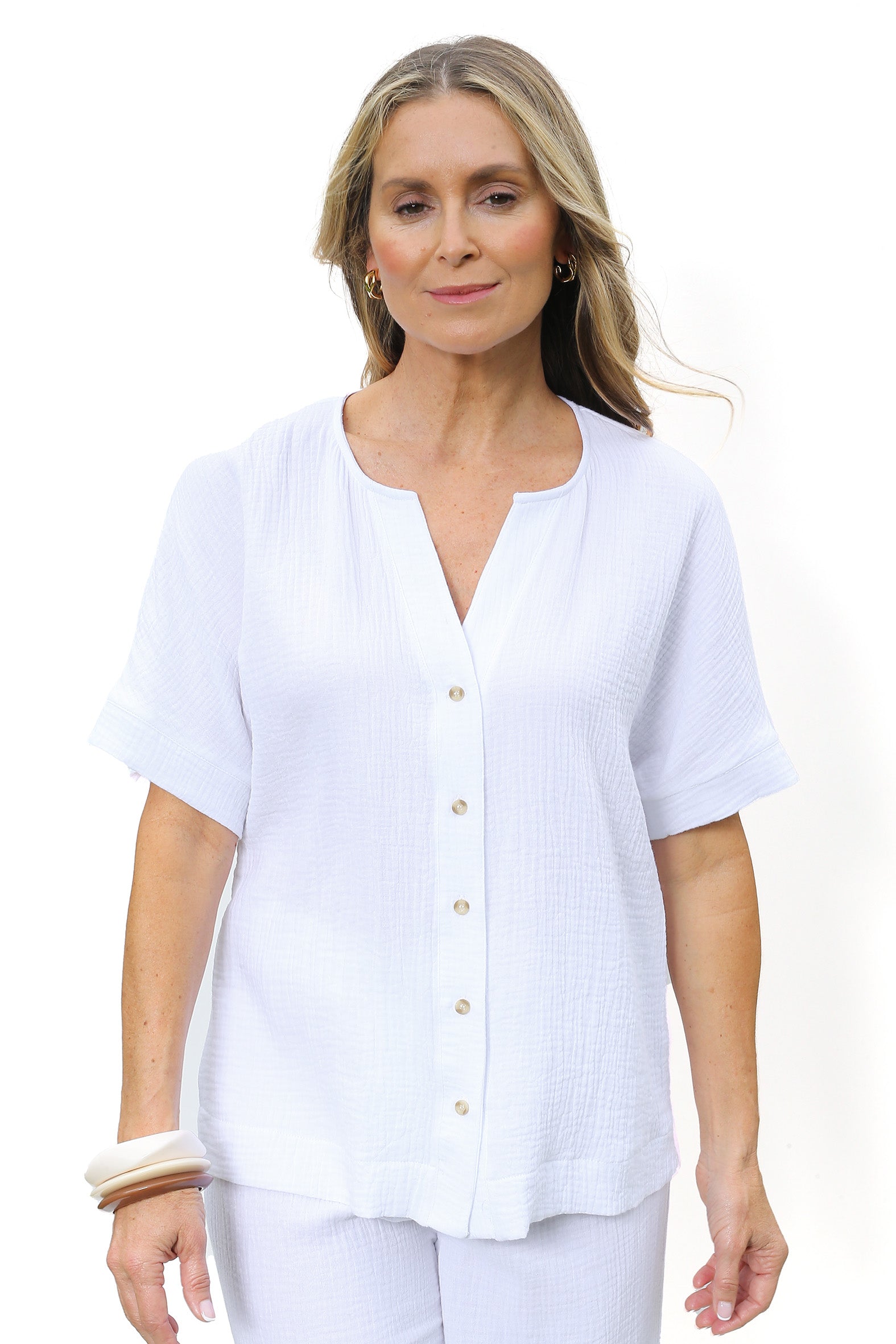 Cotton gauze button-through short sleeve top