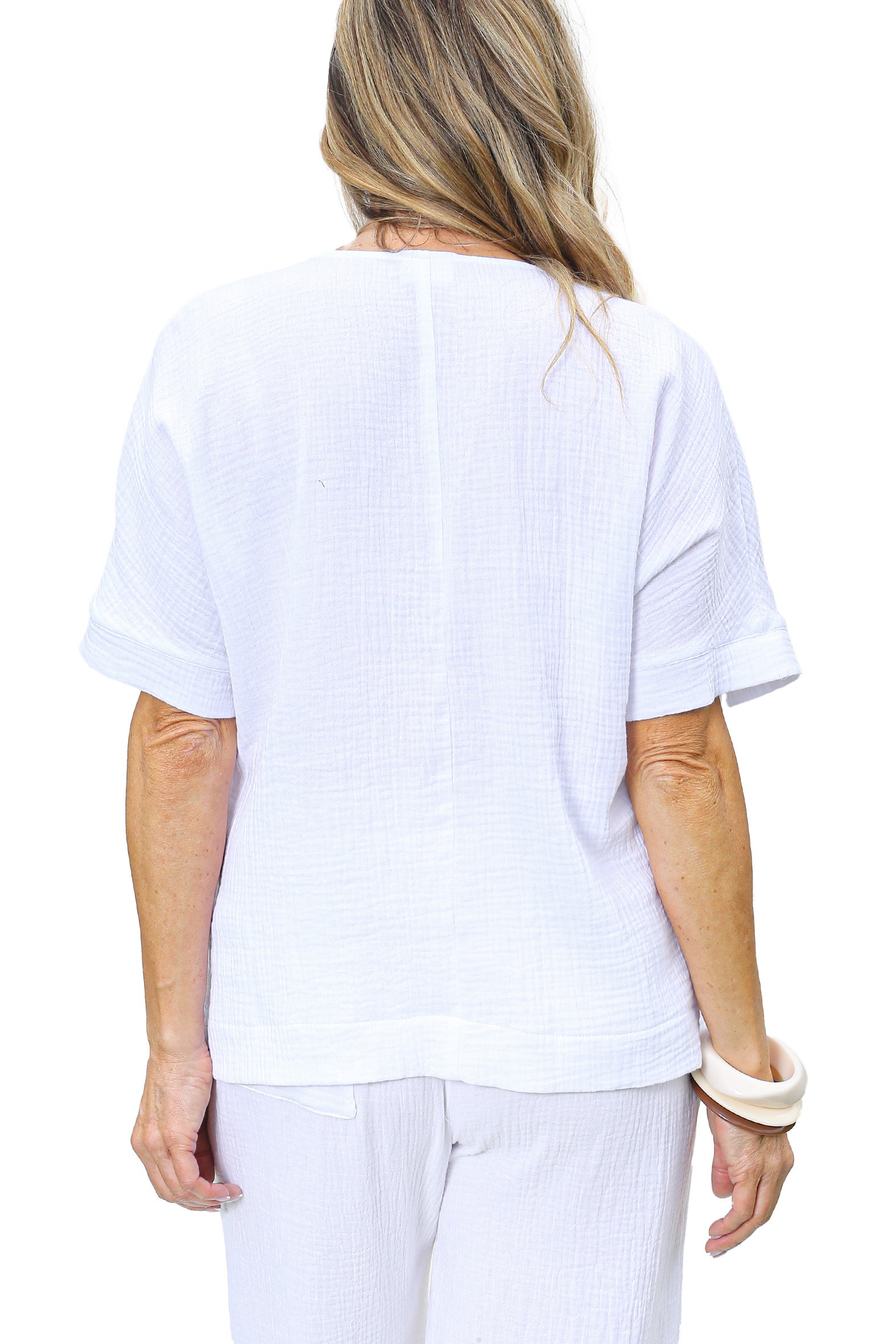 This short-sleeve top is crafted from light weight cotton gauze with a textured surface, offering a soft, airy feel perfect for warm weather dressing. It features an extended shoulder line that creates a relaxed, easy silhouette, complemented by a button-through front fastening for versatile styling. The neckline is finished with a refined notched V-neck adding subtle structure. A deep hemline anchors the garment and each sleeve opening is finished with a clean band enhancing the garment’s effortless look.