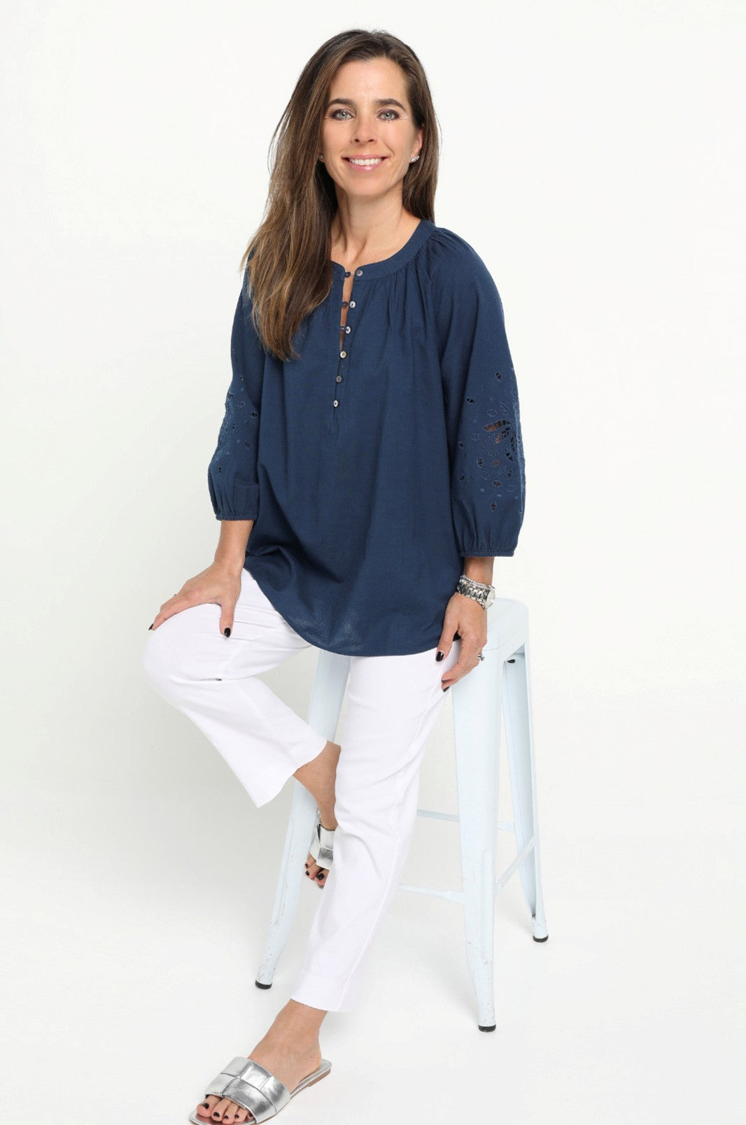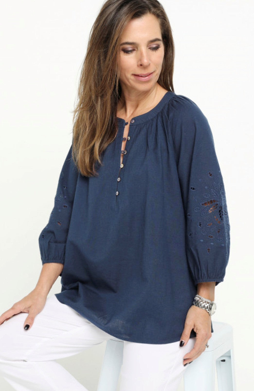 Crafted from a breathable linen/cotton blend this blouse exudes effortless style with its feminine drape and natural texture. The round neckline is framed by soft gathers, adding subtle volume and the straight hemline is finished with a split in each side seam. A front button placket, featuring natural shell buttons and fine rouleaux loops, adds a refined touch. Three quarter length raglan sleeves enhance the relaxed silhouette and feature a striking panel of tonal cut-out embroidery. Perfectly balanced between casual and elevated, this versatile navy blouse is ideal for warm weather dressing coordinated with shorts, pants or jeans.
