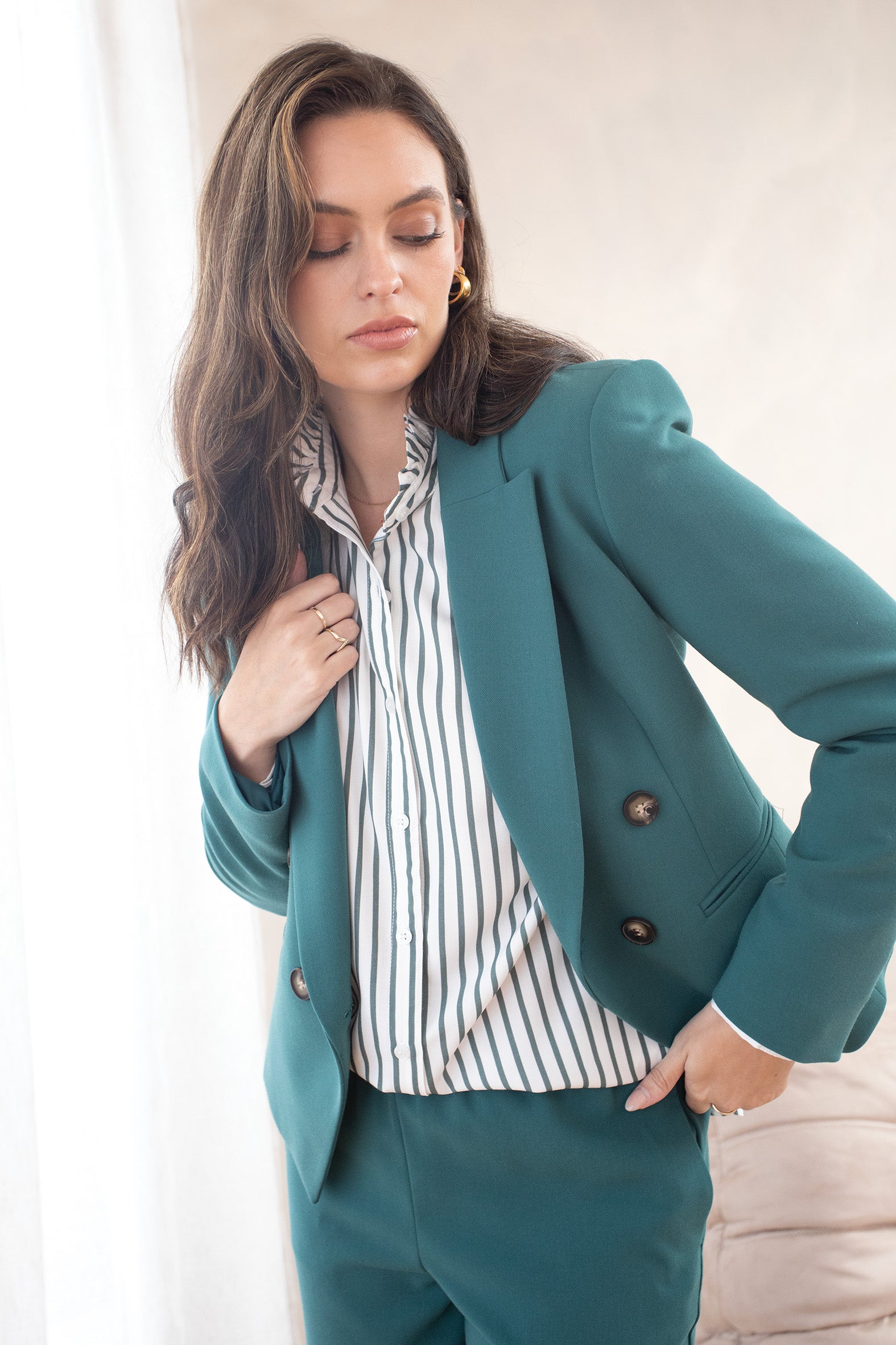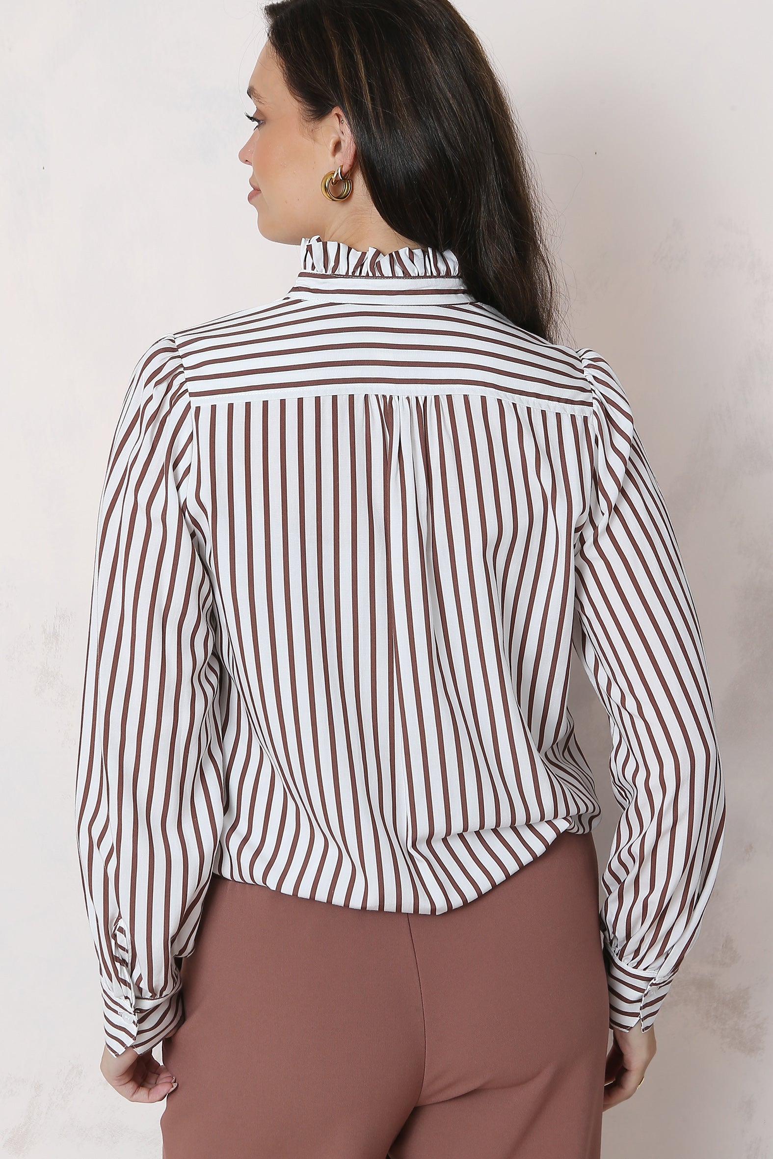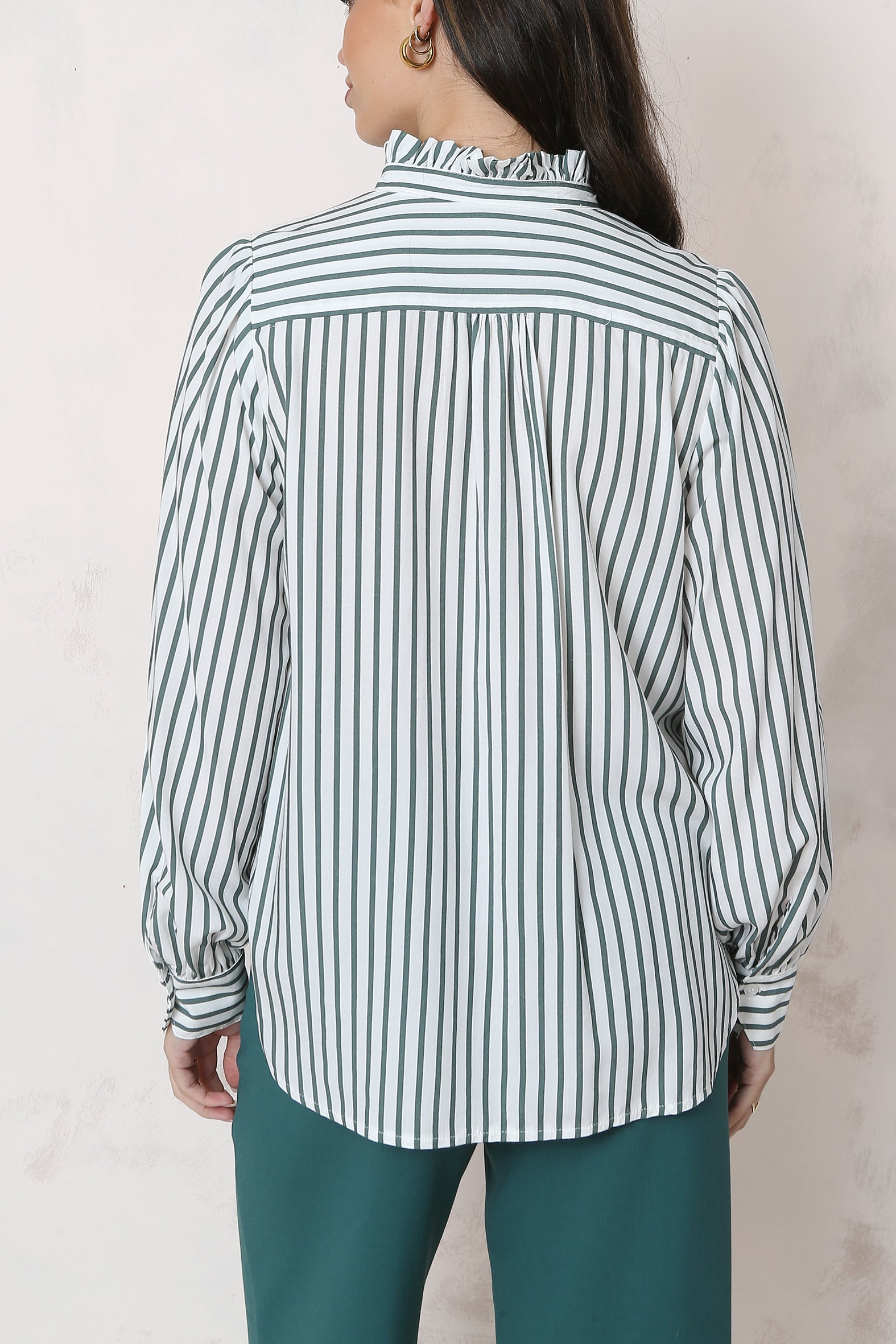 The Linear Luxe shirt is a perfect blend of timeless style and modern elegance. Featuring a ruffle neckline, button-through front fastening and tailored cuffs, it adds a touch of sophistication to your wardrobe. The floaty sleeves add a feminine, refined vibe making it a versatile piece for both work and weekend wear. Whether paired with ivory jeans like the Weekender, or tucked into the Denim Daze Skirt or with the Signature suit, it’s a stylish, conscious choice that effortlessly combines fashion and sustainability.