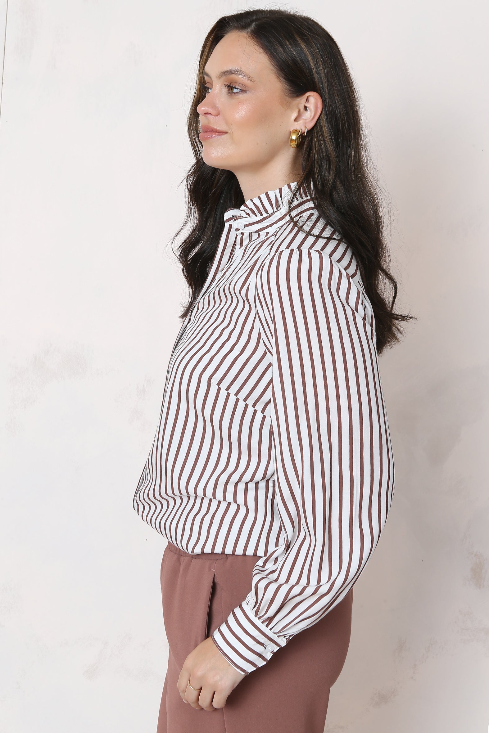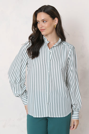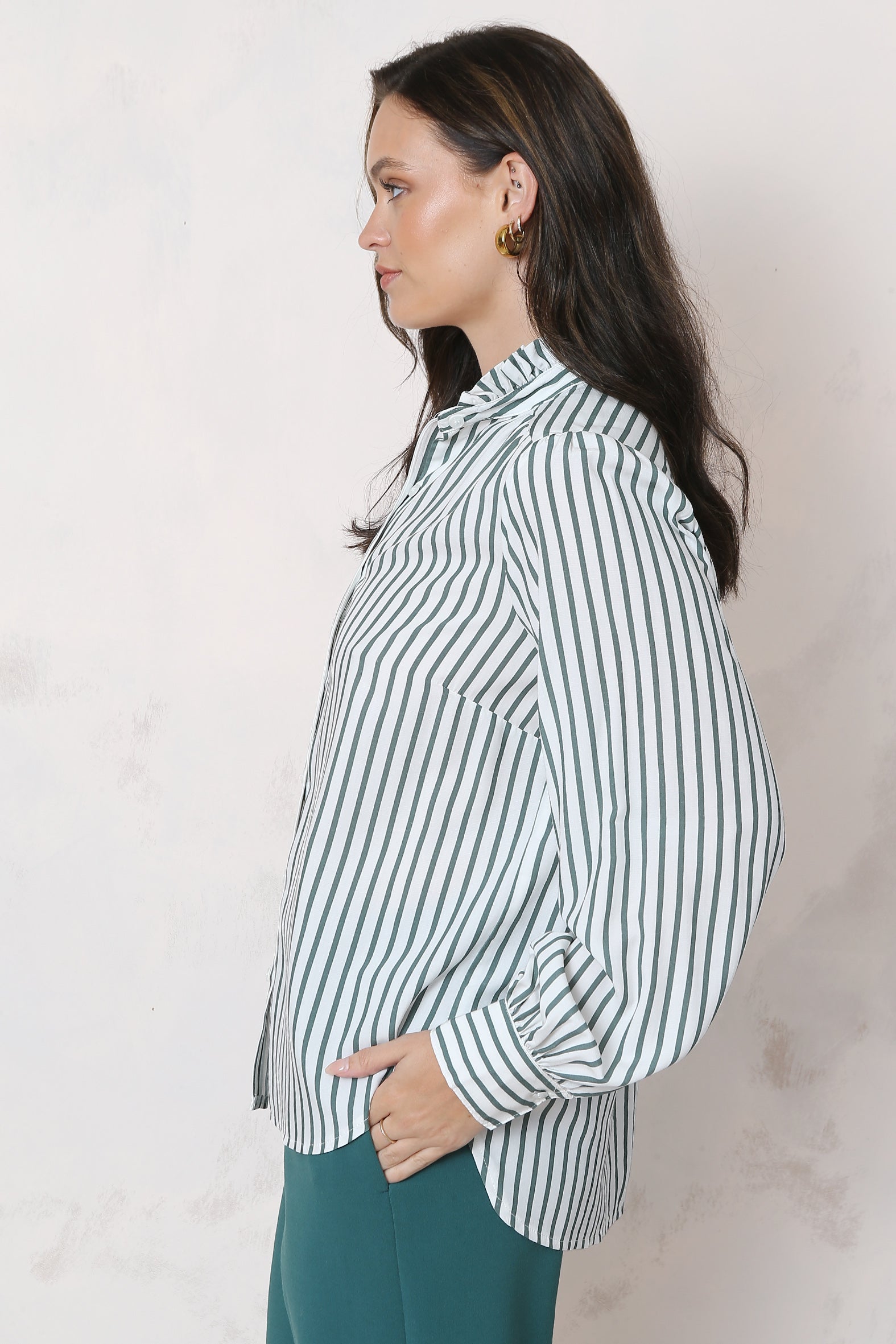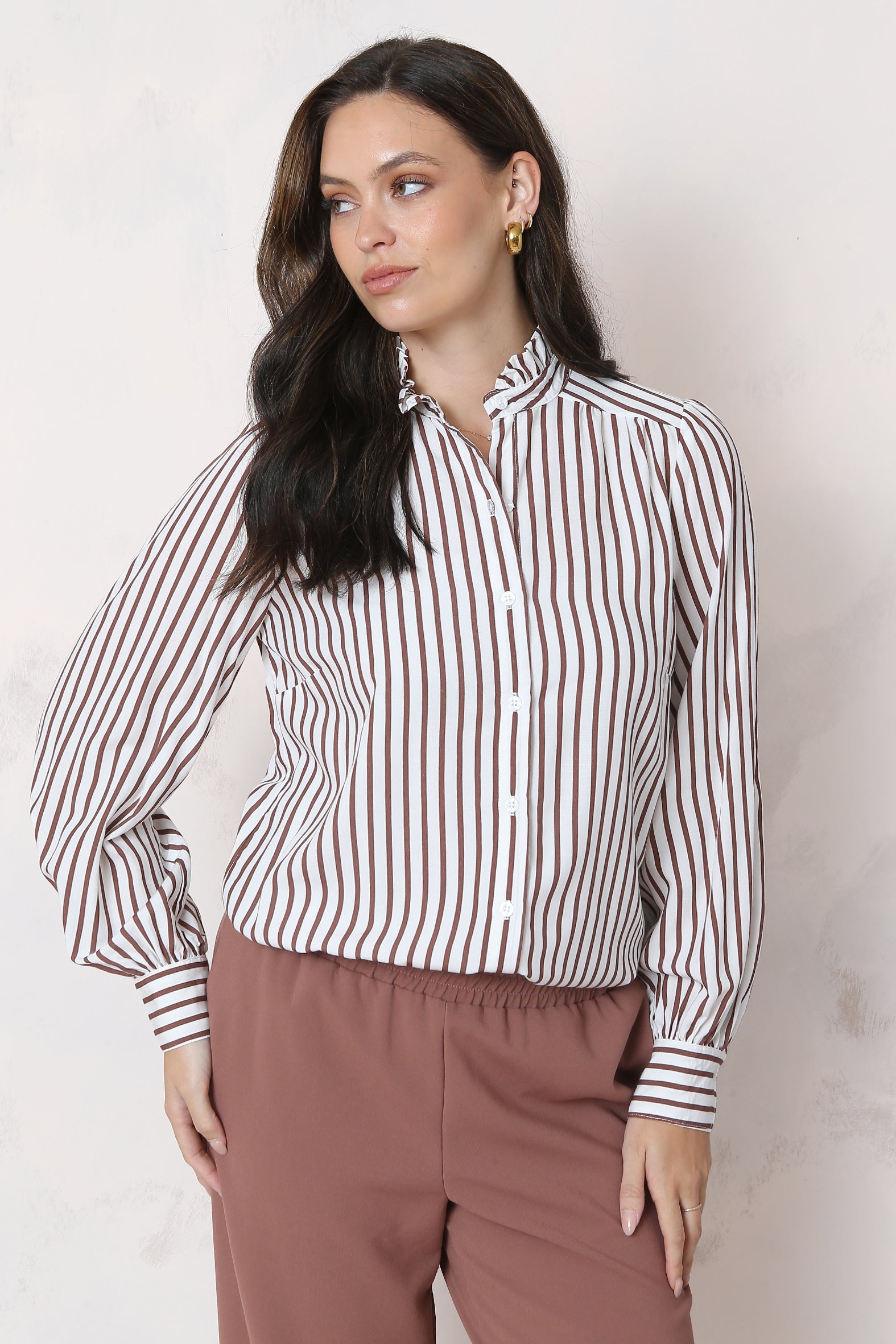 The Linear Luxe shirt is a perfect blend of timeless style and modern elegance. Featuring a ruffle neckline, button-through front fastening and tailored cuffs, it adds a touch of sophistication to your wardrobe. The floaty sleeves add a feminine, refined vibe making it a versatile piece for both work and weekend wear. Whether paired with ivory jeans like the Weekender, or tucked into the Denim Daze Skirt or with the Signature suit, it’s a stylish, conscious choice that effortlessly combines fashion and sustainability.