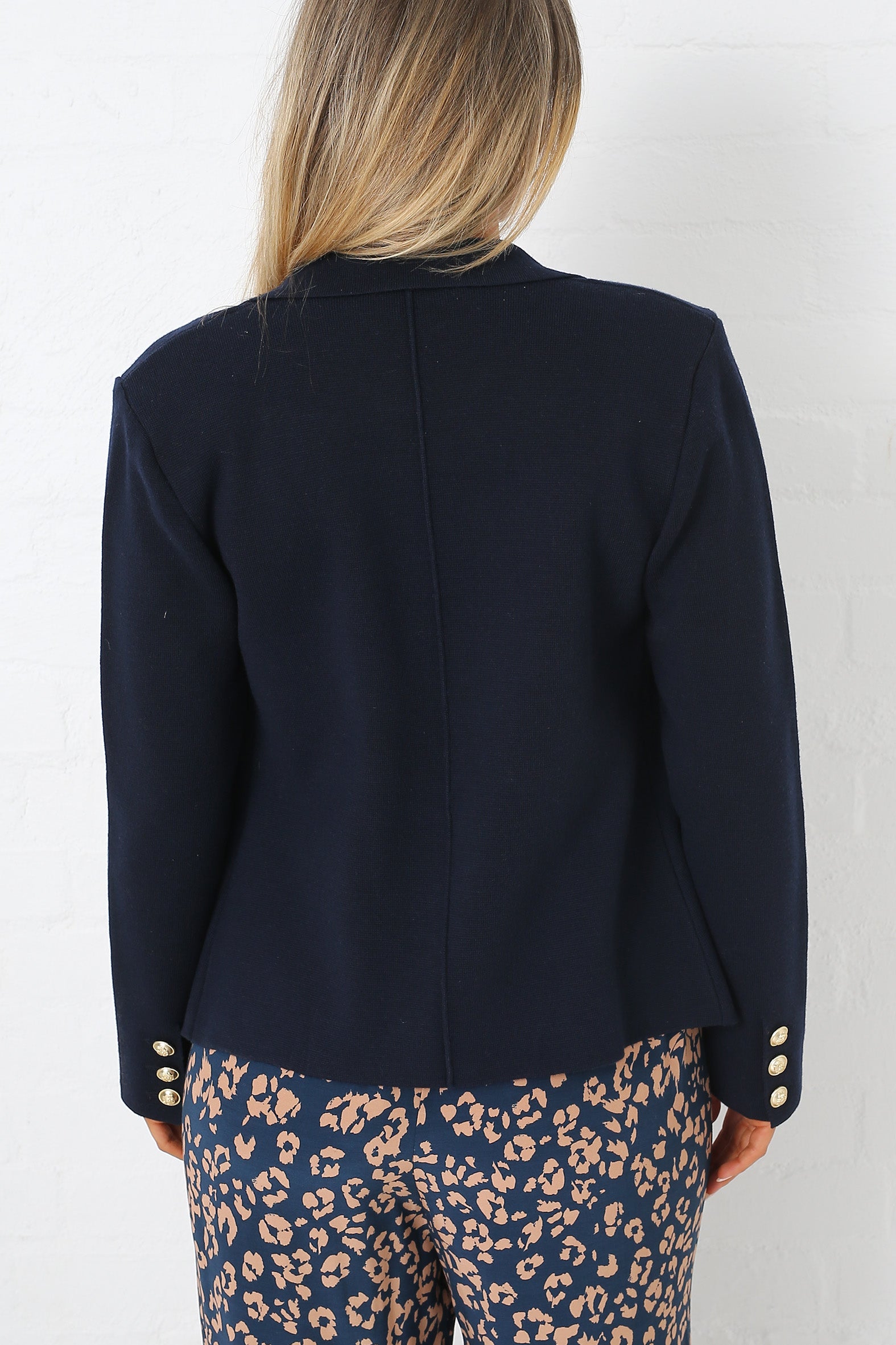 Enjoy effortless style in this timeless fully fashioned double breasted blazer combining the soft handle and comfortable stretch of a cardigan with the tailored, elegant structure of a classic blazer. Features a notched lapel collar, mock jet pockets at the front hip and striking, gold military style buttons. Unlined and gently shaped into the waist for a flattering silhouette it is the perfect blazer for trans-seasonal wear coordinating seamlessly throughout your wardrobe.