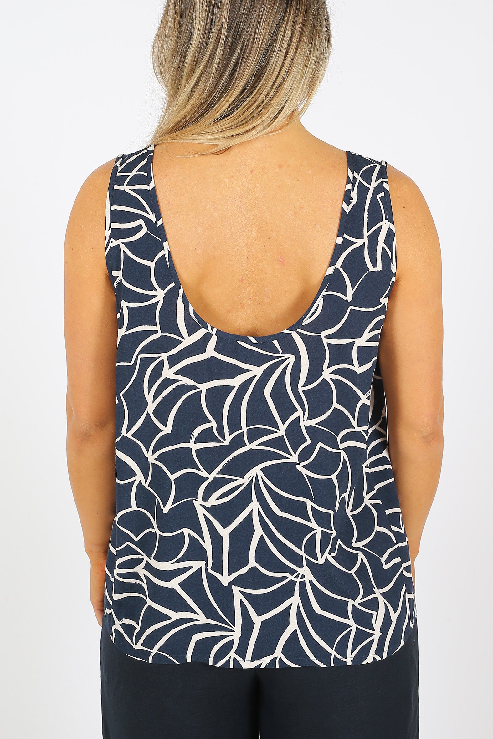Made from softly draping, sustainable EcoVero rayon crepe the Monaco Mist sleeveless tank is perfect for wearing out, tucking in and layering under jackets and cardigans. Featuring a striking navy/ivory abstract print design.