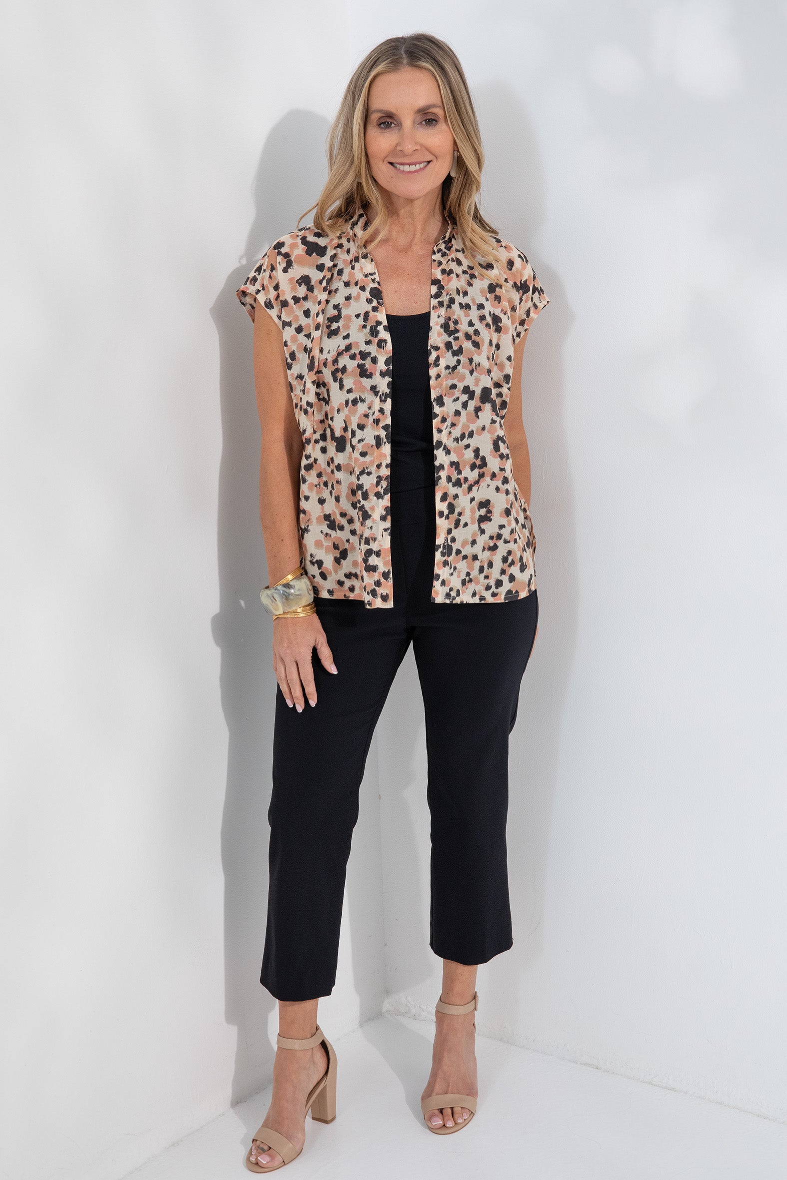 Effortless style with a sustainable edge. Crafted from a breathable Lyocell/linen blend, this printed blouse offers a soft hand feel and lightly structured drape. The extended shoulder line and notched V neckline with button-through front create a relaxed yet refined silhouette, while the straight hemline with side splits and centre back pleat add ease and movement.