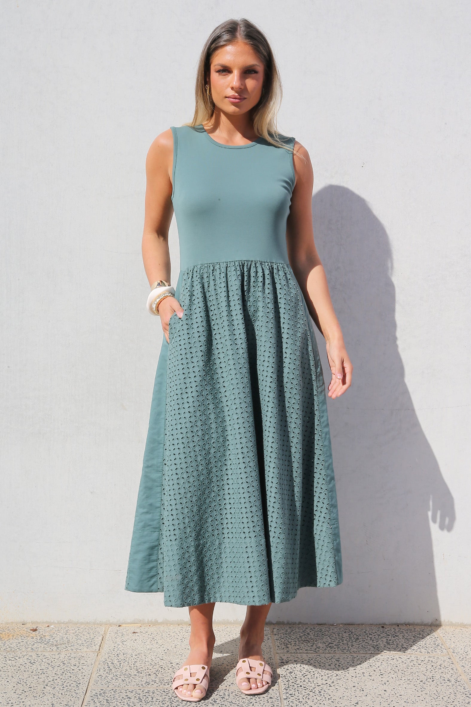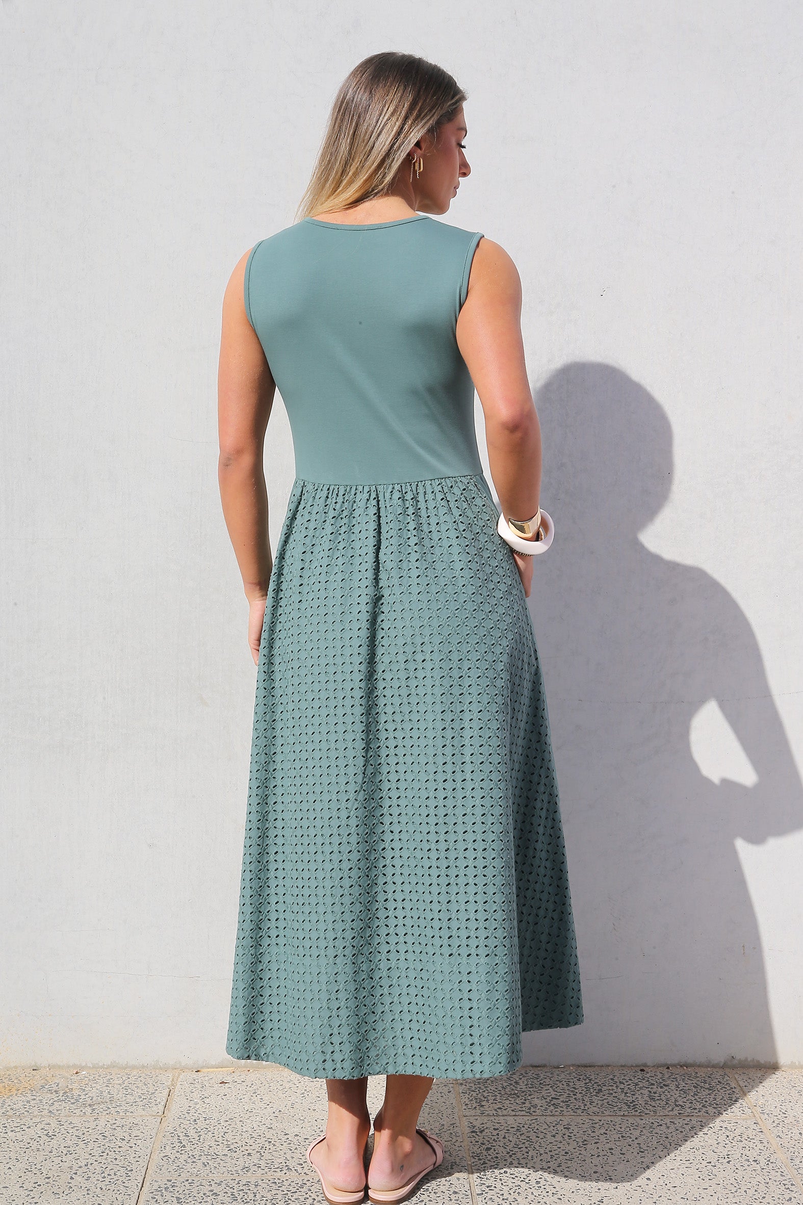 Elevate your warm weather wardrobe with this sleeveless 100% cotton maxi dress, a perfect blend of texture, detail and feminine elegance. The fitted bodice is finely knitted and features a classic round neckline. Flowing from the waist, the fully lined skirt showcases intricate, woven cut-out embroidery while colour matching poplin panels at the side seams offer soft contrast and enhance the silhouette. Designed to flatter, the skirt flares elegantly into a sweeping deep hemline, creating graceful movement. Available in a flattering soft shade of khaki it is perfect dress for summer occasions and resort escapes.