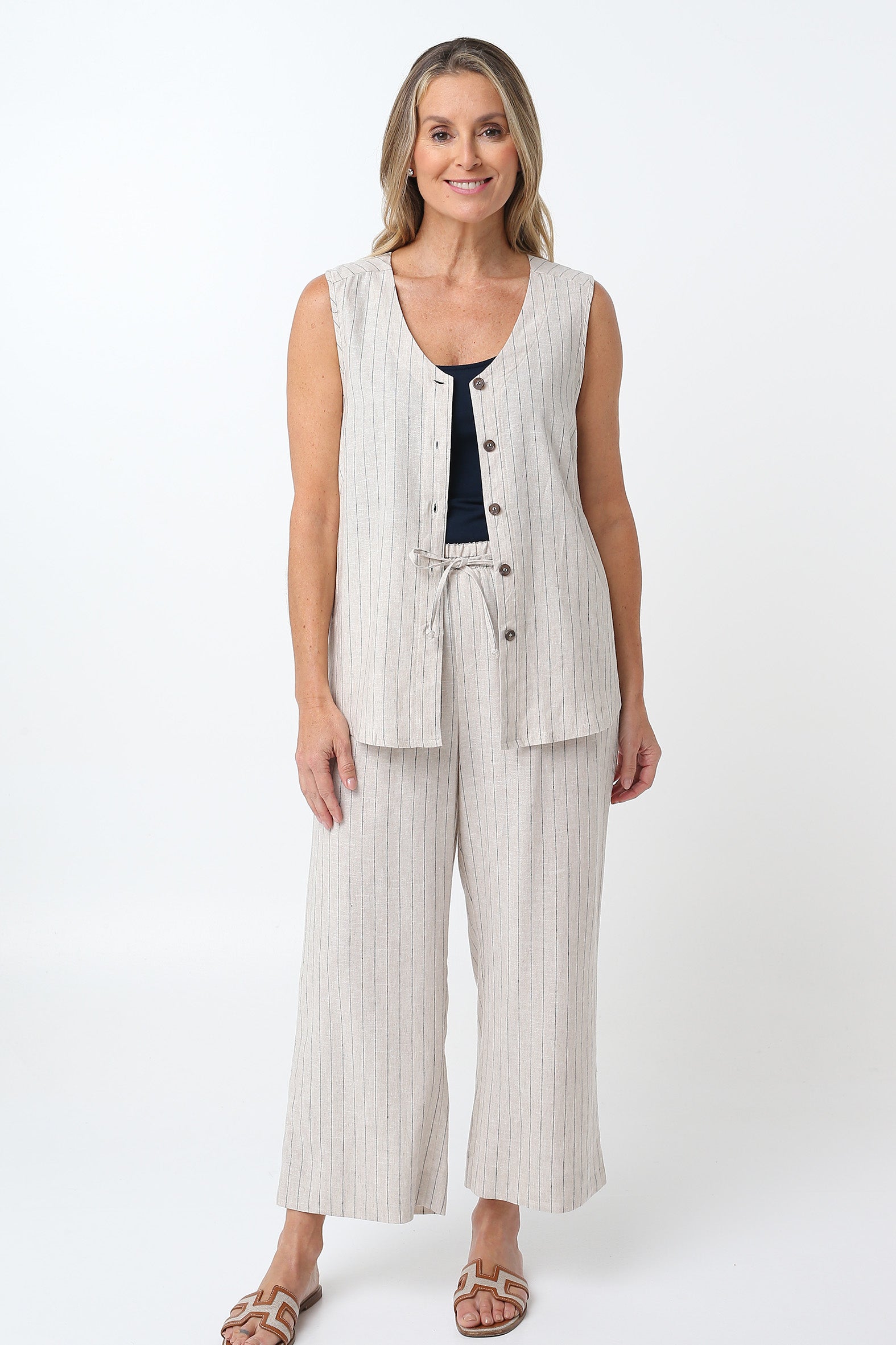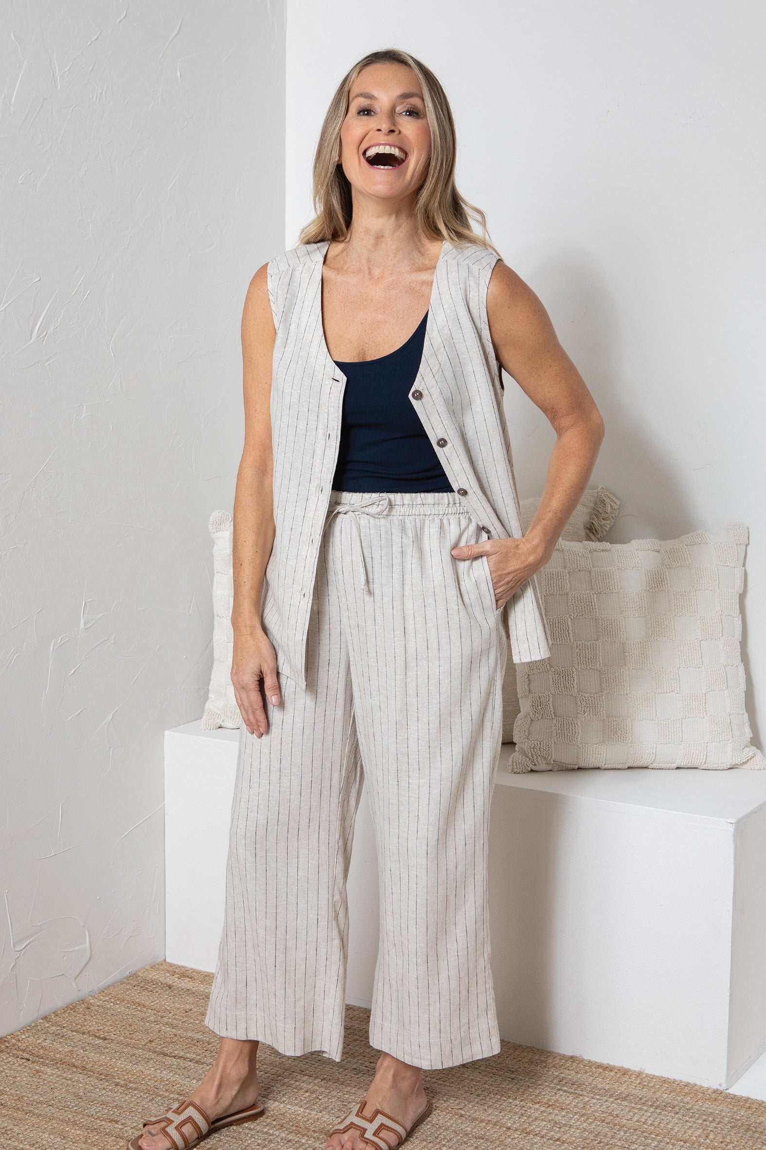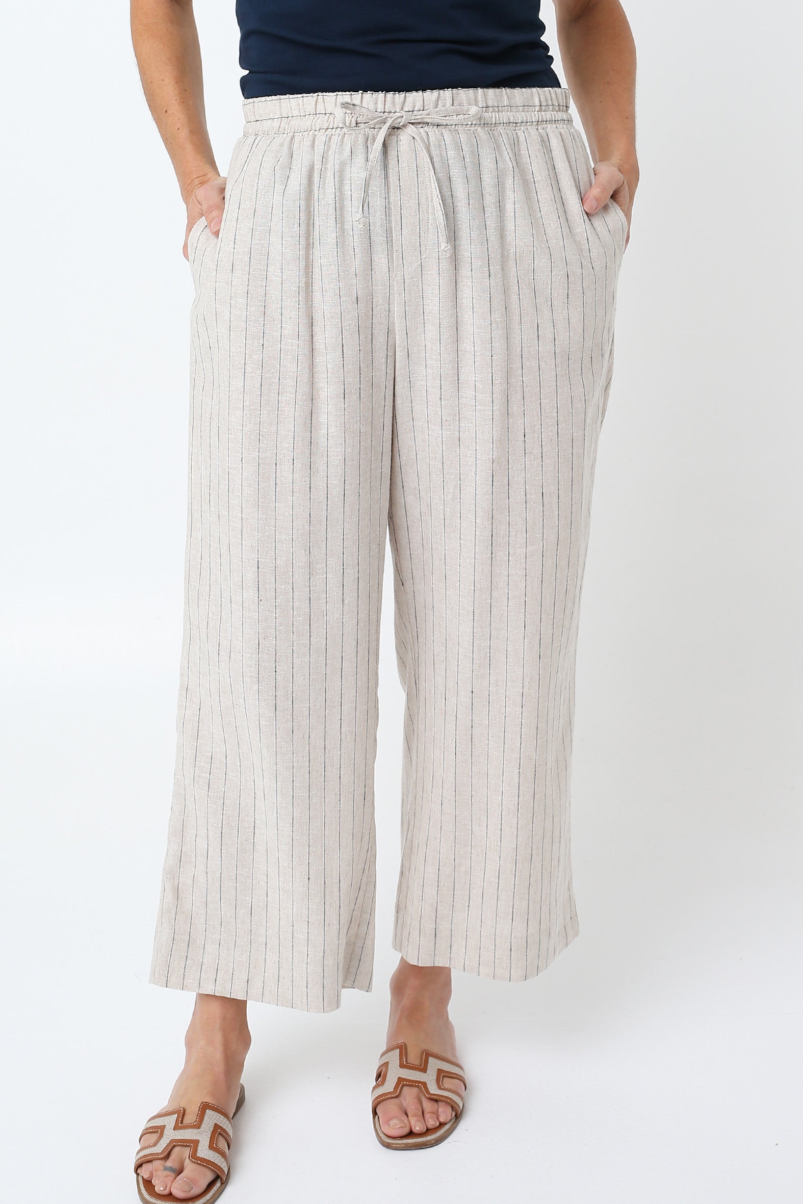 Effortless style with a timeless twist. Crafted from a breathable linen/rayon blend, these wide leg cropped pants feature subtle yarn-dyed stripes and a softly draping silhouette for relaxed spring/summer dressing. The elasticised waistband with drawcord ensures comfort and ease, while the lightweight fabric keeps you cool from day to night. Pair with the Paros sleeveless top for a coordinated look or mix and match for laid-back versatility.