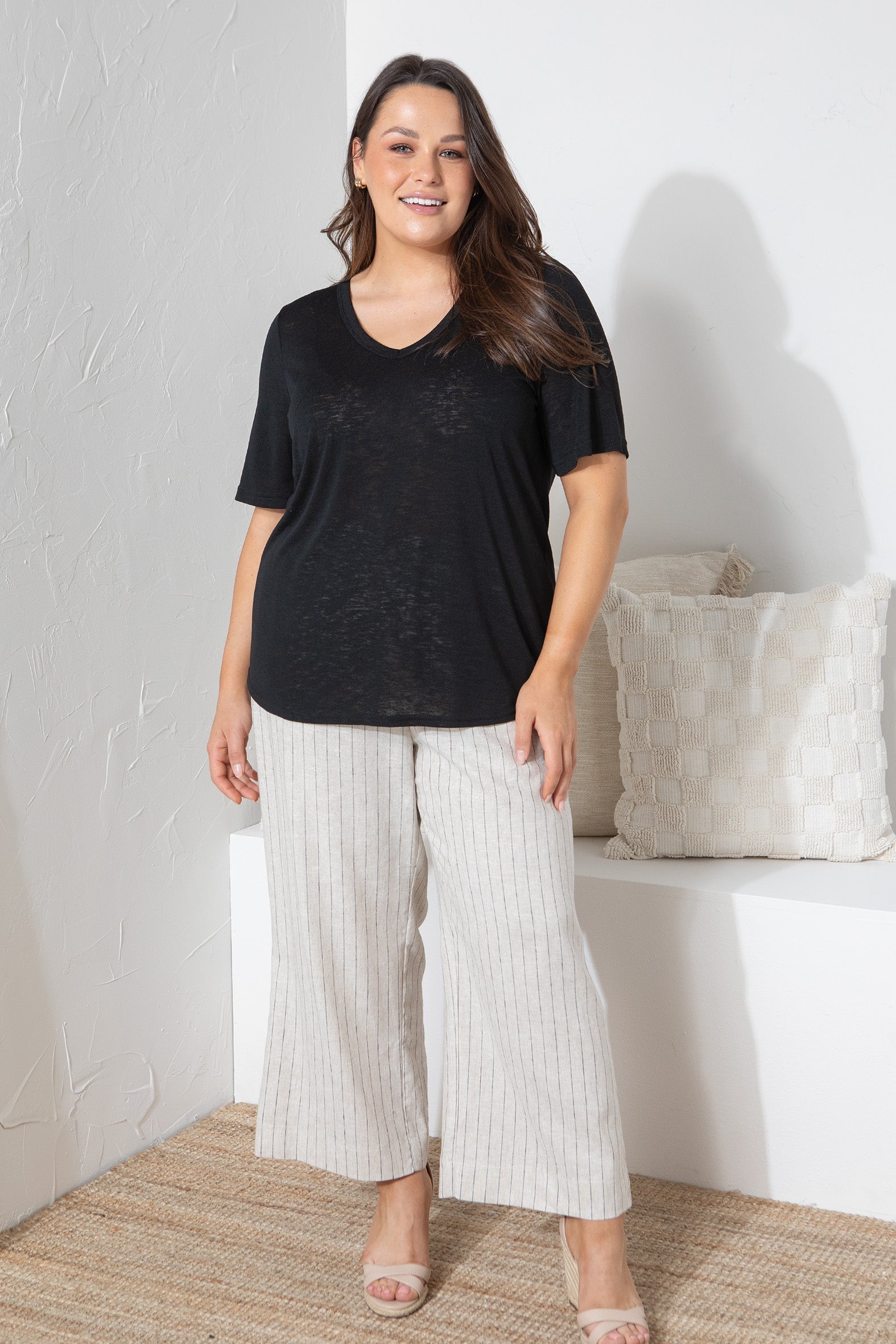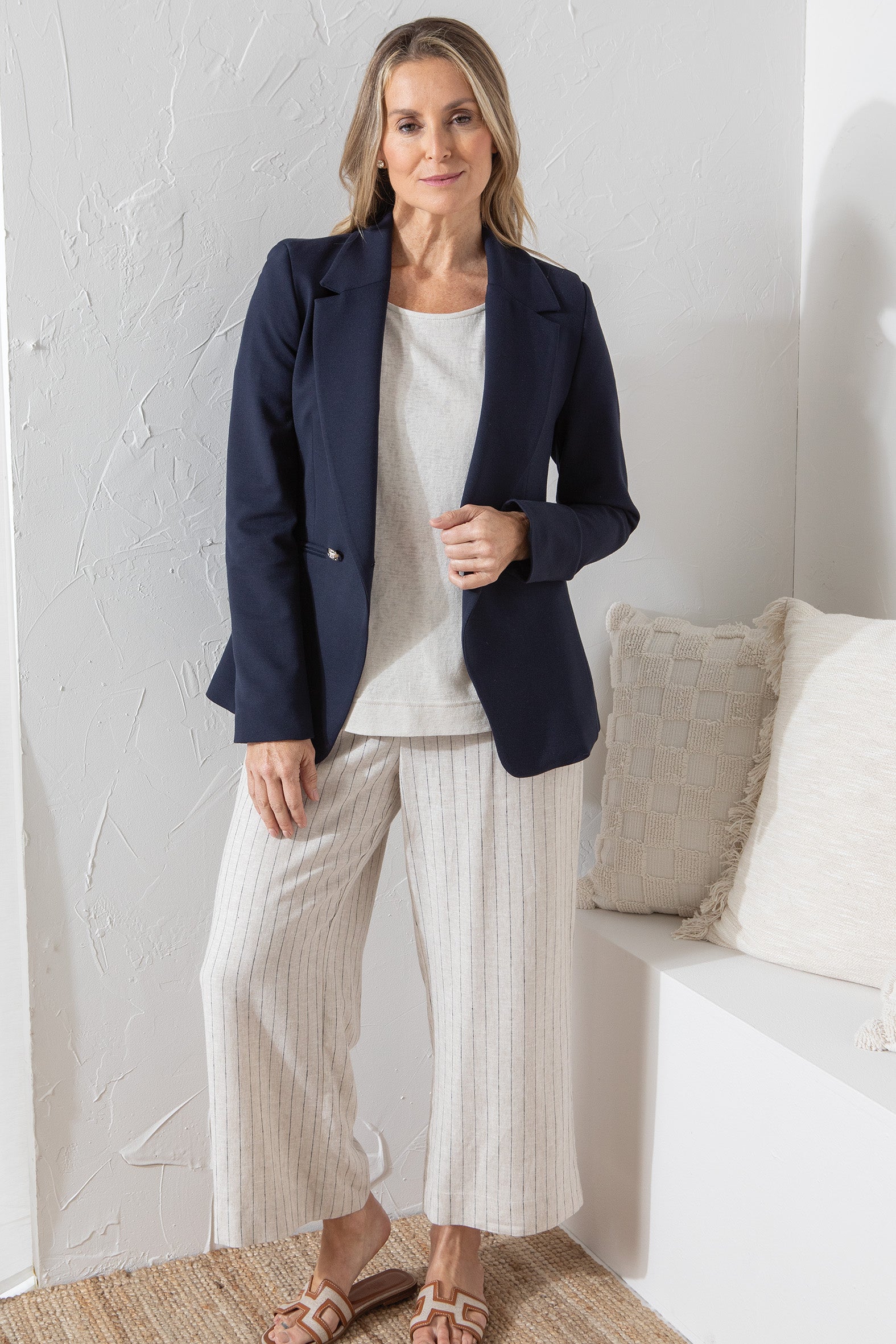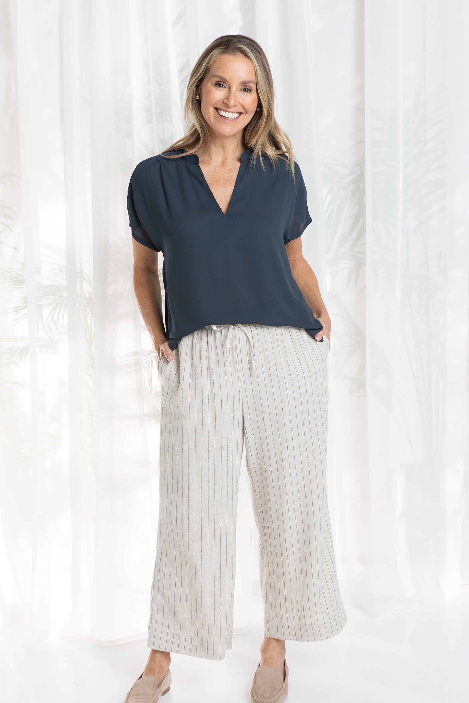 Effortless style with a timeless twist. Crafted from a breathable linen/rayon blend, these wide leg cropped pants feature subtle yarn-dyed stripes and a softly draping silhouette for relaxed spring/summer dressing. The elasticised waistband with drawcord ensures comfort and ease, while the lightweight fabric keeps you cool from day to night. Pair with the Paros sleeveless top for a coordinated look or mix and match for laid-back versatility.