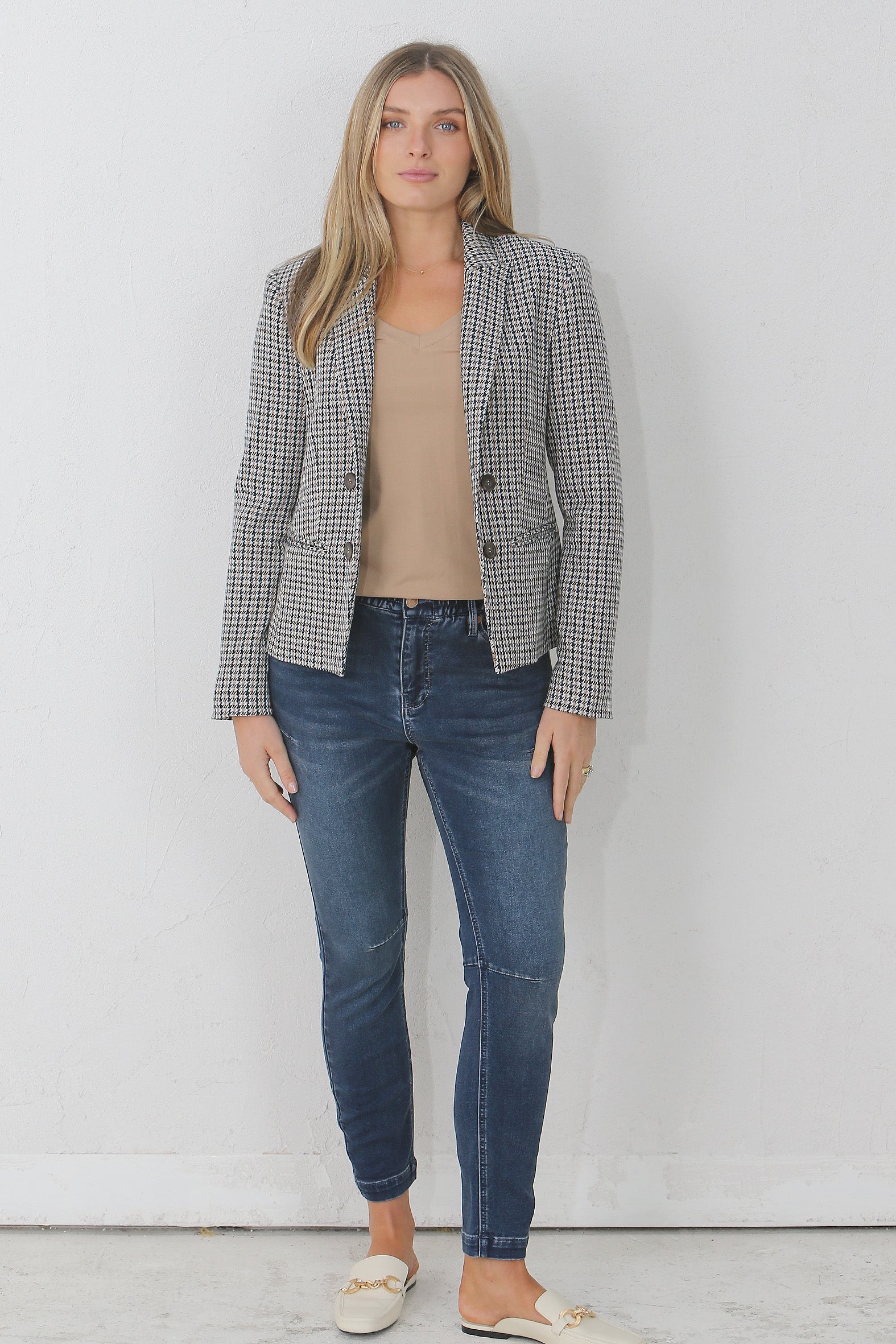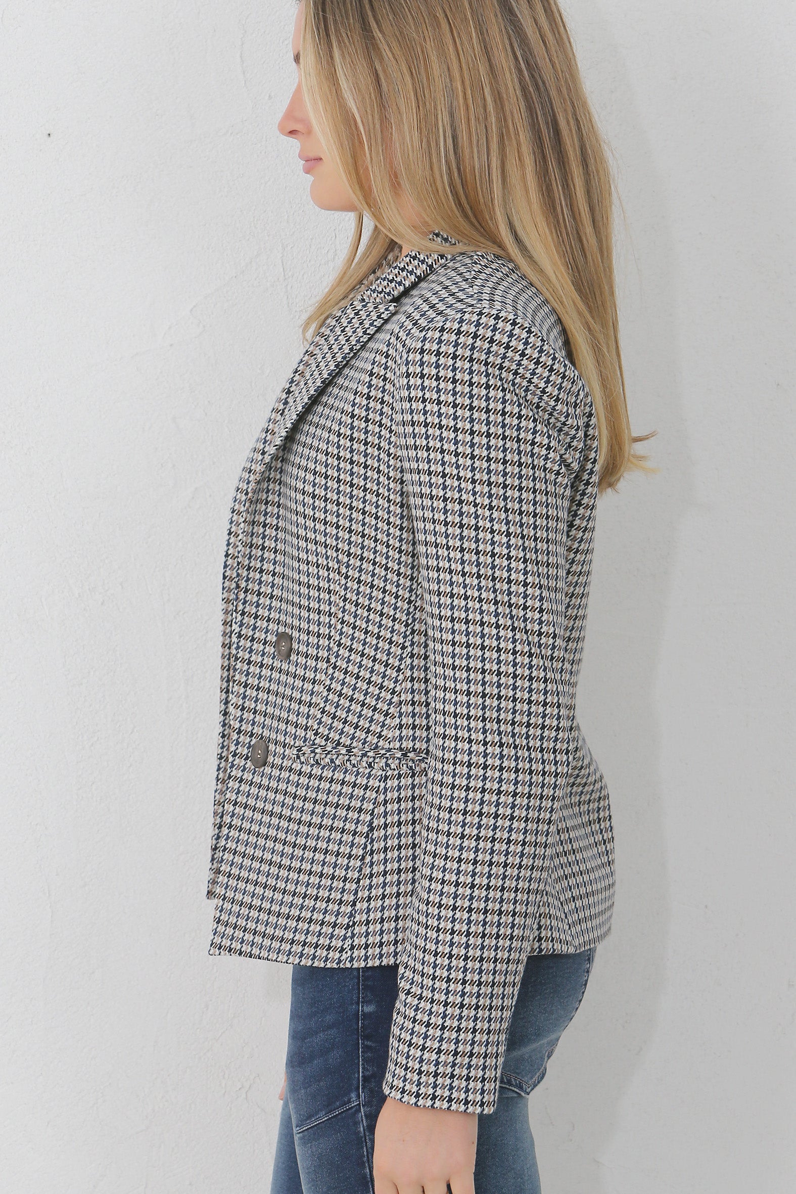 Our houndstooth check cropped jacket is carefully tailored in a flattering edge to edge mock double breasted style that is perfect for week to weekend wear. It is a statement piece which can be dressed up for the office with tailored pants and a shirt or dressed down with jeans and a tee for a casual weekend lunch. The soft to the touch houndstooth check is yarn dyed for a high quality finish.