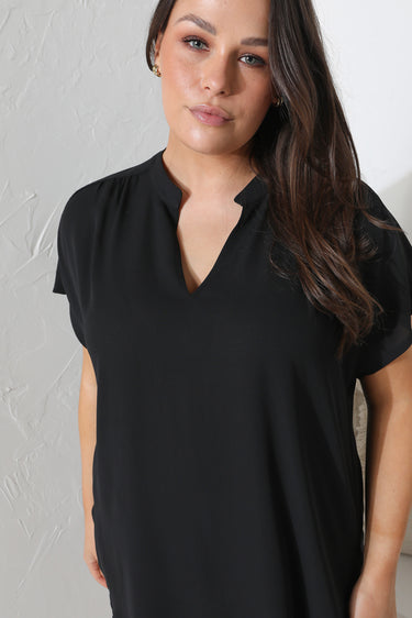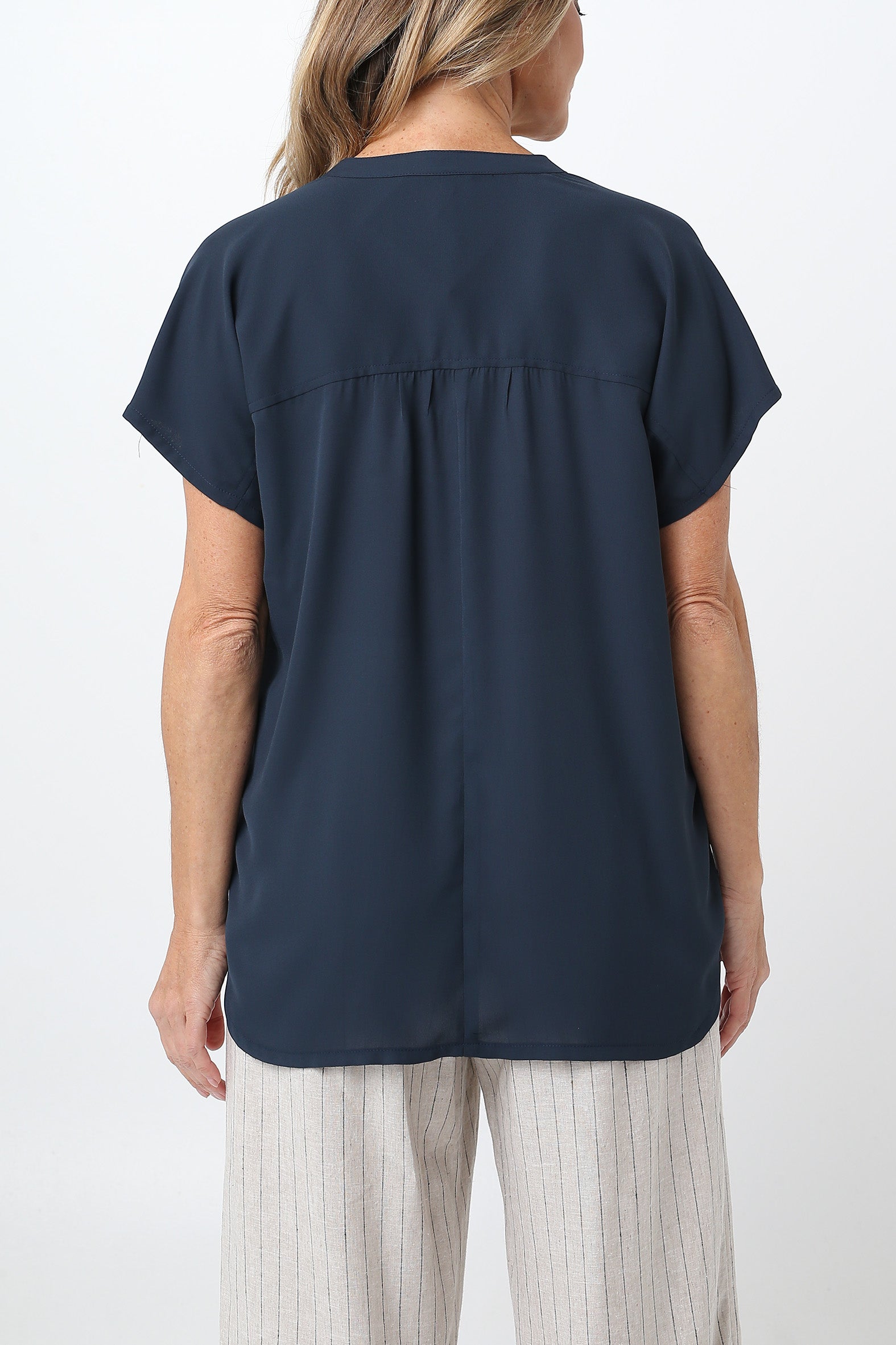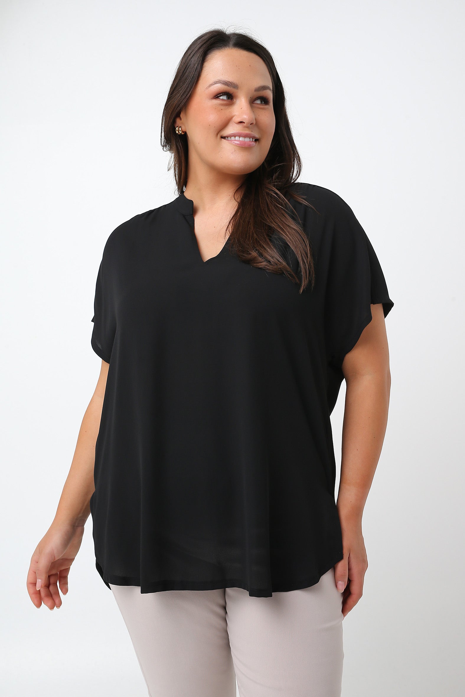 This elegant easy-to-wear blouse is crafted from eco-friendly recycled polyester chiffon. Designed with an extended shoulder for a relaxed silhouette, it features a refined V-shape notched neckline framed by a classic collar stand. The blouse is finished with a curved hemline offering a flattering shape that pairs beautifully with both casual and tailored pieces. A double fabric yoke at the shoulder enhances its structure, while soft gathers provide gentle draping and a feminine touch. The perfect work to weekend blouse, balancing effortless style with environmental consciousness.