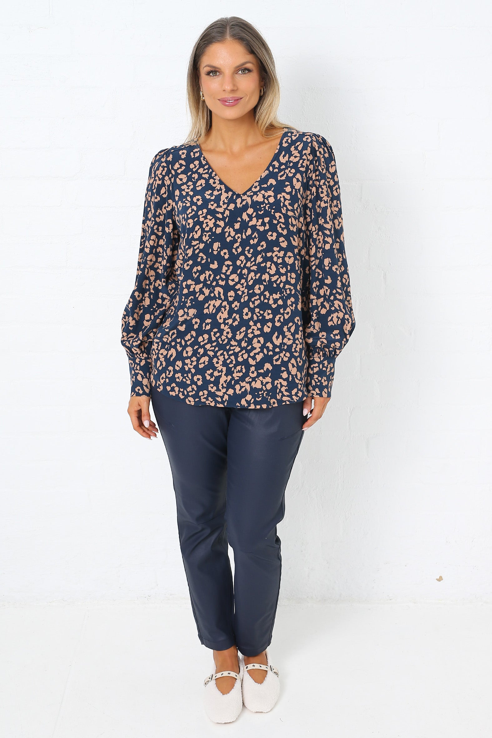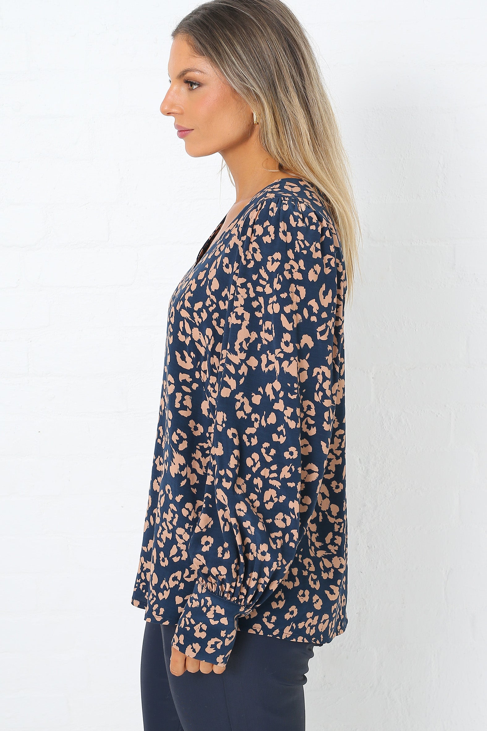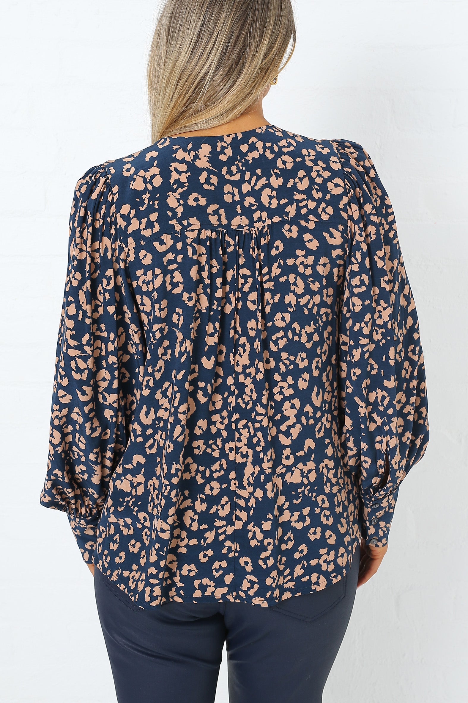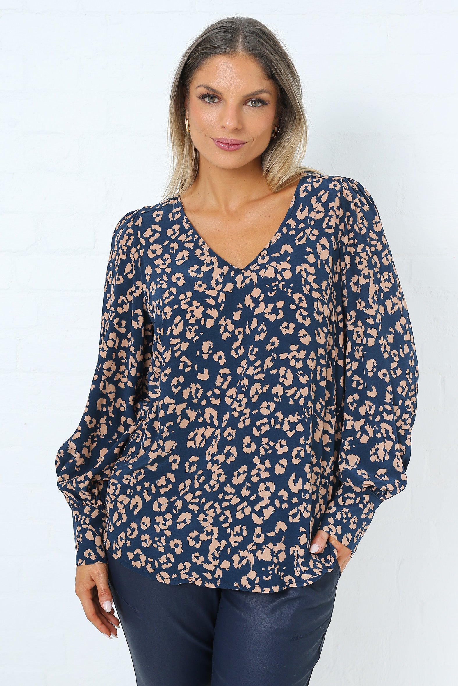 Perfect for your trans-seasonal wardrobe this flattering blouse is made from soft and silky EcoVero viscose printed with a classic mocha animal design on a navy background. Designed with an effortless easy-to-wear silhouette, perfect for wearing out or tucking in. Style it as an on-trend set with the Silken Safari pants or coordinate it with pants and jeans, then layer under a jacket or cardigan.