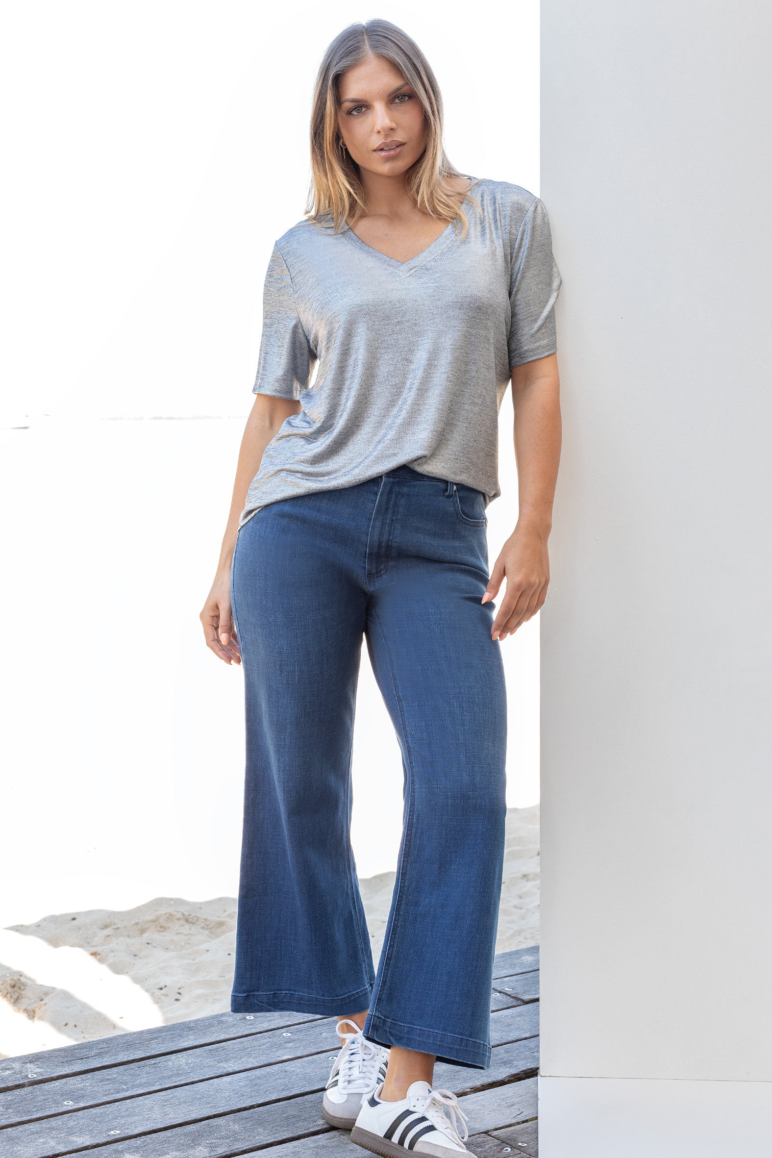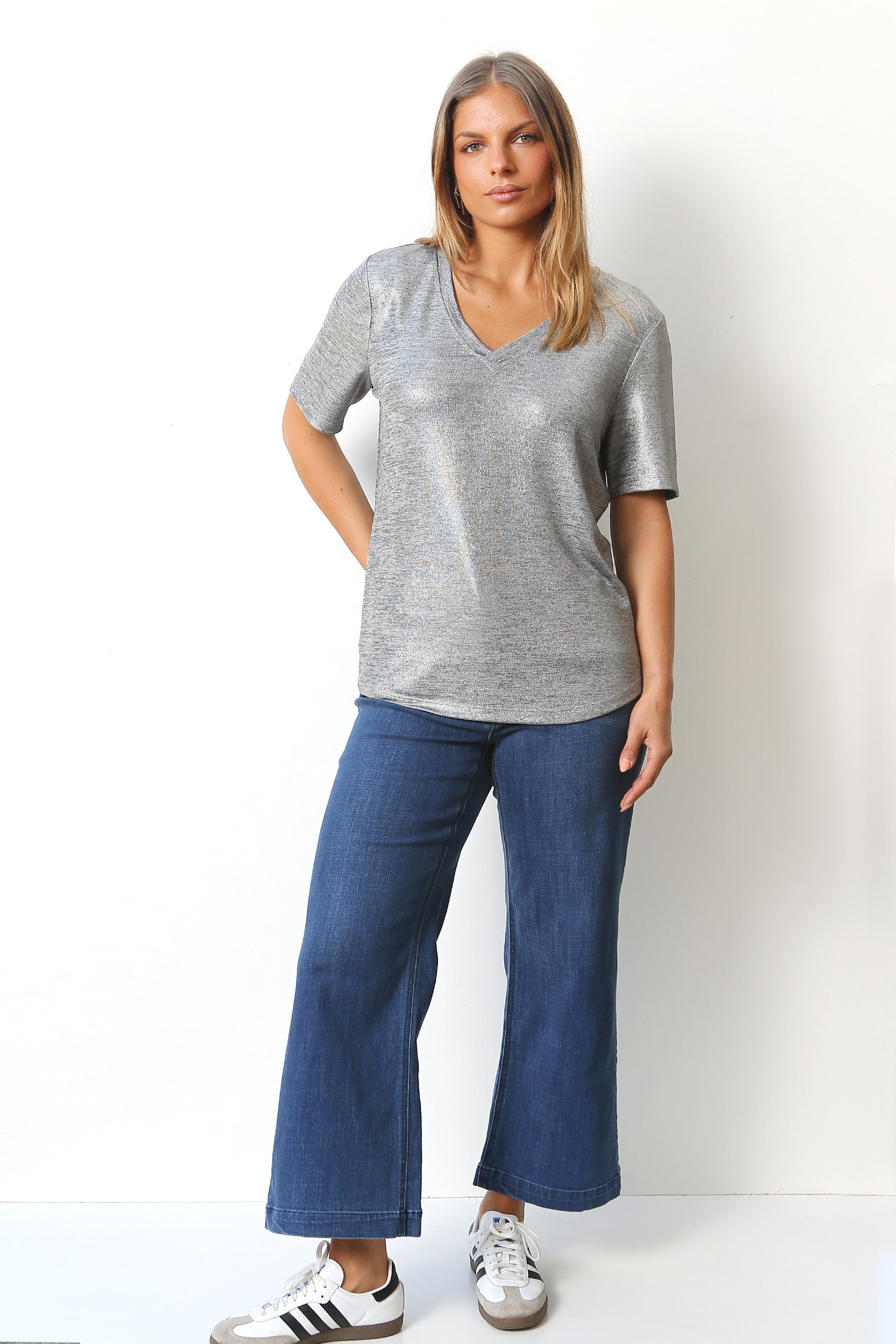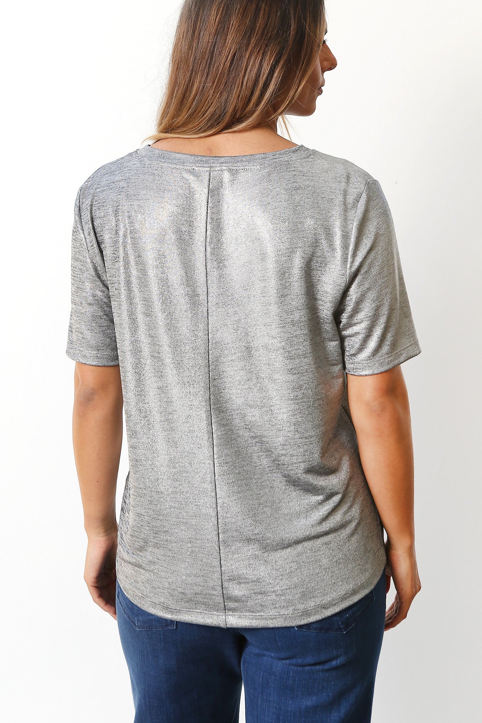 This relaxed fit short sleeve tee combines comfort and a touch of shine making it a standout piece for your casual wardrobe. Crafted from polyester/elastane single jersey knit it offers a smooth, stretchy feel ensuring all-day comfort. The fabric is coated with a subtle silver metallic print adding an eye-catching finish and the relaxed silhouette and V-neckline offer a flattering easygoing fit. Perfect for adding a touch of sheen and sophistication to your everyday look or dressing up for a laid-back evening out.