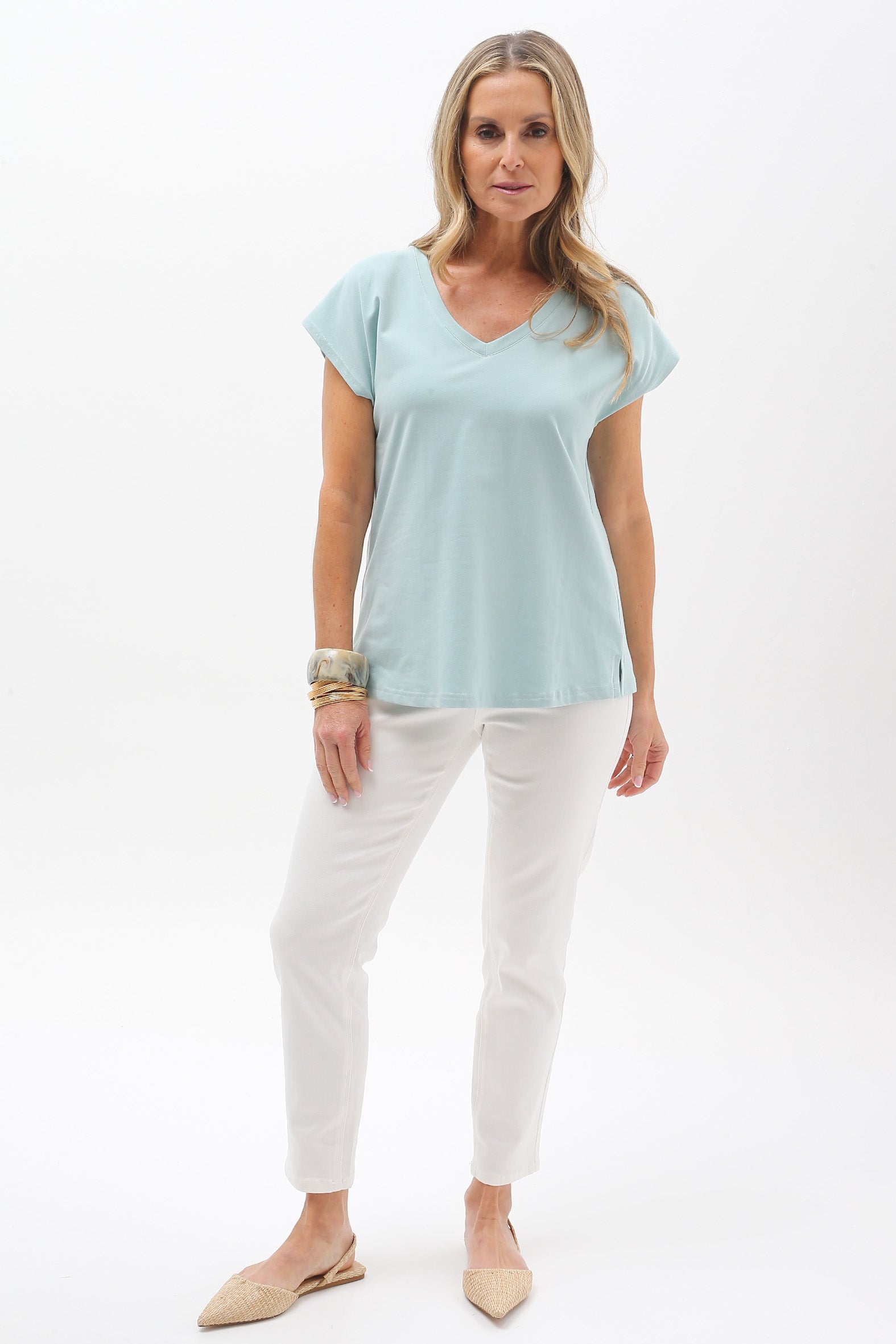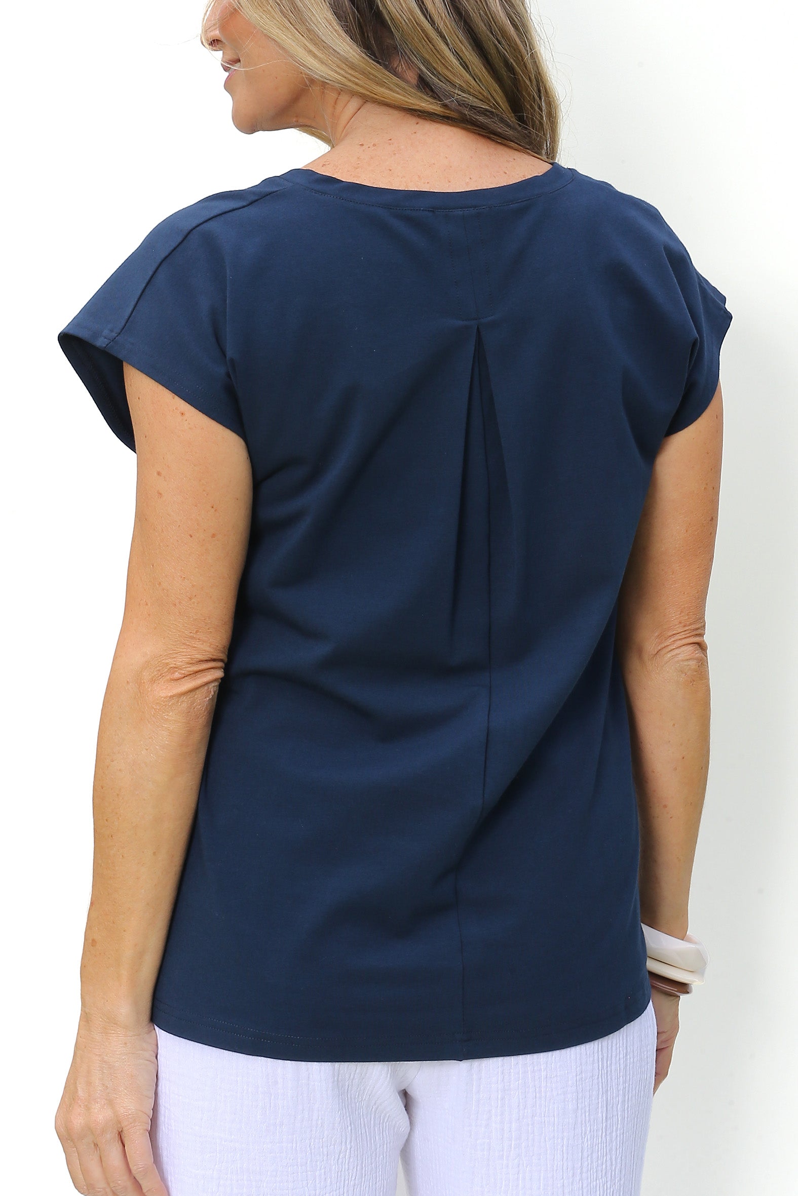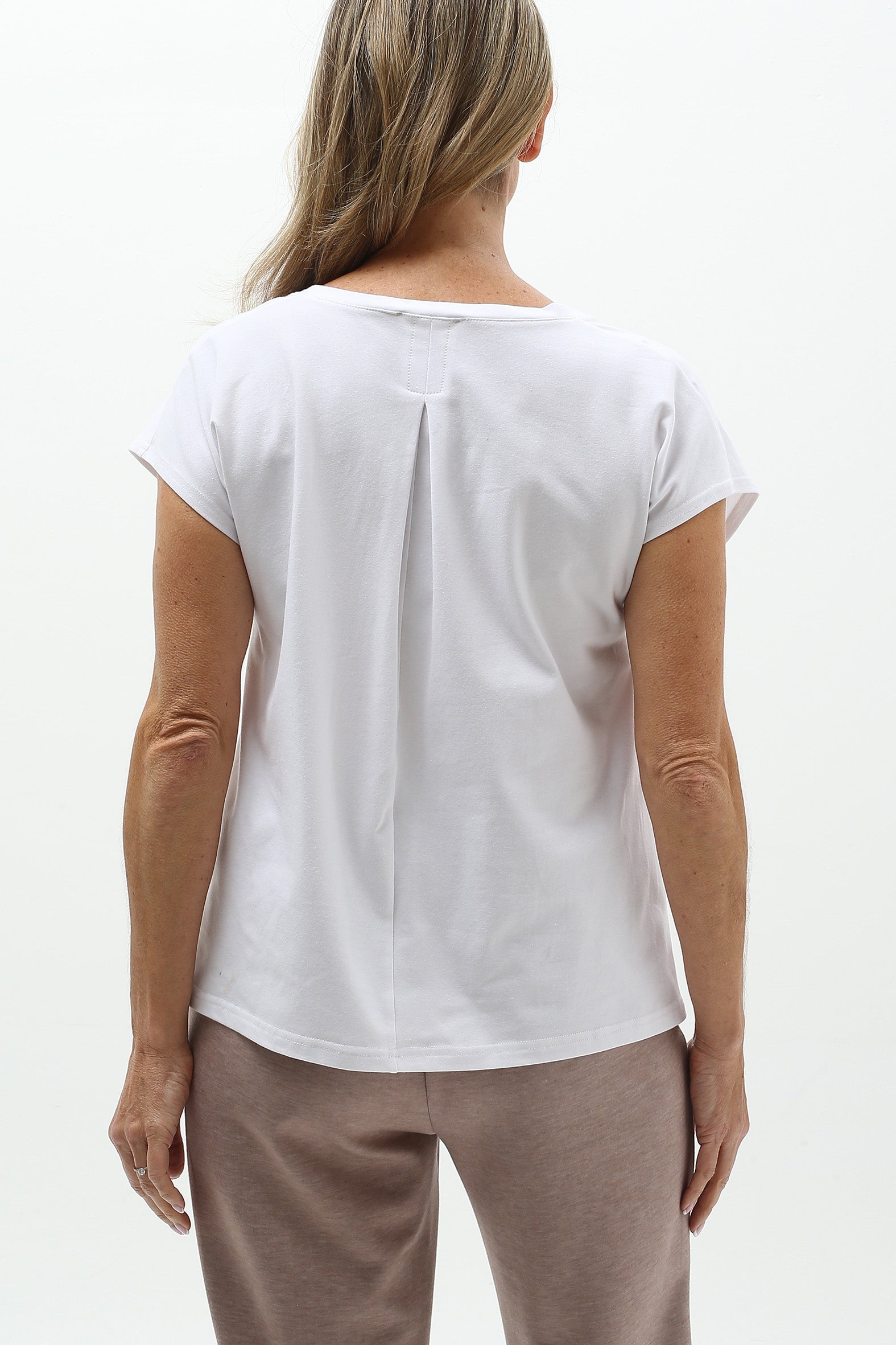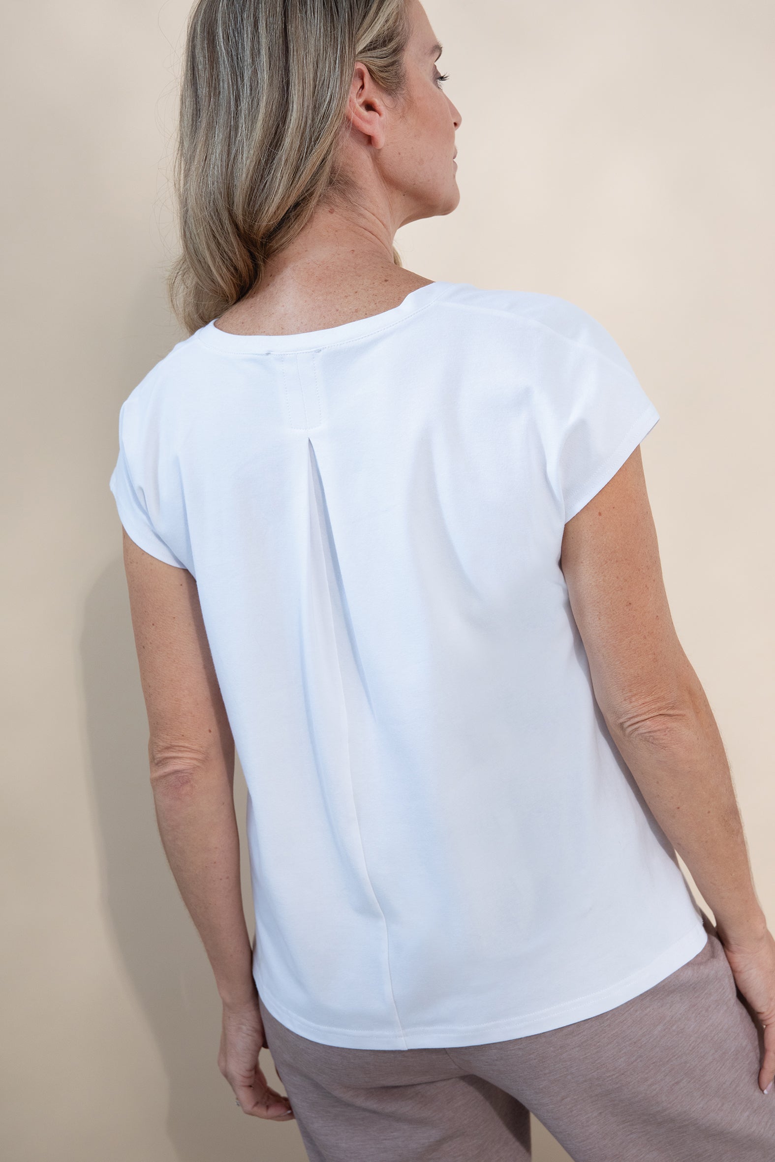 Crafted from a soft, breathable blend of organic cotton and elastane, this single jersey tee combines comfort with effortless style. Designed with a relaxed fit and an extended shoulder line it offers a laid-back silhouette with a modern edge The V shape neckline adds flattering detail while the centre back inverted pleat introduces gentle volume. The straight hemline and side splits enhance ease of wear and layering versatility. This tee is a conscious essential, perfect for everyday comfort and perfect for travelling.