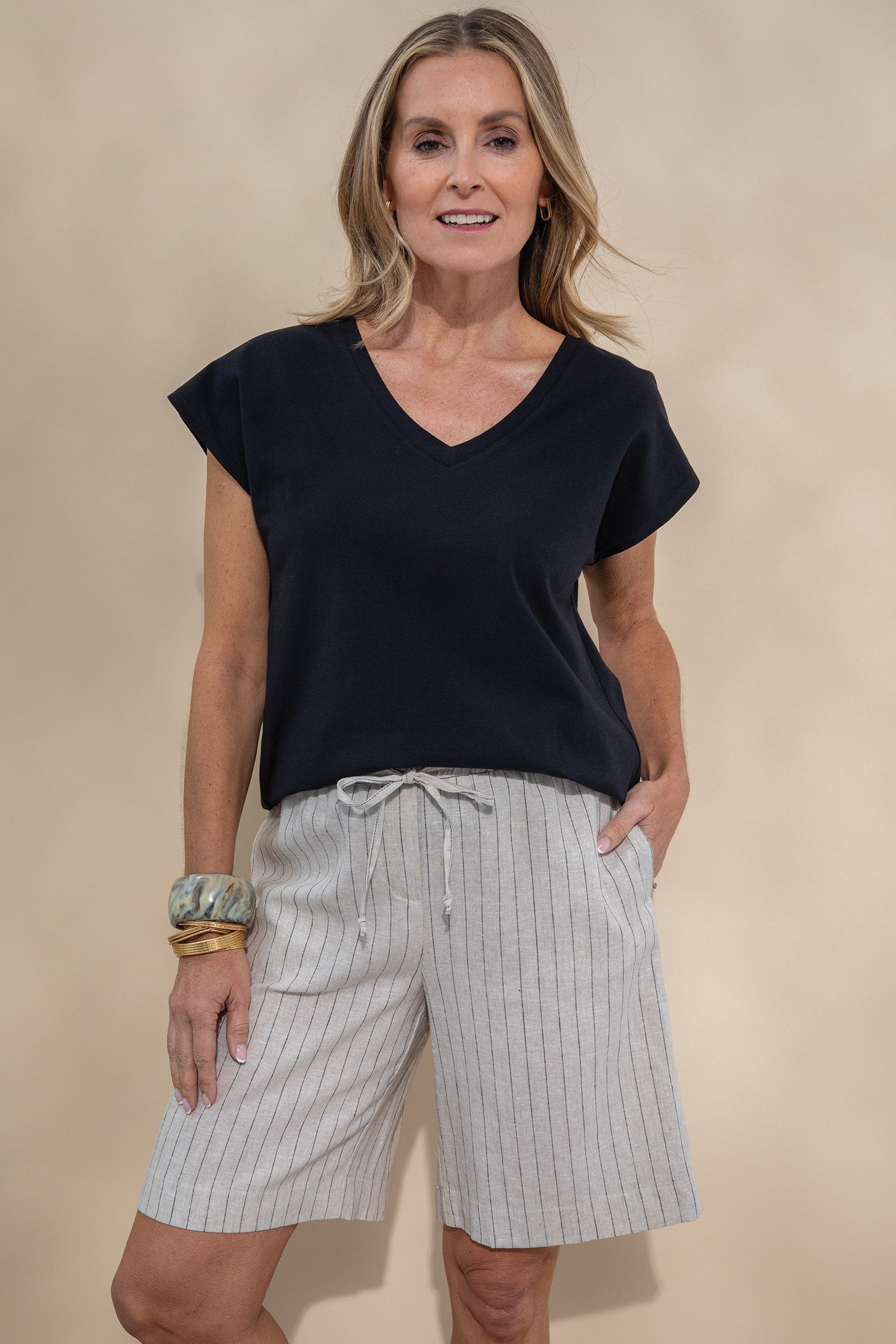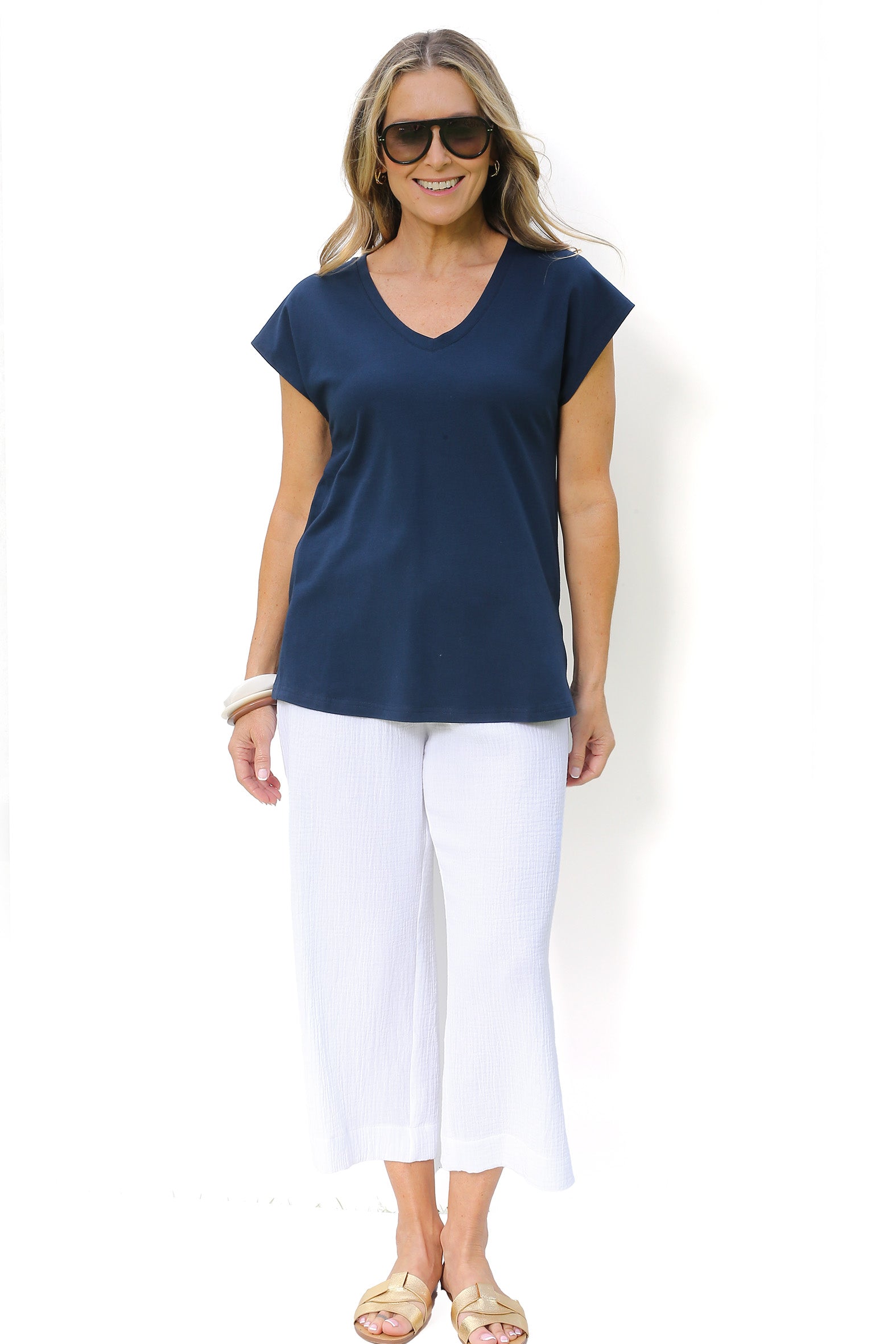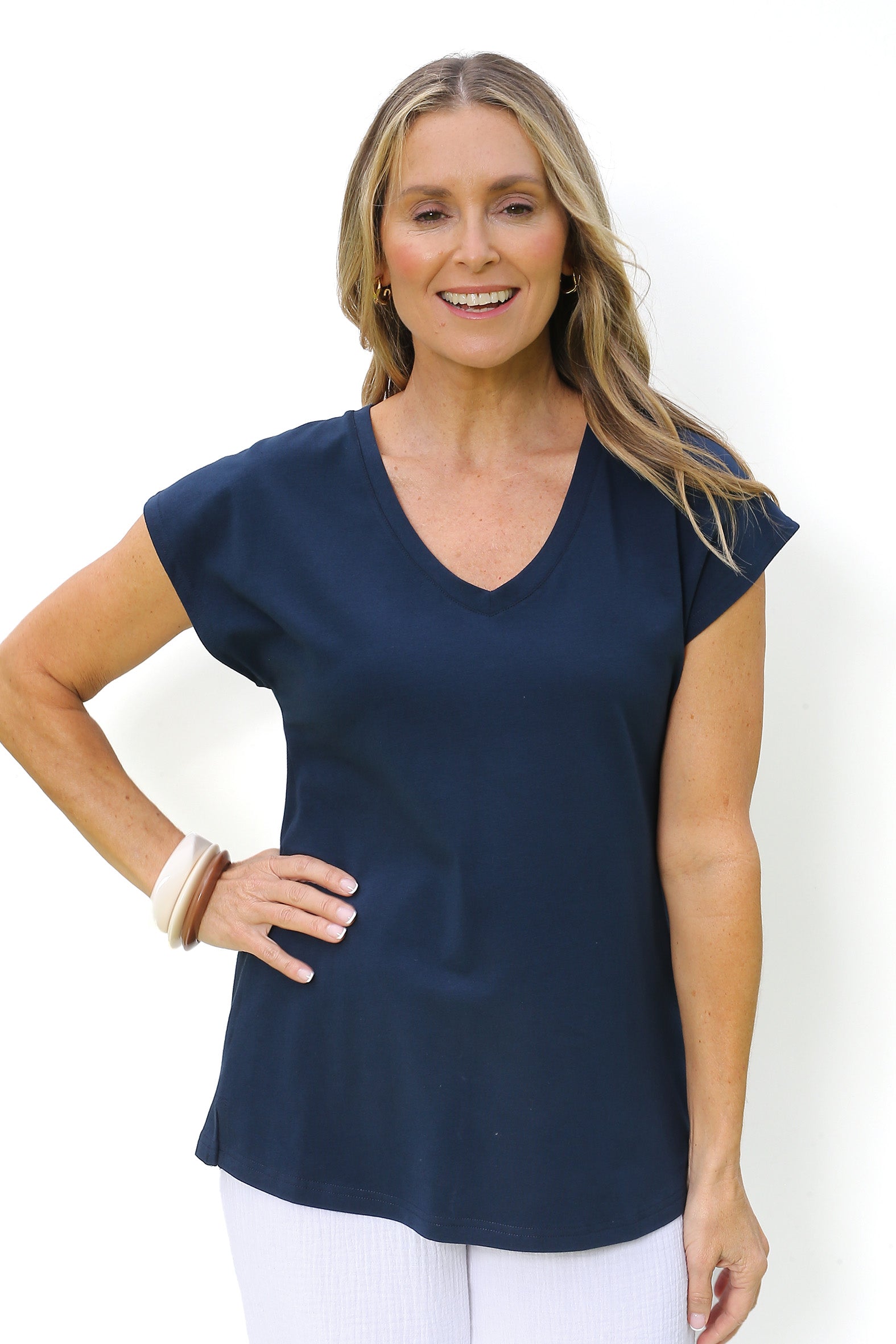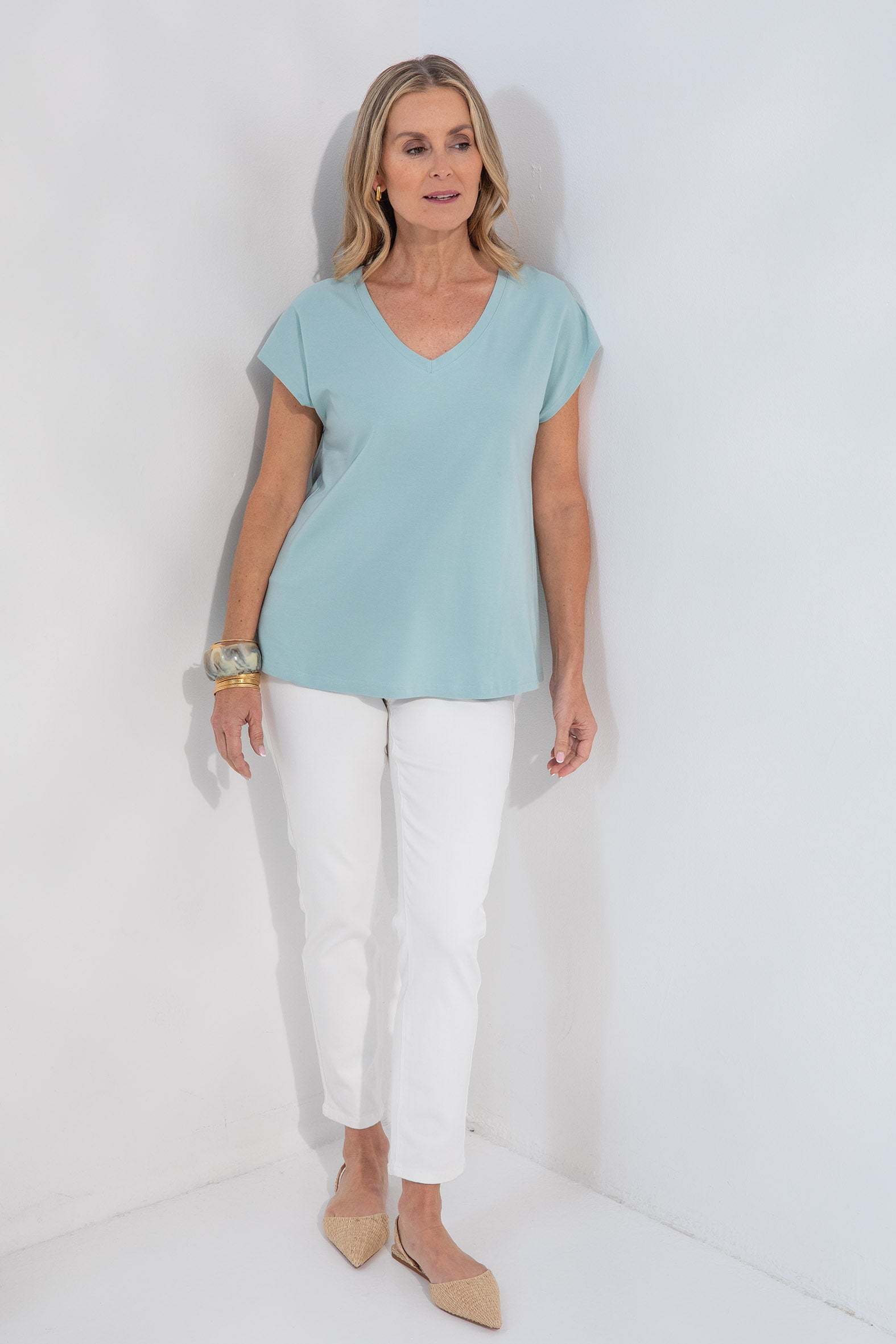 Crafted from a soft, breathable blend of organic cotton and elastane, this single jersey tee combines comfort with effortless style. Designed with a relaxed fit and an extended shoulder line it offers a laid-back silhouette with a modern edge The V shape neckline adds flattering detail while the centre back inverted pleat introduces gentle volume. The straight hemline and side splits enhance ease of wear and layering versatility. This tee is a conscious essential, perfect for everyday comfort and perfect for travelling.