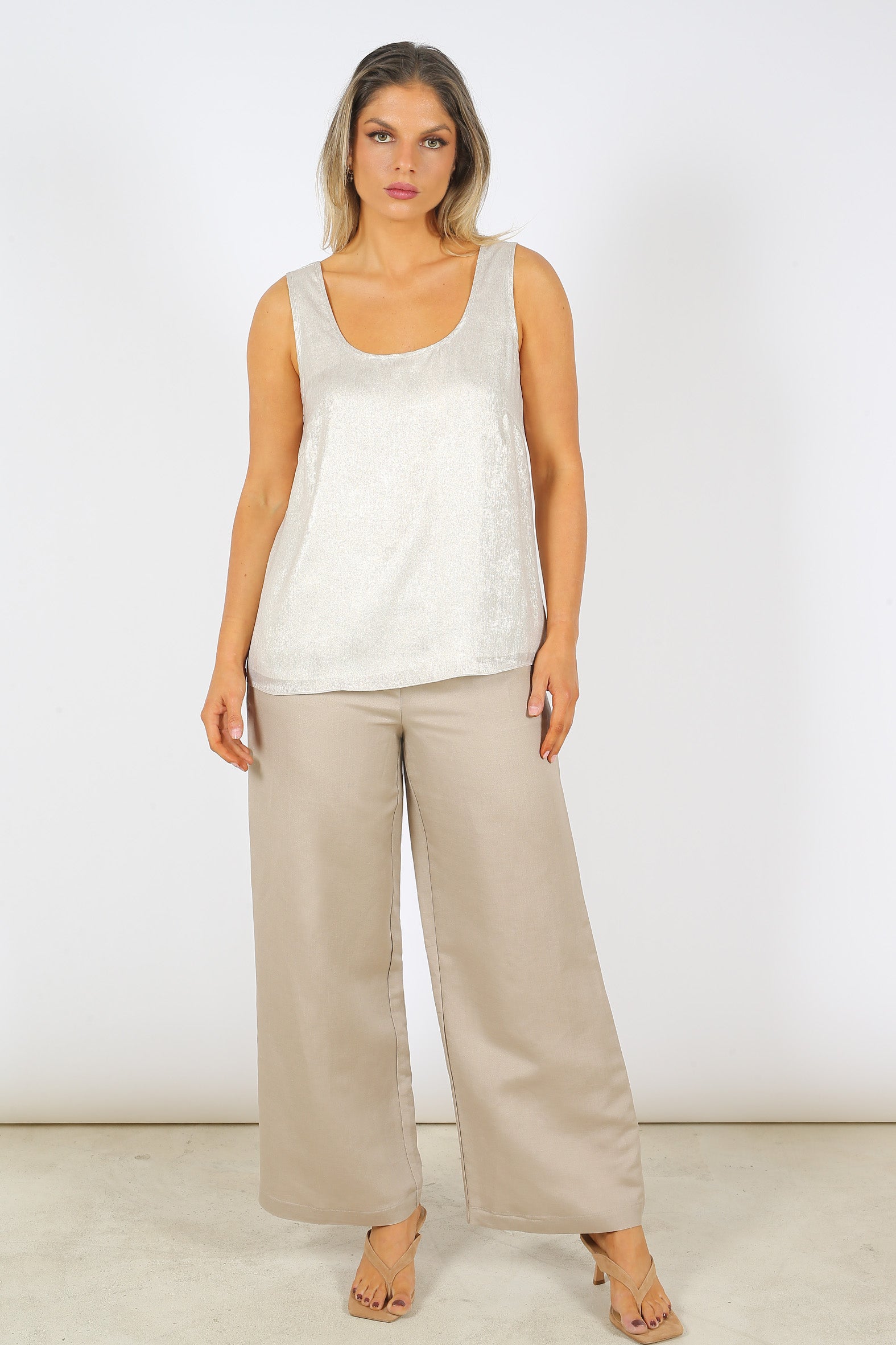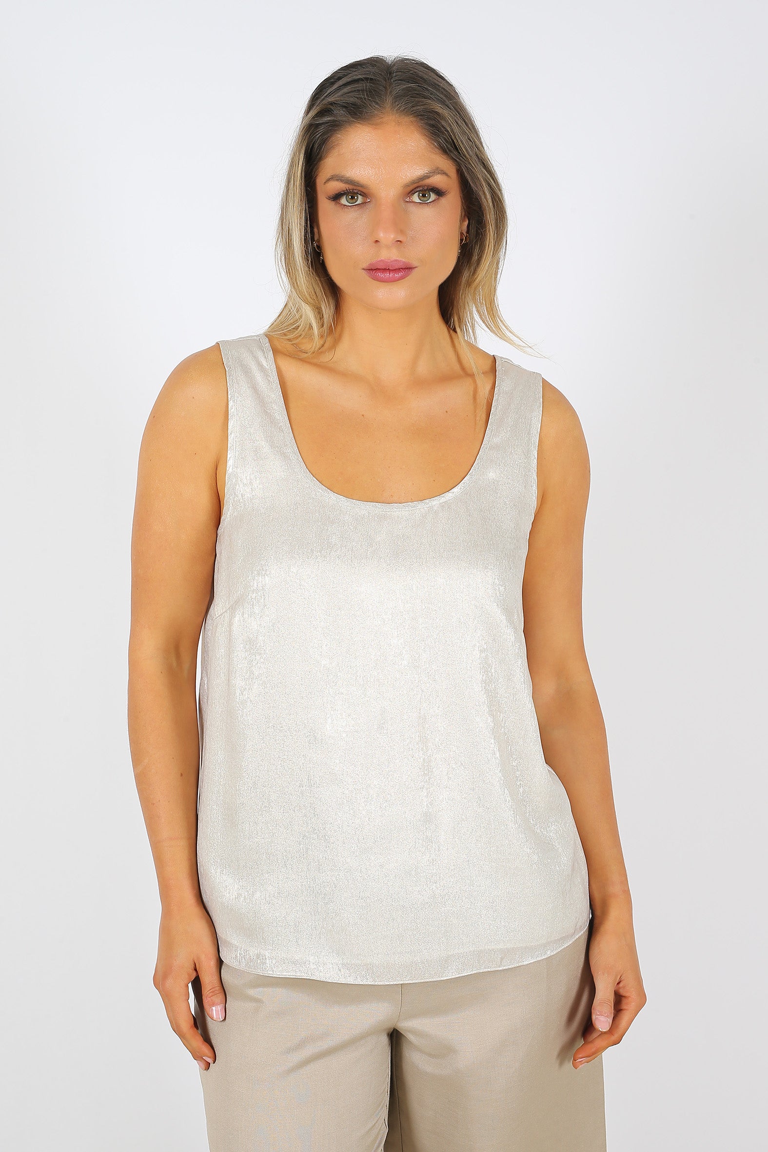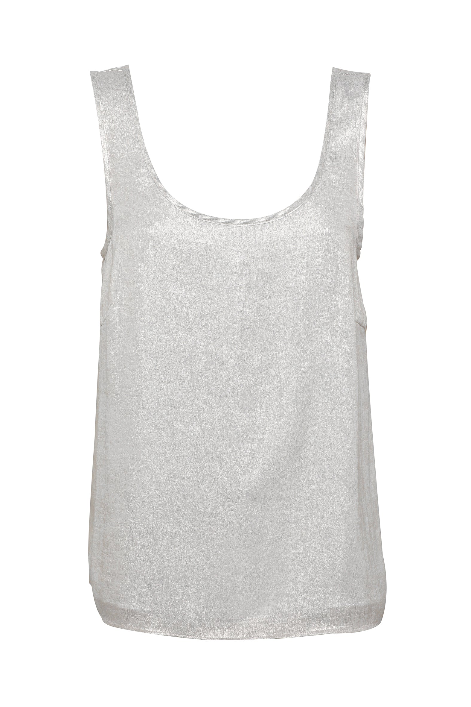 Effortlessly elegant and perfect for layering, our sleeveless tank is crafted from softly draping, recycled polyester with a shimmering foil print on an ivory background. Designed with a flattering scooped neckline both back and front and a straight hemline for a minimalist look, it is lined at the front with colour matching polyester chiffon. A versatile choice for your spring summer wardrobe, coordinate it with pants, jeans and skirts for date night glamour.