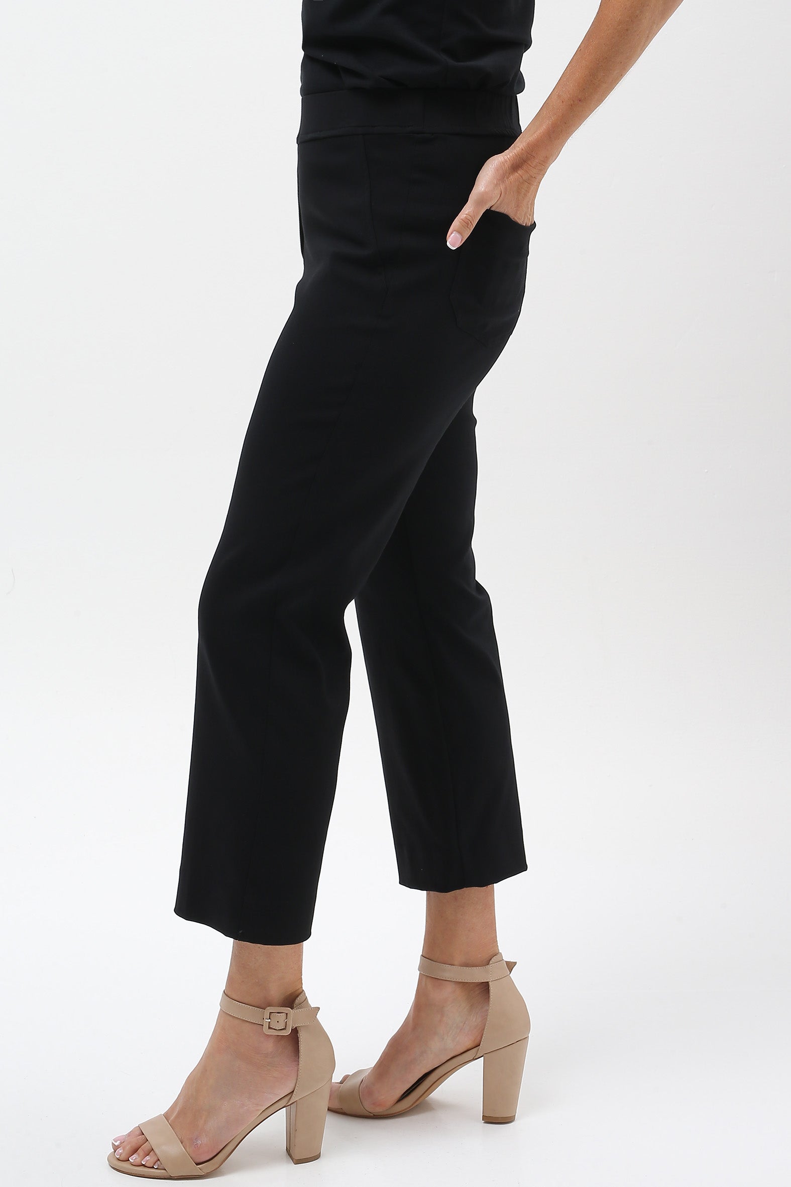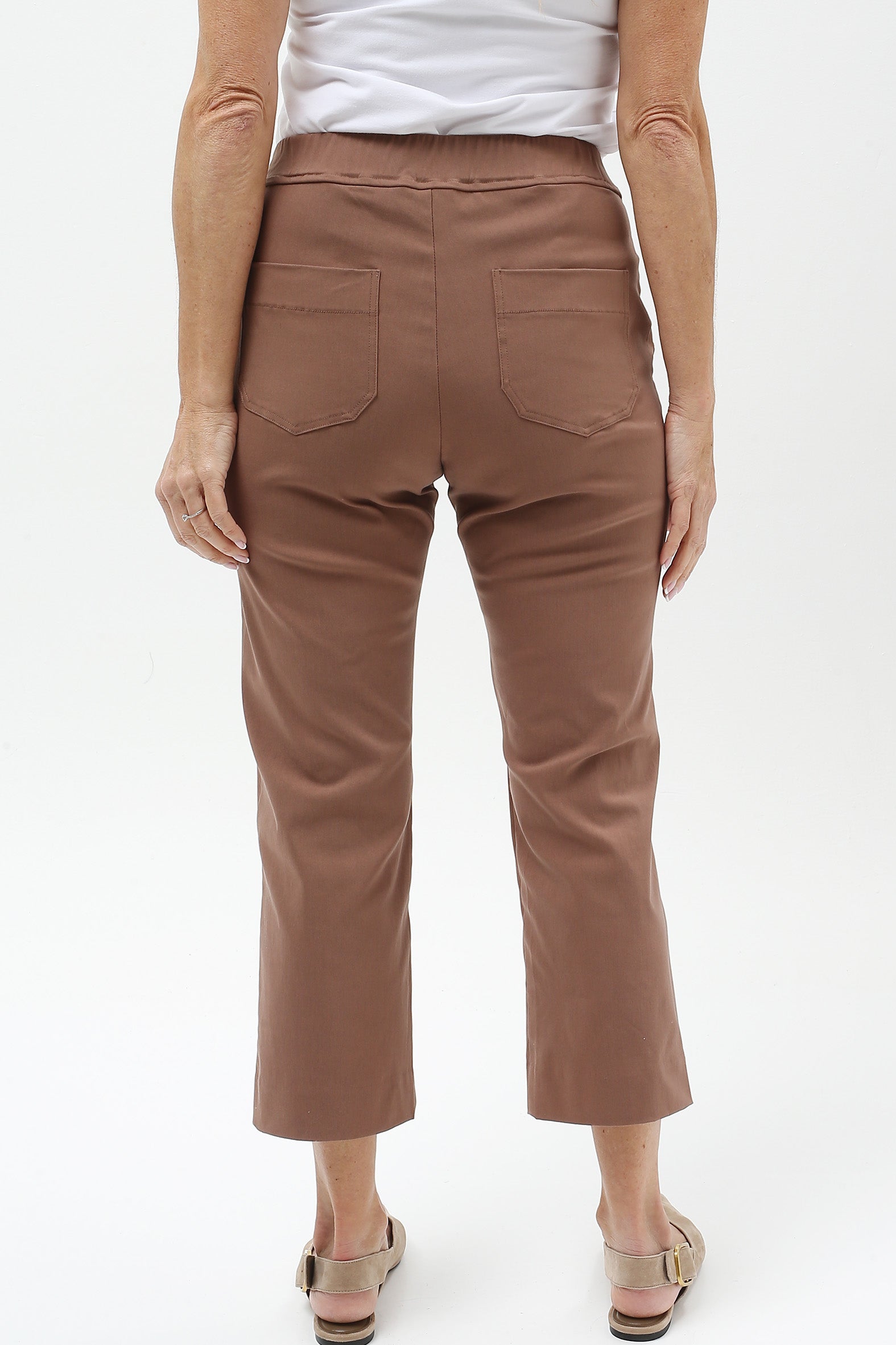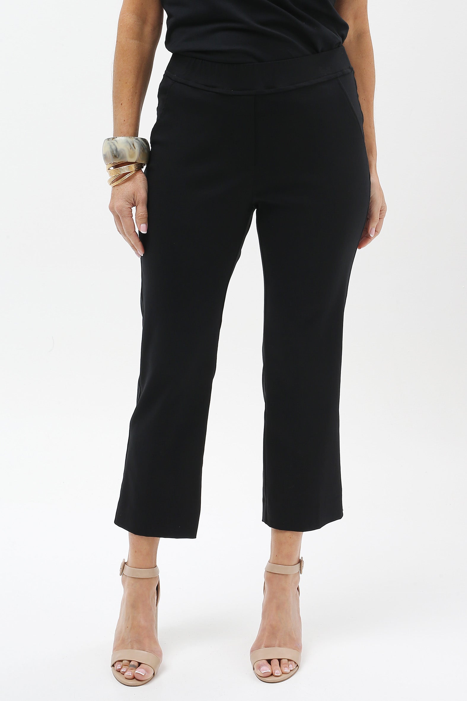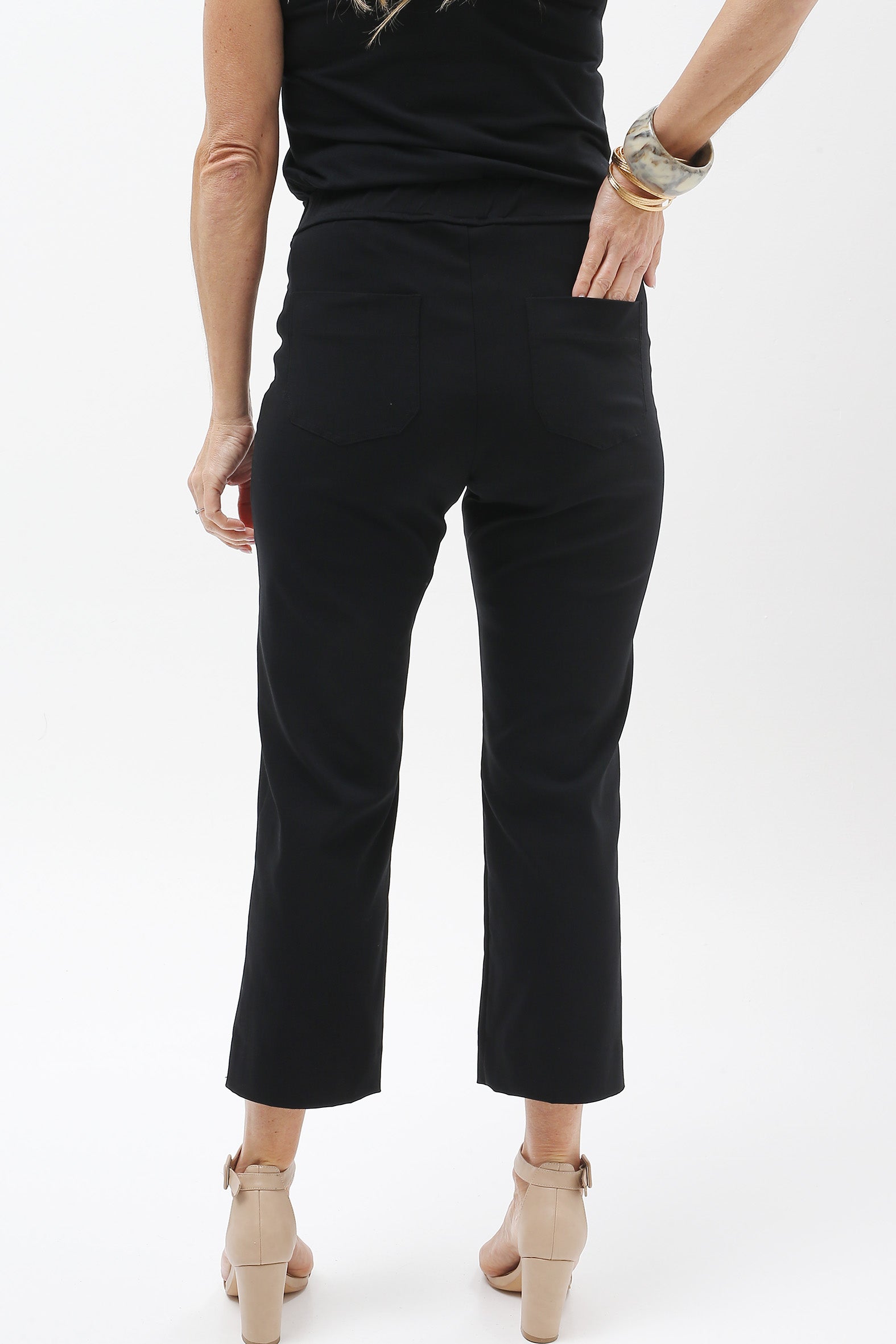 Streamlined style with everyday ease. These sleek cropped pants are designed to flatter and flex with your lifestyle. Crafted from a stretch bengaline blend of rayon, nylon, and elastane, they offer just the right balance of structure and softness. The elasticised waistband ensures a smooth pull-on fit, while a hidden tummy-flattening panel adds subtle support. With clean mock pocket detailing and practical back patch pockets, they’re perfect for dressing up or down—from weekday polish to weekend cool.