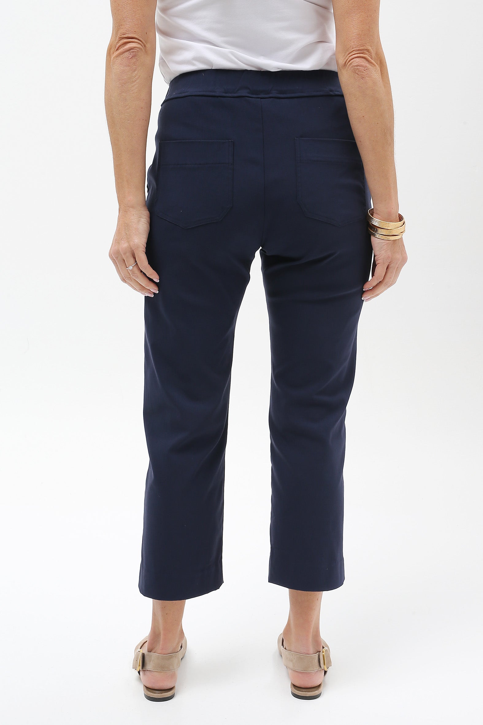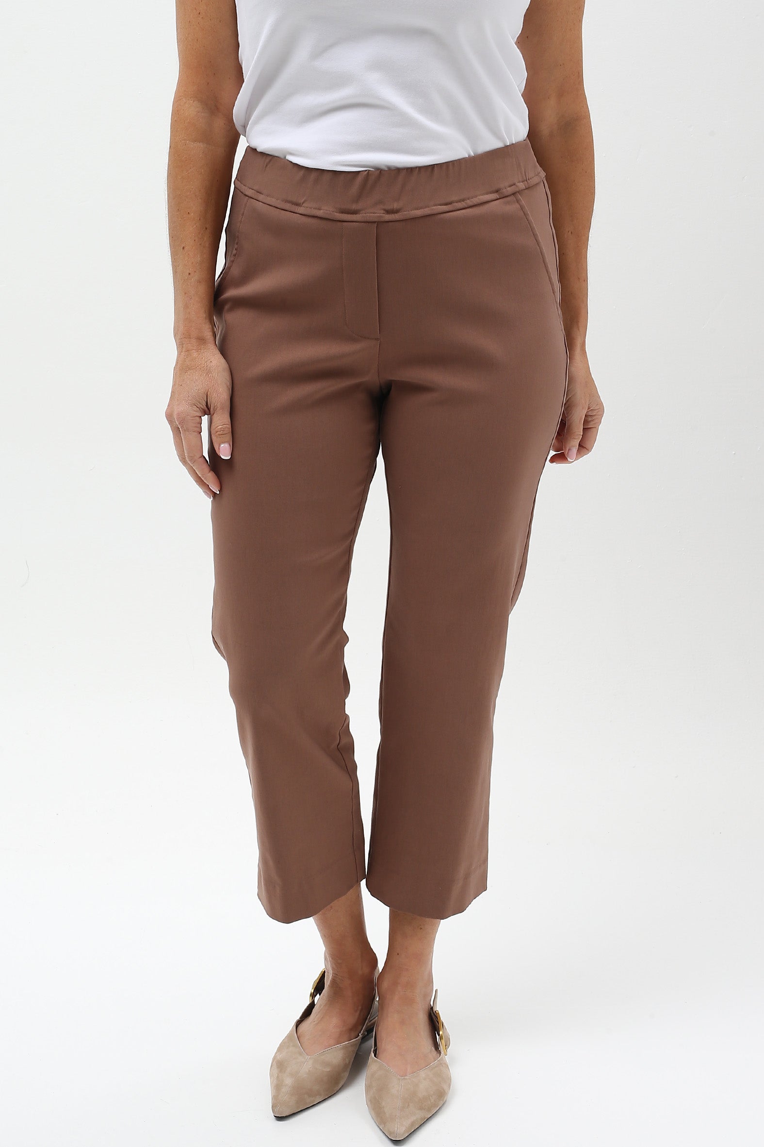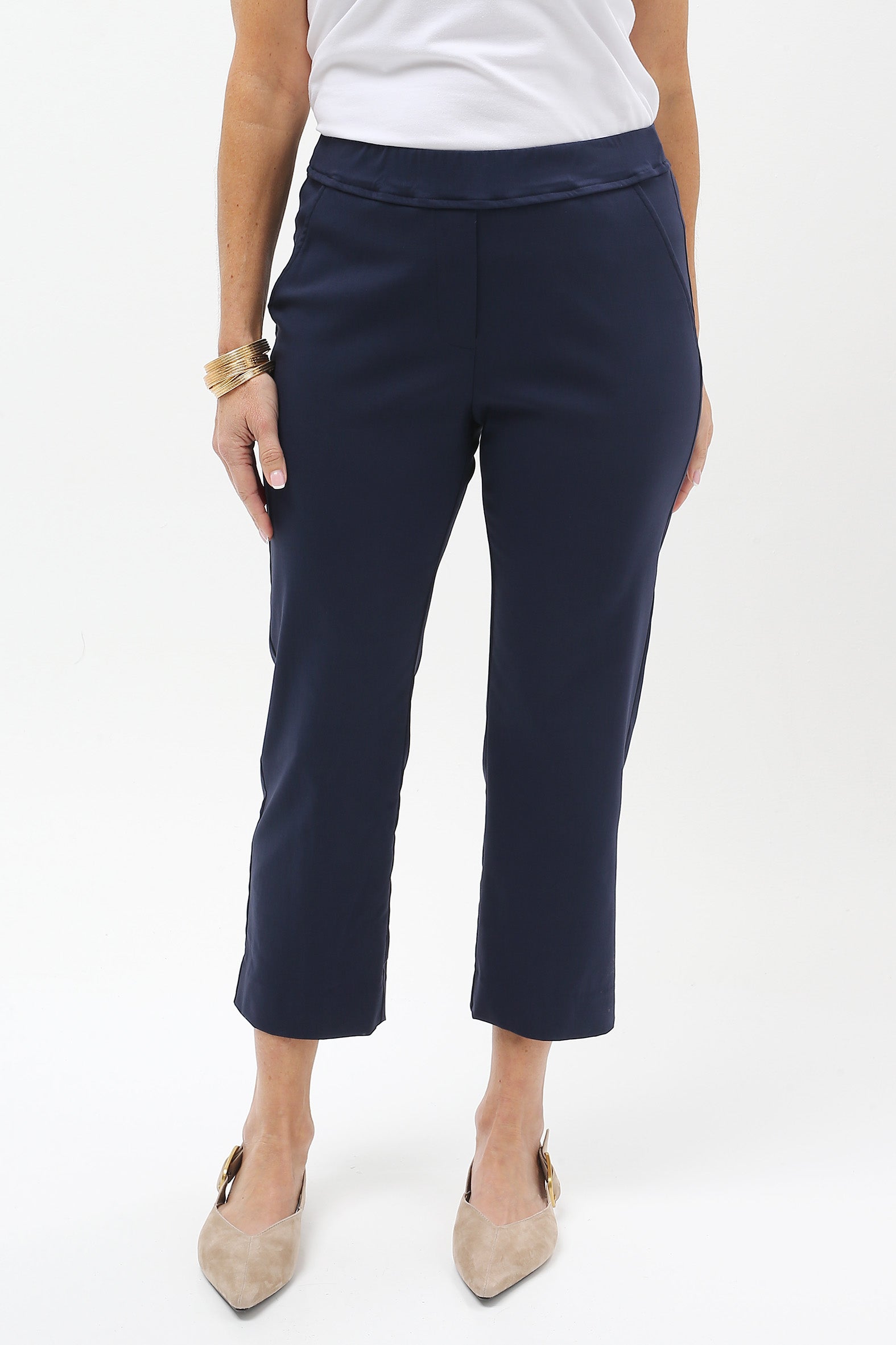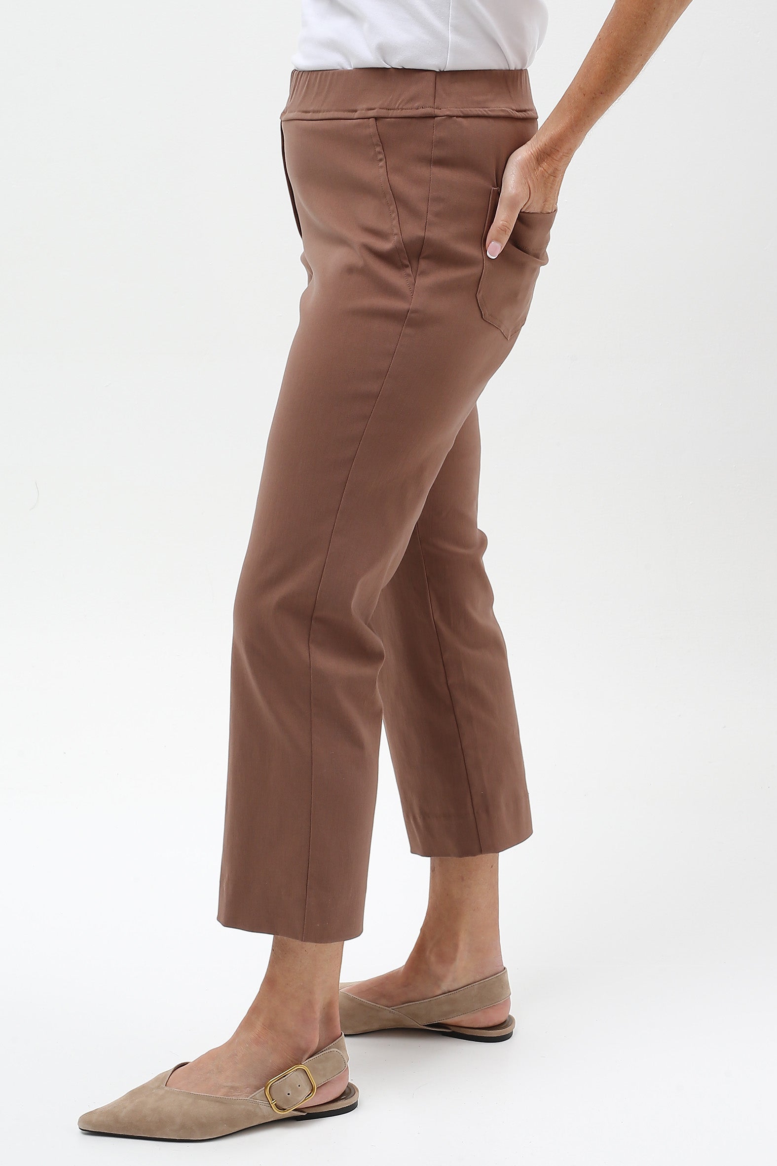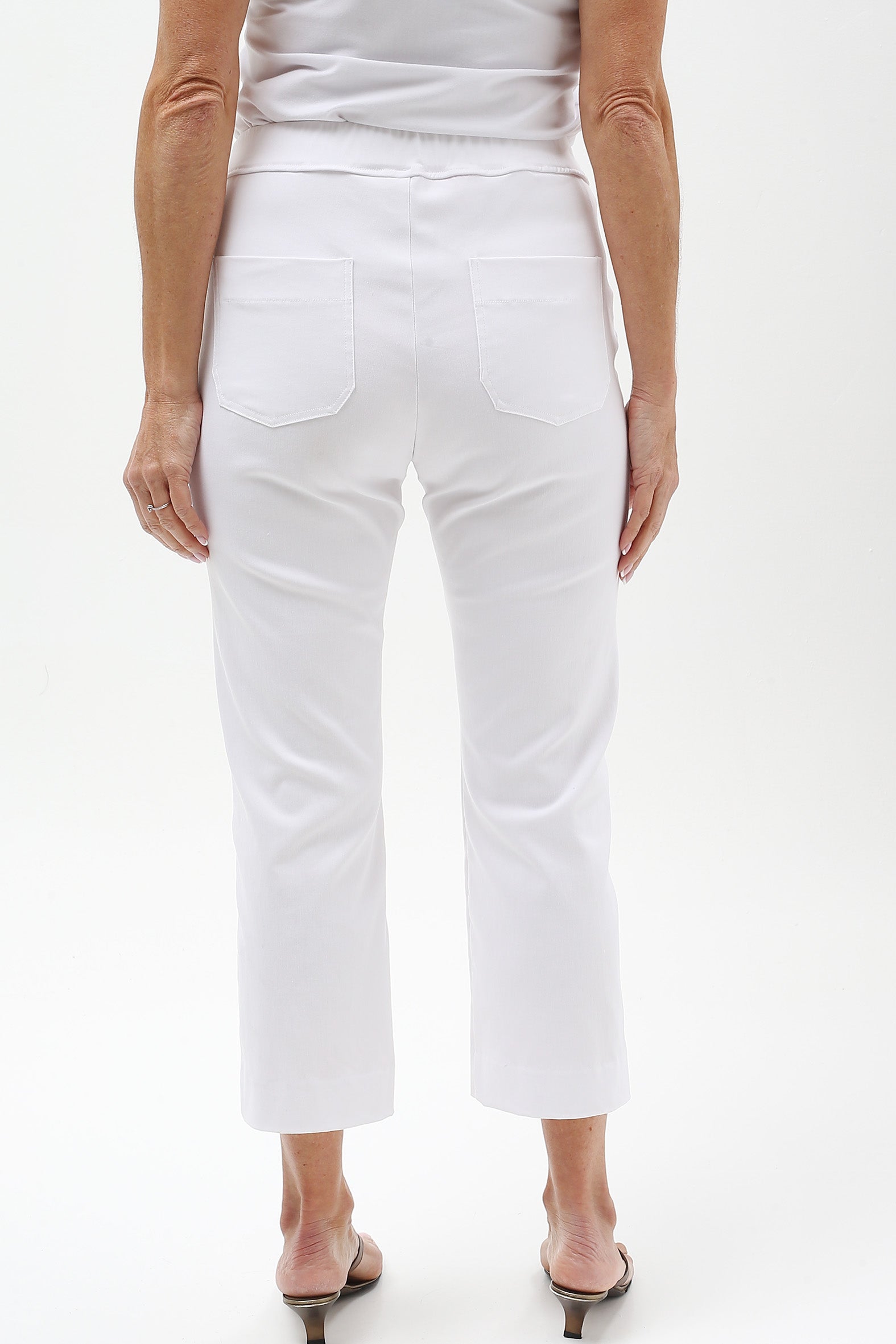 Streamlined style with everyday ease. These sleek cropped pants are designed to flatter and flex with your lifestyle. Crafted from a stretch bengaline blend of rayon, nylon, and elastane, they offer just the right balance of structure and softness. The elasticised waistband ensures a smooth pull-on fit, while a hidden tummy-flattening panel adds subtle support. With clean mock pocket detailing and practical back patch pockets, they’re perfect for dressing up or down—from weekday polish to weekend cool.