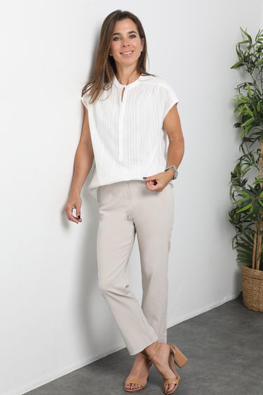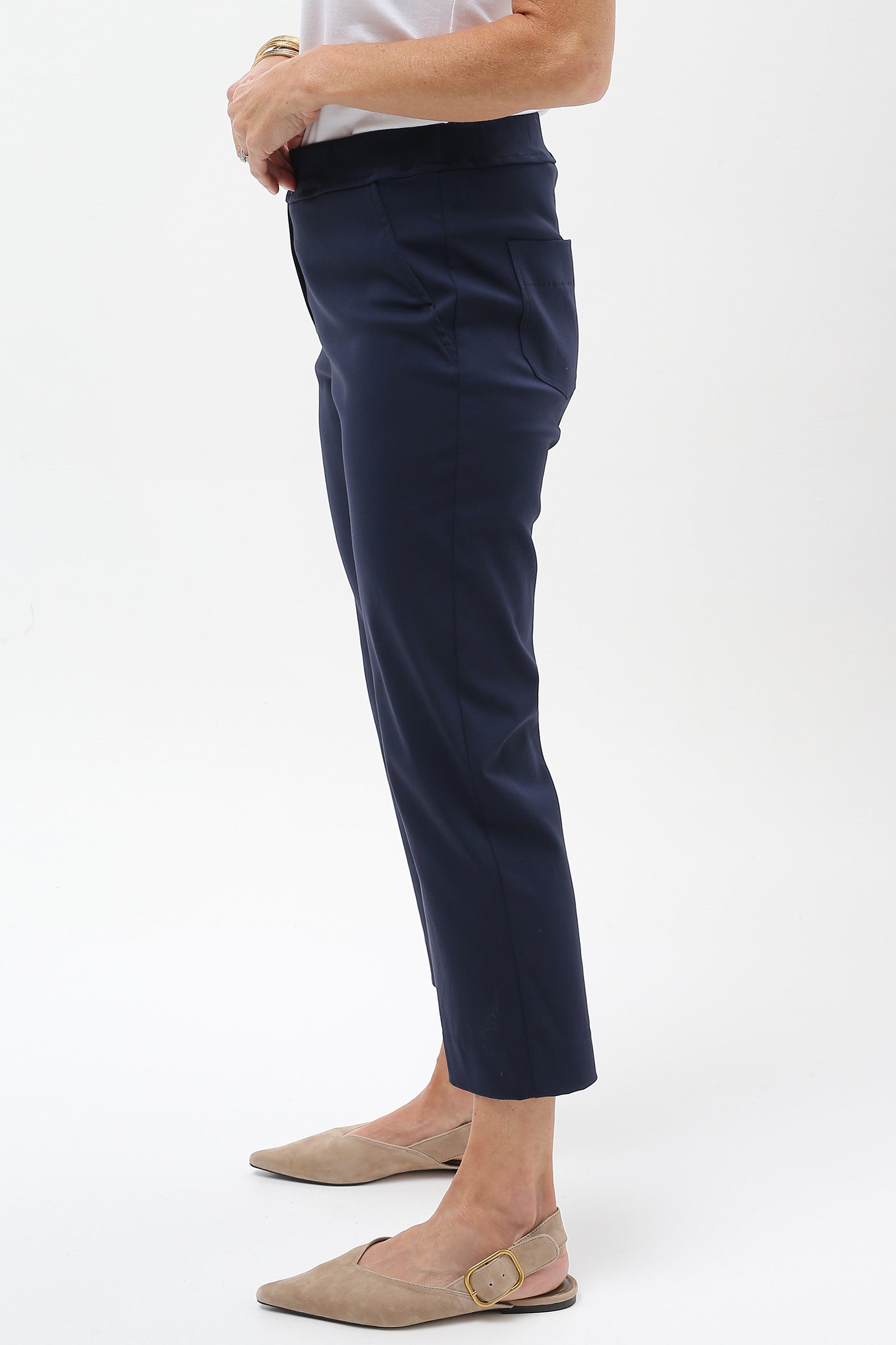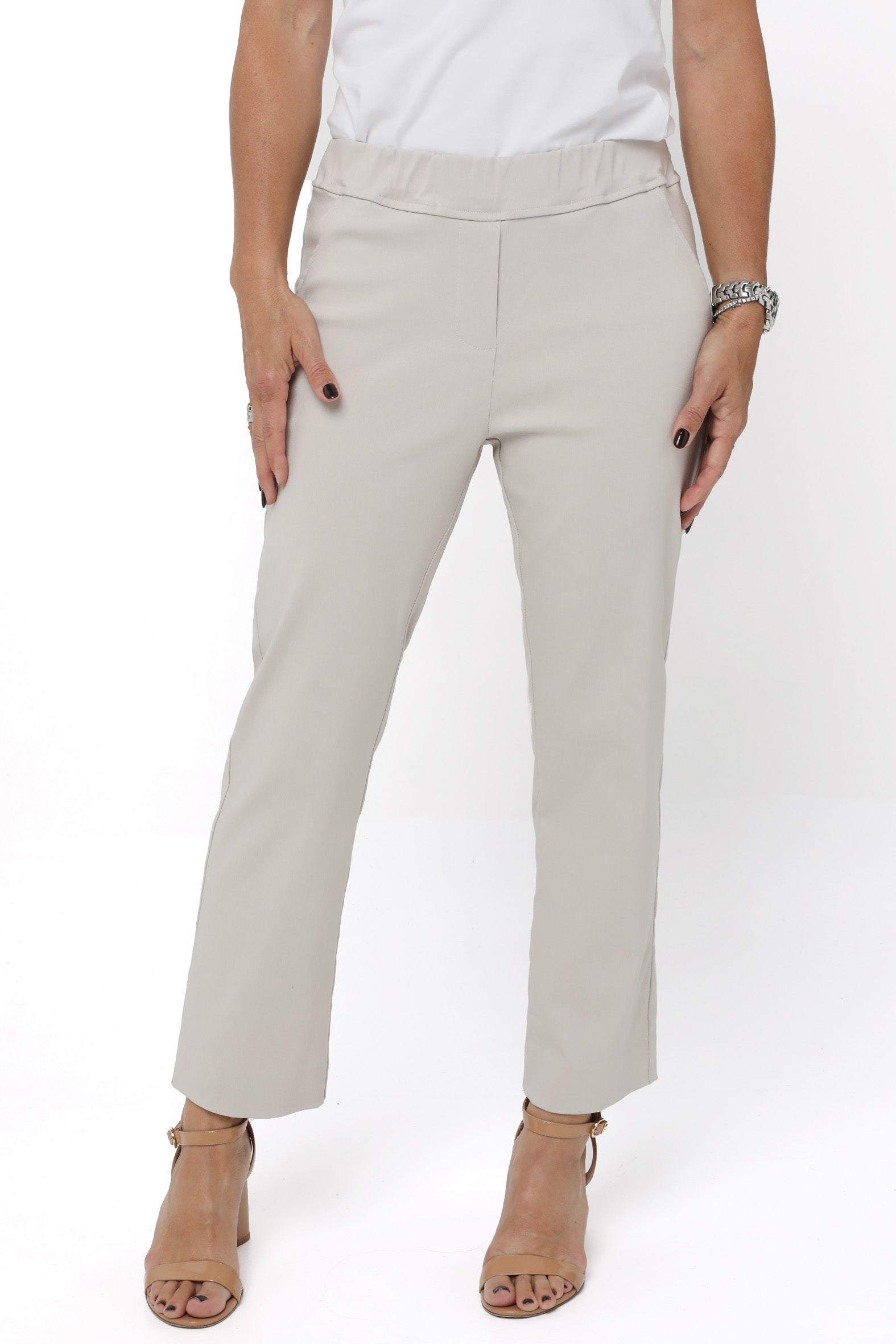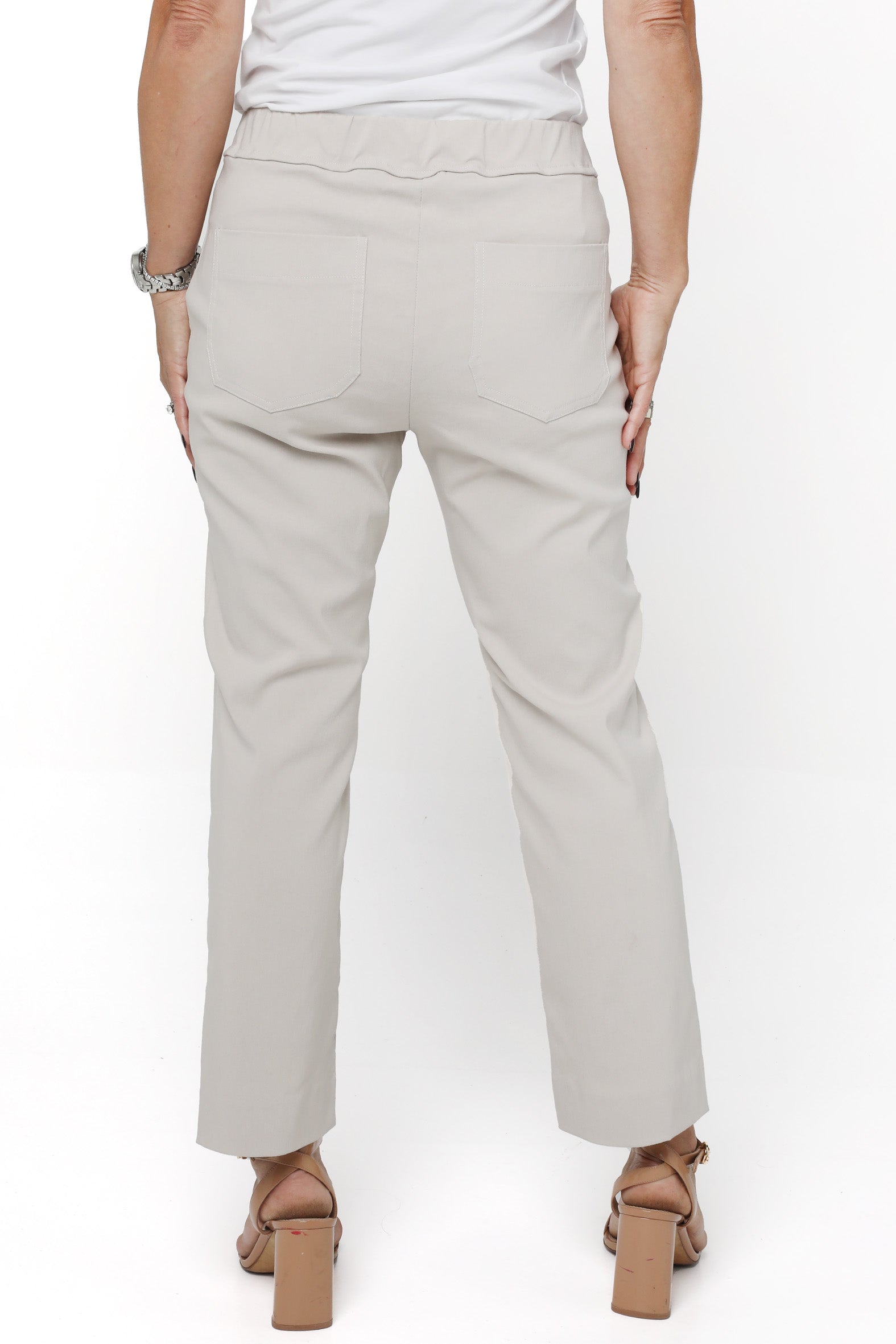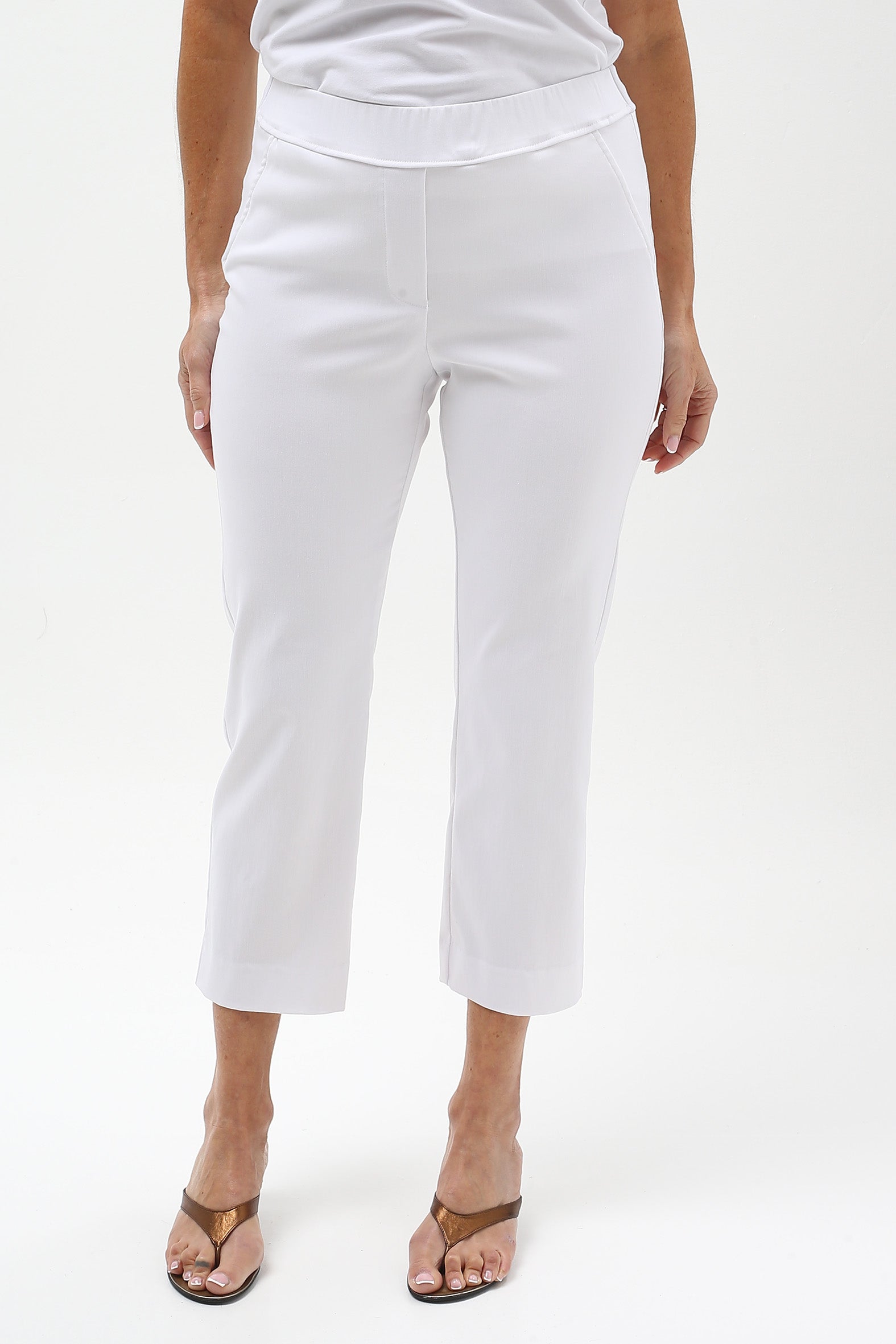 Streamlined style with everyday ease. These sleek cropped pants are designed to flatter and flex with your lifestyle. Crafted from a stretch bengaline blend of rayon, nylon, and elastane, they offer just the right balance of structure and softness. The elasticised waistband ensures a smooth pull-on fit, while a hidden tummy-flattening panel adds subtle support. With clean mock pocket detailing and practical back patch pockets, they’re perfect for dressing up or down—from weekday polish to weekend cool.
