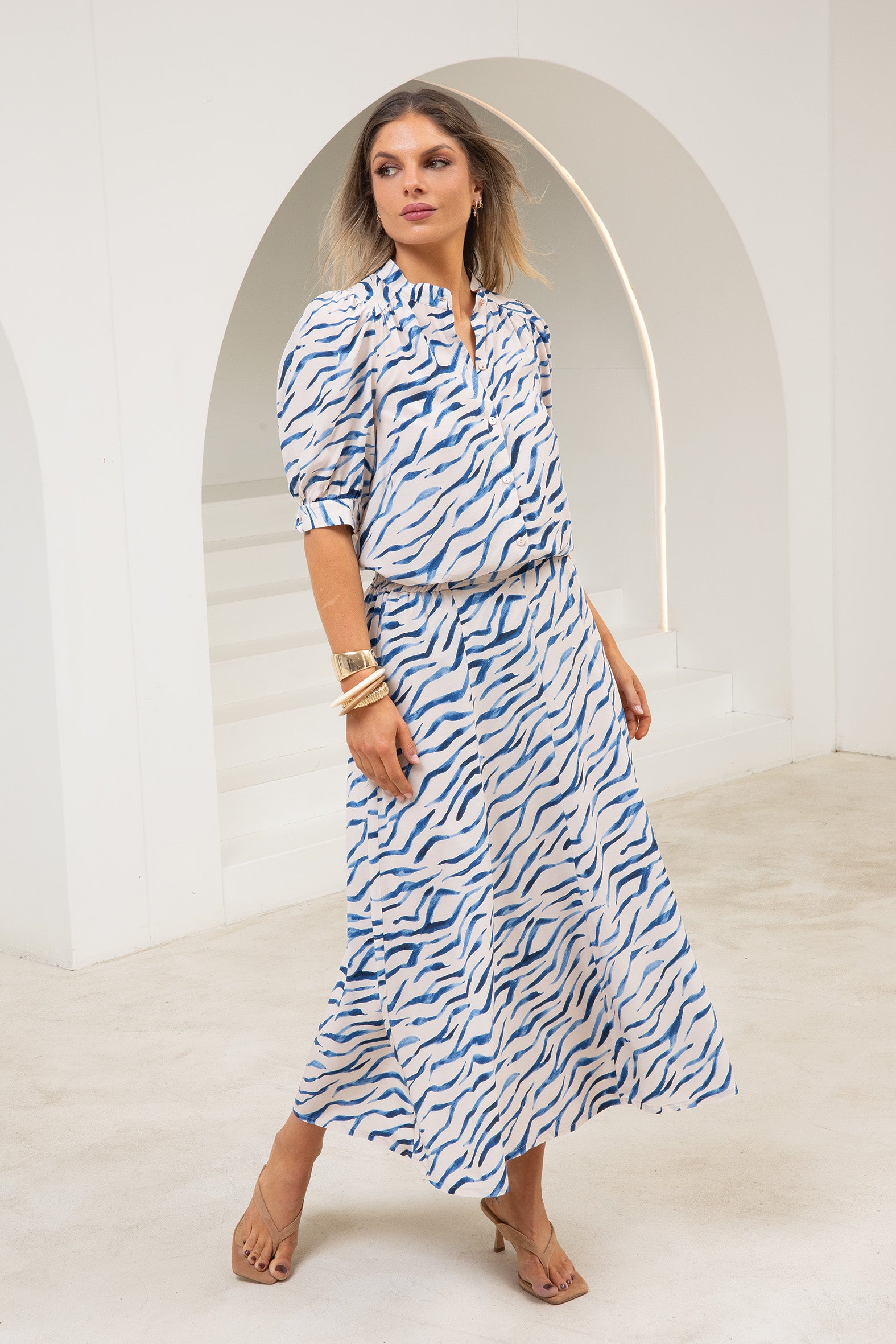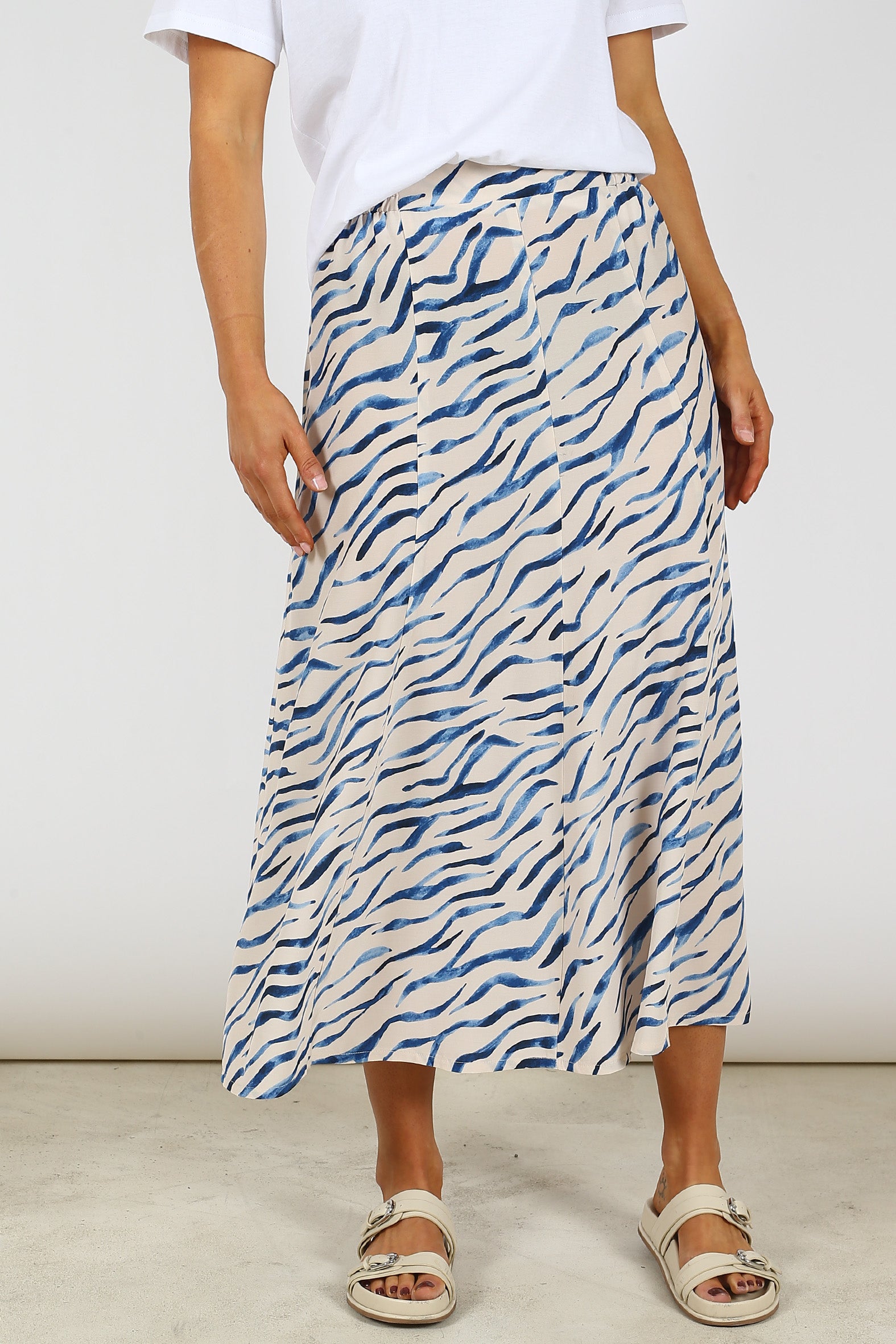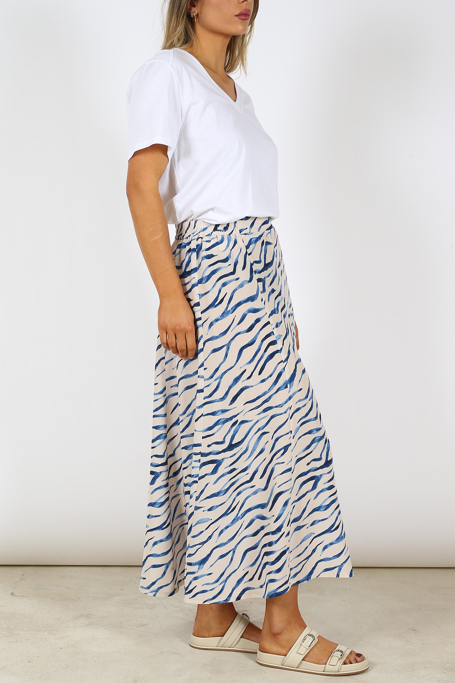 A graceful longer length skirt crafted from sustainable EcoVero rayon featuring an abstract print design in two striking colourways – rich tones of chocolate on a beige background and calming shades of blue against an ivory background. The partially elasticised waistband offers ease and comfort and a clean tailored look. Pair as a matching set with the Mirage Short Sleeve Blouse or coordinate with the Eco Soft tee for a more casual vibe.