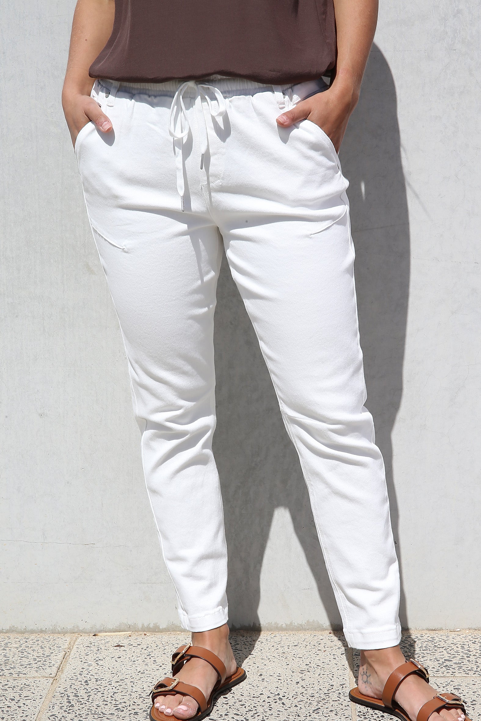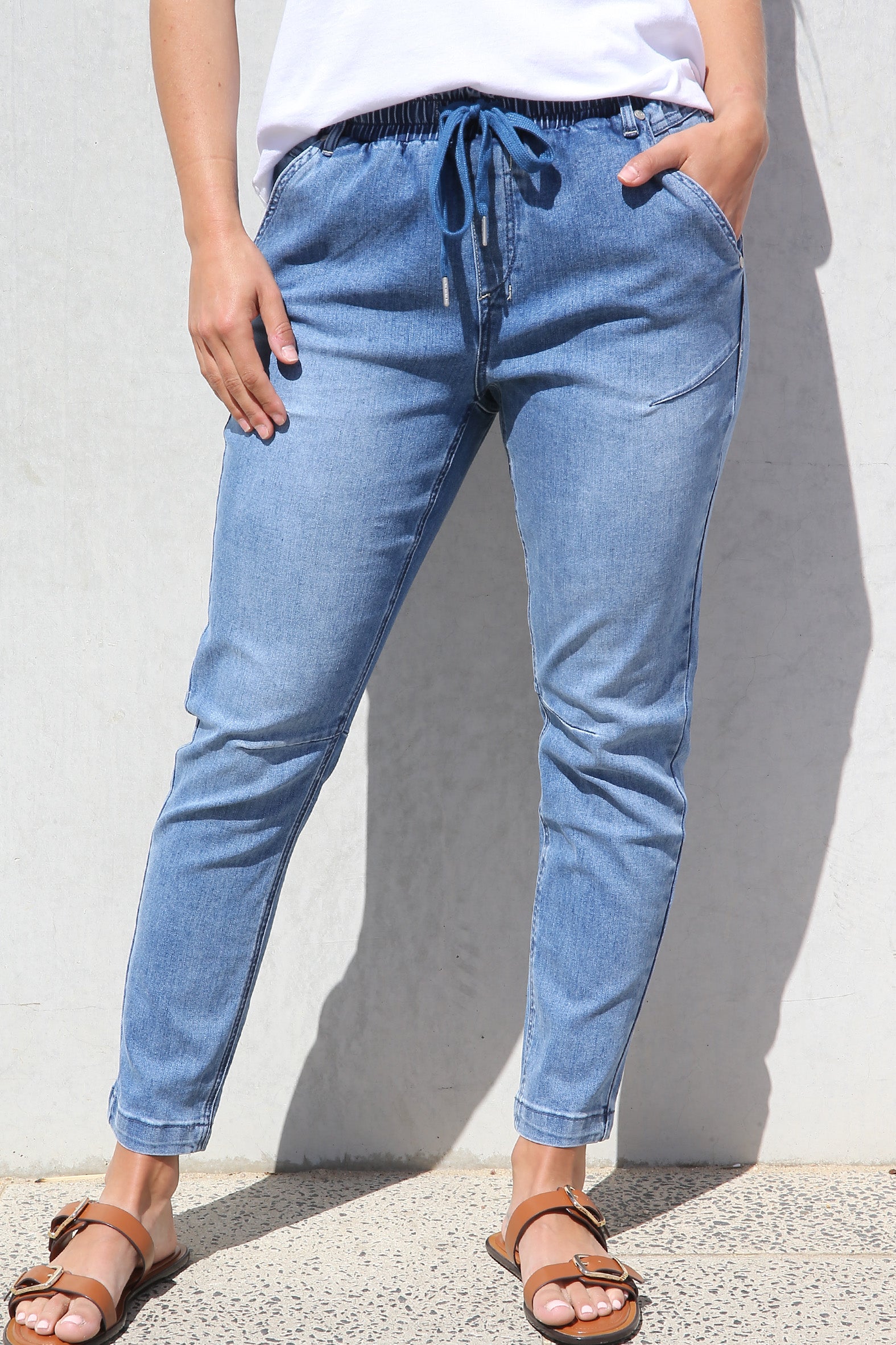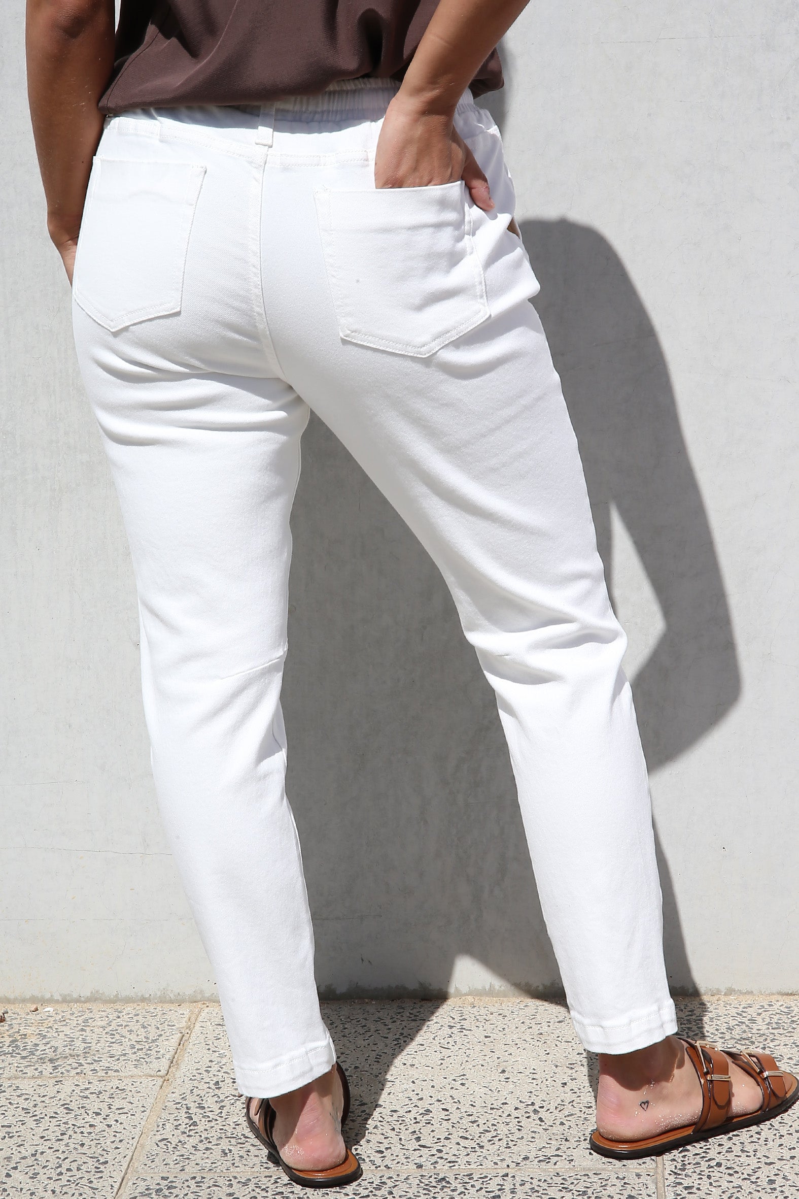Elevate your casual wardrobe and enjoy the all-day comfort and flattering silhouette of the Unwind Joggers. Featuring regular jeans detail and twin needle top stitching the joggers are relaxed at the hip and the leg shape tapers towards the ankle. Available in white and a mid-wash, mid weight denim the fabric is soft to the touch with super comfortable stretch making them perfect for so many occasions.