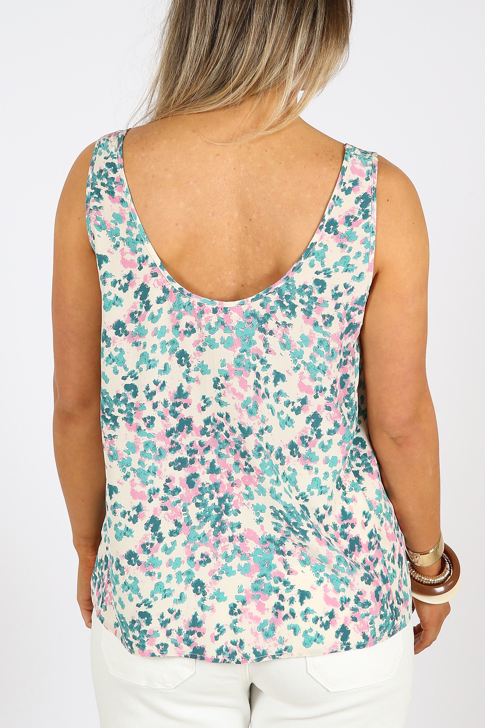 Elevate your warm weather wardrobe with this effortlessly feminine sleeveless tank crafted from silky and sustainable EcoVero rayon. Featuring a subtle print in shades of aqua and pink on an ivory background. The scooped neckline at both back and front adds a touch of elegance while the side panels provide a contoured fit. Perfect for wearing out or tucking in and layering under jackets and cardigans. Pair it with the Willow slip skirt for a matching set or wear it with coordinating pants, jeans or skirts.