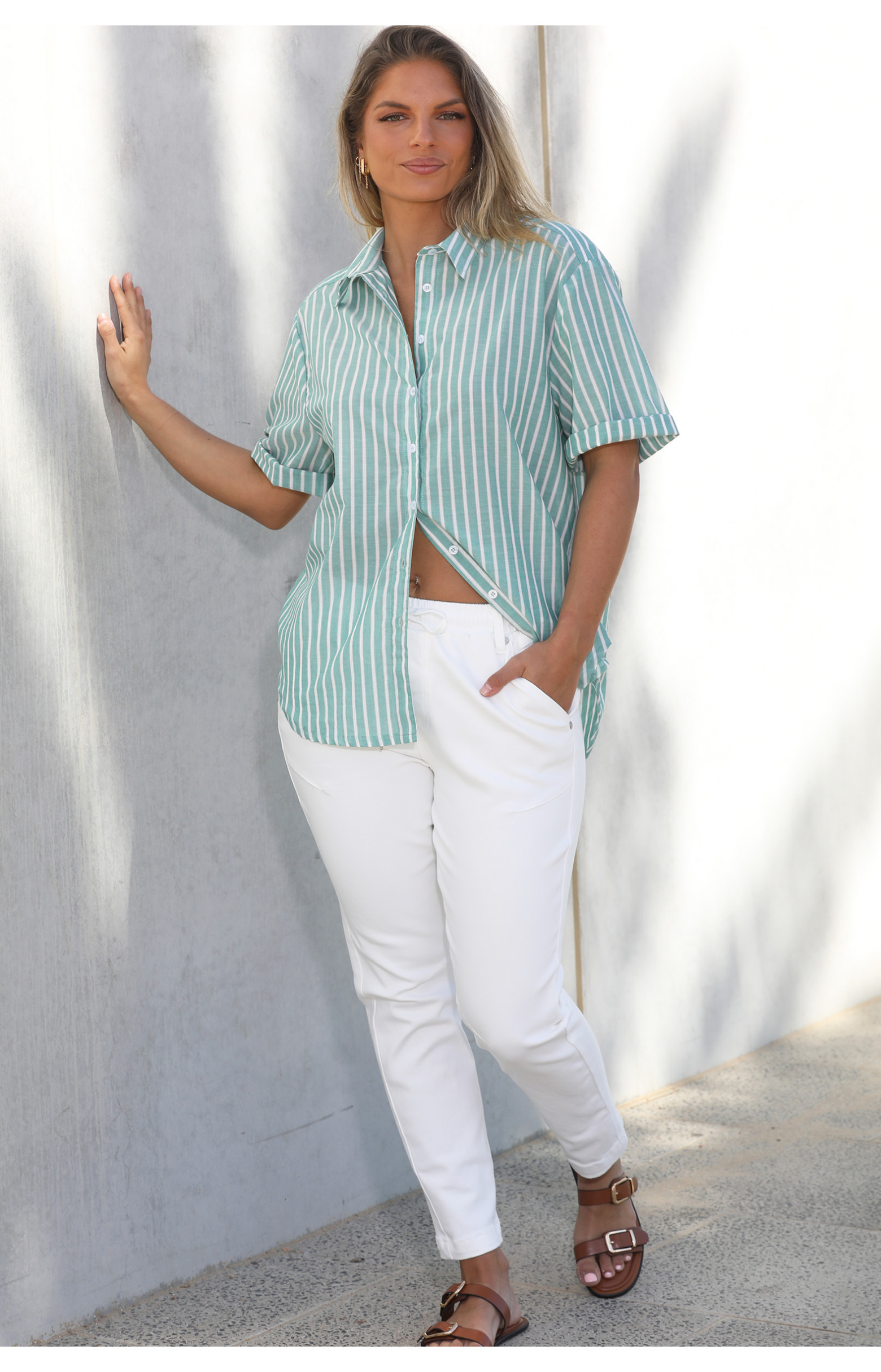 Elevate your casual wardrobe and enjoy the all-day comfort and flattering silhouette of the Unwind Joggers. Designed in a relaxed, comfortable fit they feature a fully elasticised waistband with a functional draw cord and angled front pockets at the hip which are enhanced with nickel rivets. Featuring regular jeans detail and twin needle top stitching the joggers are relaxed at the hip and the leg shape tapers towards the ankle. Available in white and a mid-wash, mid weight denim the fabric is soft to the touch with super comfortable stretch making them perfect for so many occasions.