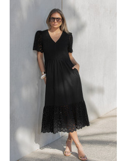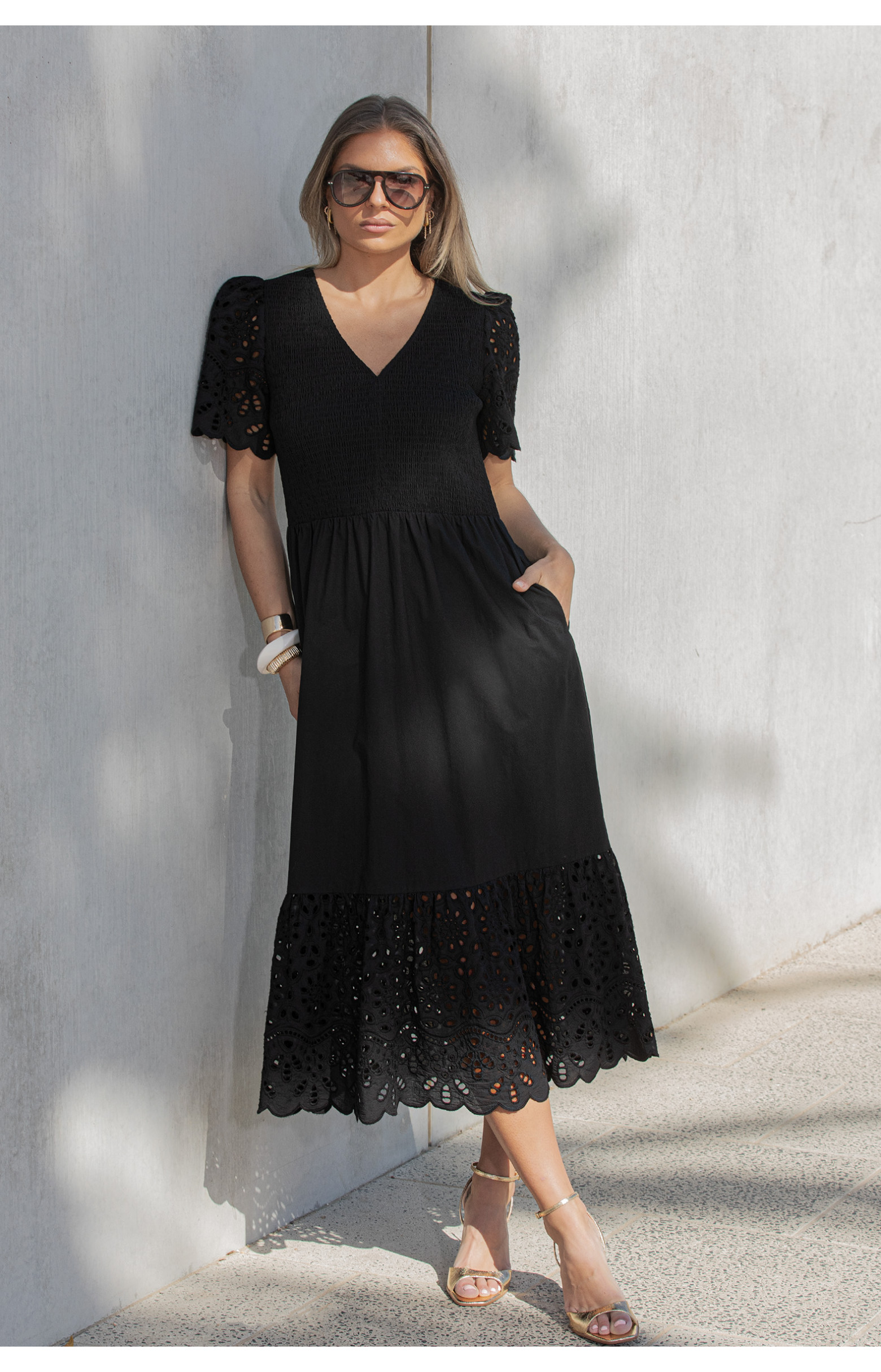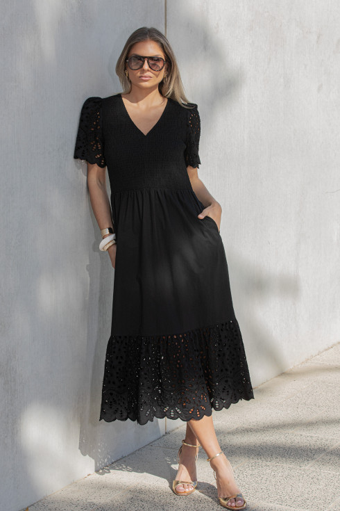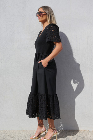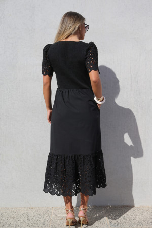 Effortlessly feminine and beautifully detailed, this black cotton maxi dress features a V shape neckline and a flattering shirred bodice that enhances both comfort and elegance. The short blouson sleeves feature delicate cut-out embroidery, scalloped hems and soft gathers at each shoulder that add gentle volume and a romantic touch. A standout deep frill at the hemline showcases the same cut-out embroidery detail as the sleeves, creating elegant movement and feminine charm. Crafted from breathable cotton, this timeless dress is perfect for warm weather occasions and dressed up evenings.