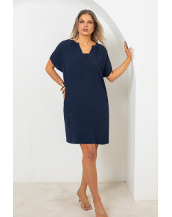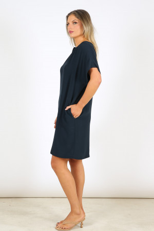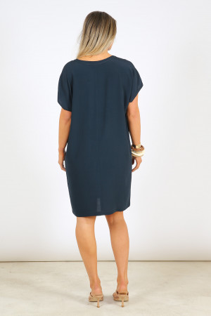 Effortlessly elegant, this knee length shift dress is crafted from a woven 100% rayon fabric with a silky handle and soft drape. The design features an extended shoulder line, while a top stitched V shape neckline, from a structured collar stand, adds definition and polish. Side seam pockets at the hip are top stitched, ensuring a smooth flattering line without adding bulk. Ideal for both casual wear and elevated occasions, this dress blends comfort with refined detail.