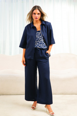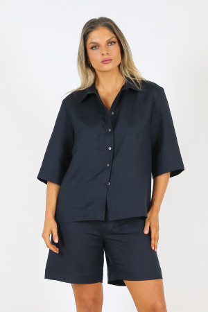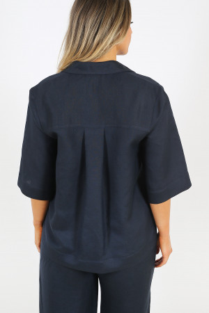 This stylish button-through shirt is crafted from a breathable woven blend of linen and rayon, combining natural texture with fluid drape. Designed with a refined two-piece shirt collar and a structured double layer yoke at the shoulder, it features a box pleat beneath the yoke for ease and movement. The silhouette is finished with a straight hem and elbow length sleeves, both detailed with deep, cleanly finished hemlines that lend weight and subtle structure. A versatile piece that that balances tailored lines with relaxed comfort, wear it as a matching set with Naturalist Wide Leg pants or shorts or coordinate with other items in the range. Worn open jacket style, or buttoned through as a shirt it is ideal for elevated everyday wear.